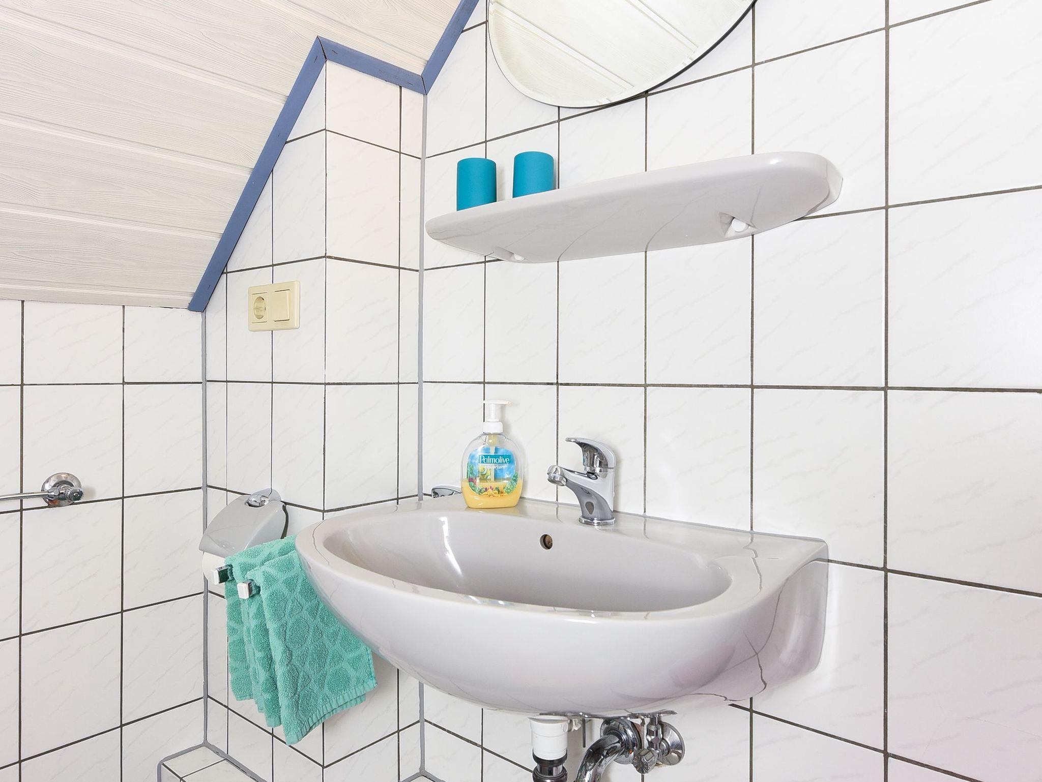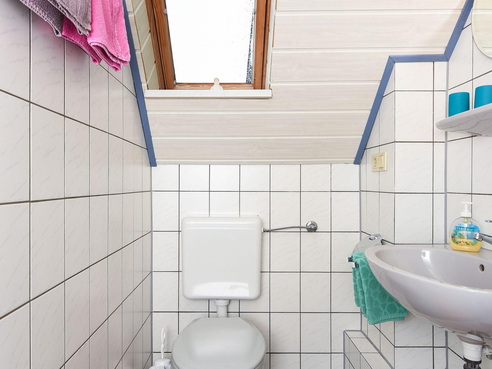 Waschtisch und WC, Obergeschoss, Terrasse, optimal für 1 bis 2 Personen.