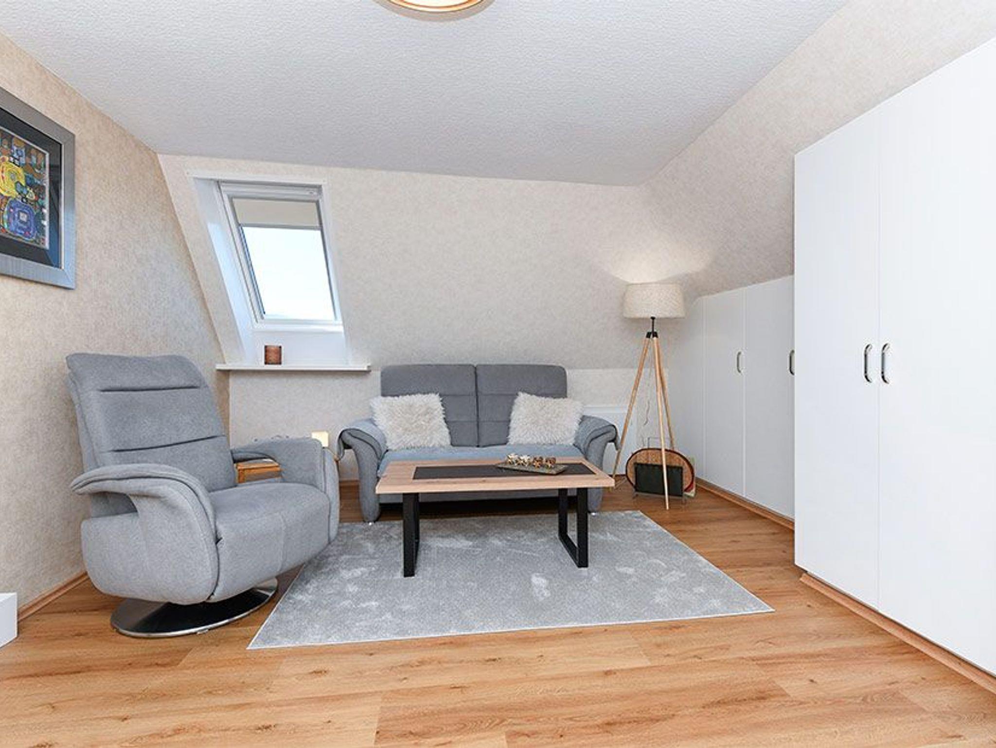 Größe ca. 70 Quadratmeter, Wohnzimmer, Galerie, Küche, Schlafzimmer, zweites separates Schlafzimmer/Kinderzimmer, Badezimmer mit Dusche, Waschtisch und WC, separates zweites WC, Obergeschoss, Balkon, Koffer-/Abstellraum, optimal für 1 bis 3 Personen.