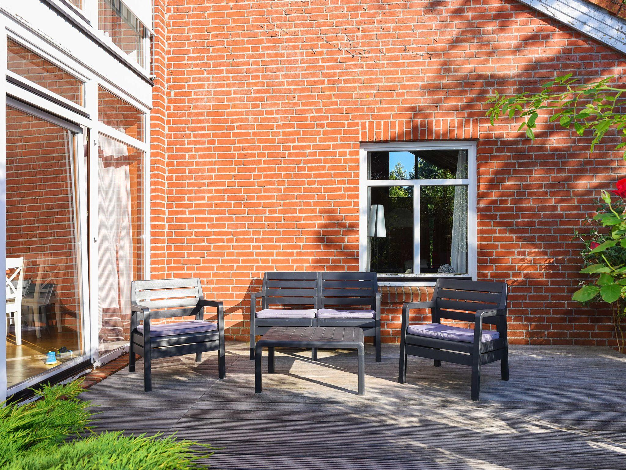 zwei Holzterrassen mit Gartenmöbeln (eine mit Frühstücks- und eine mit Abendsonne)