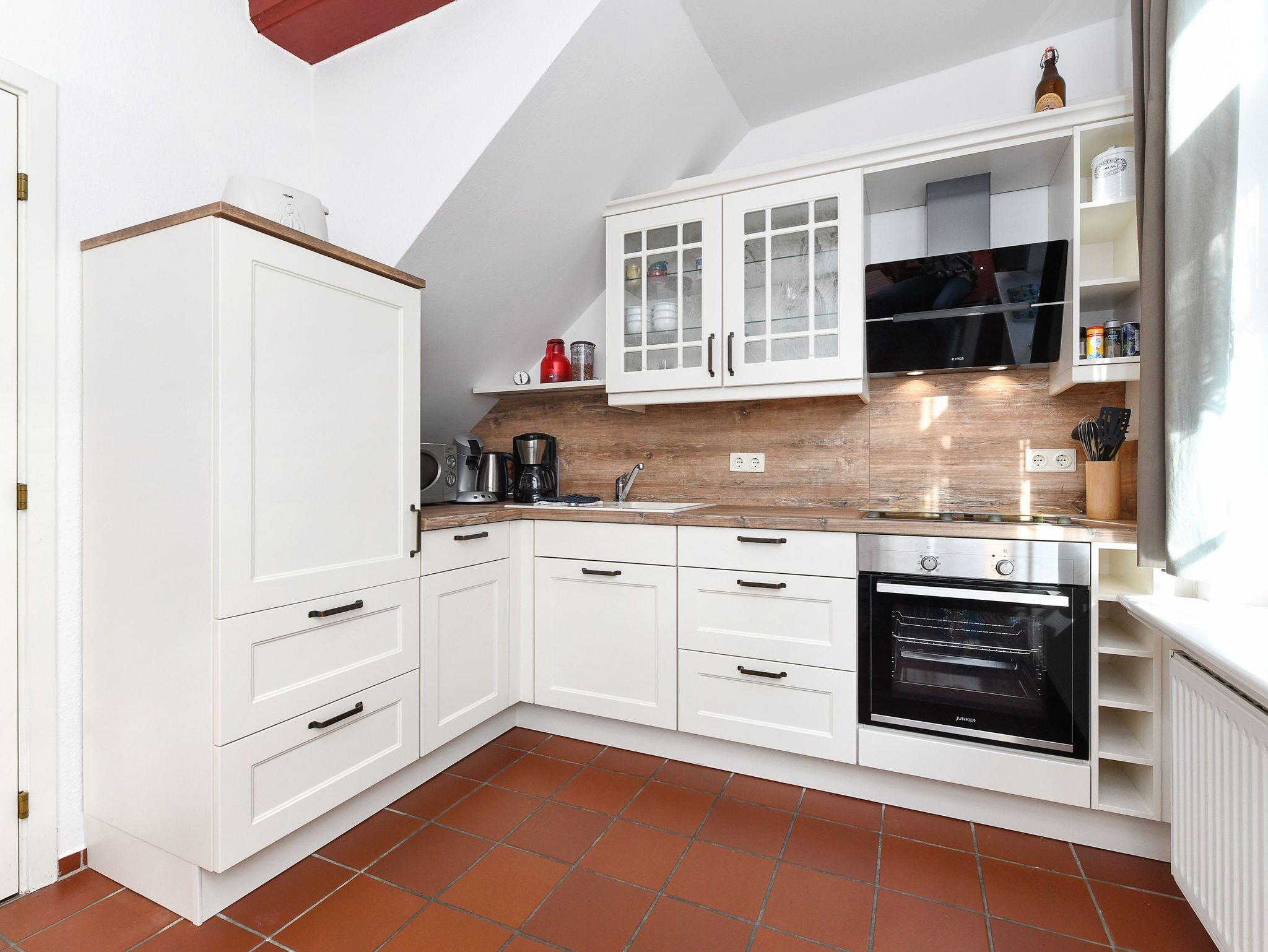 Die Ferienwohnungen sind geschmackvoll, hell und freundlich eingerichtet und technisch hochwertig ausgestattet. So gibt es zum Beispiel eine umfassend ausgestattete Küche und eine schöne Holzterrasse an der Wohnung „Kajüte“.