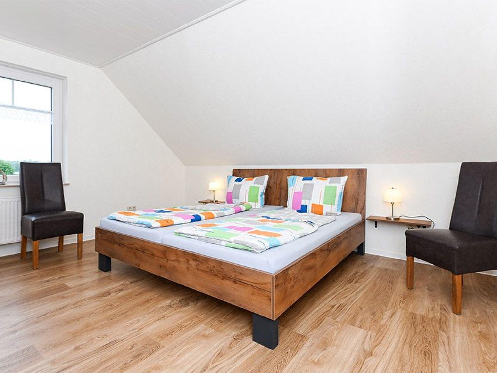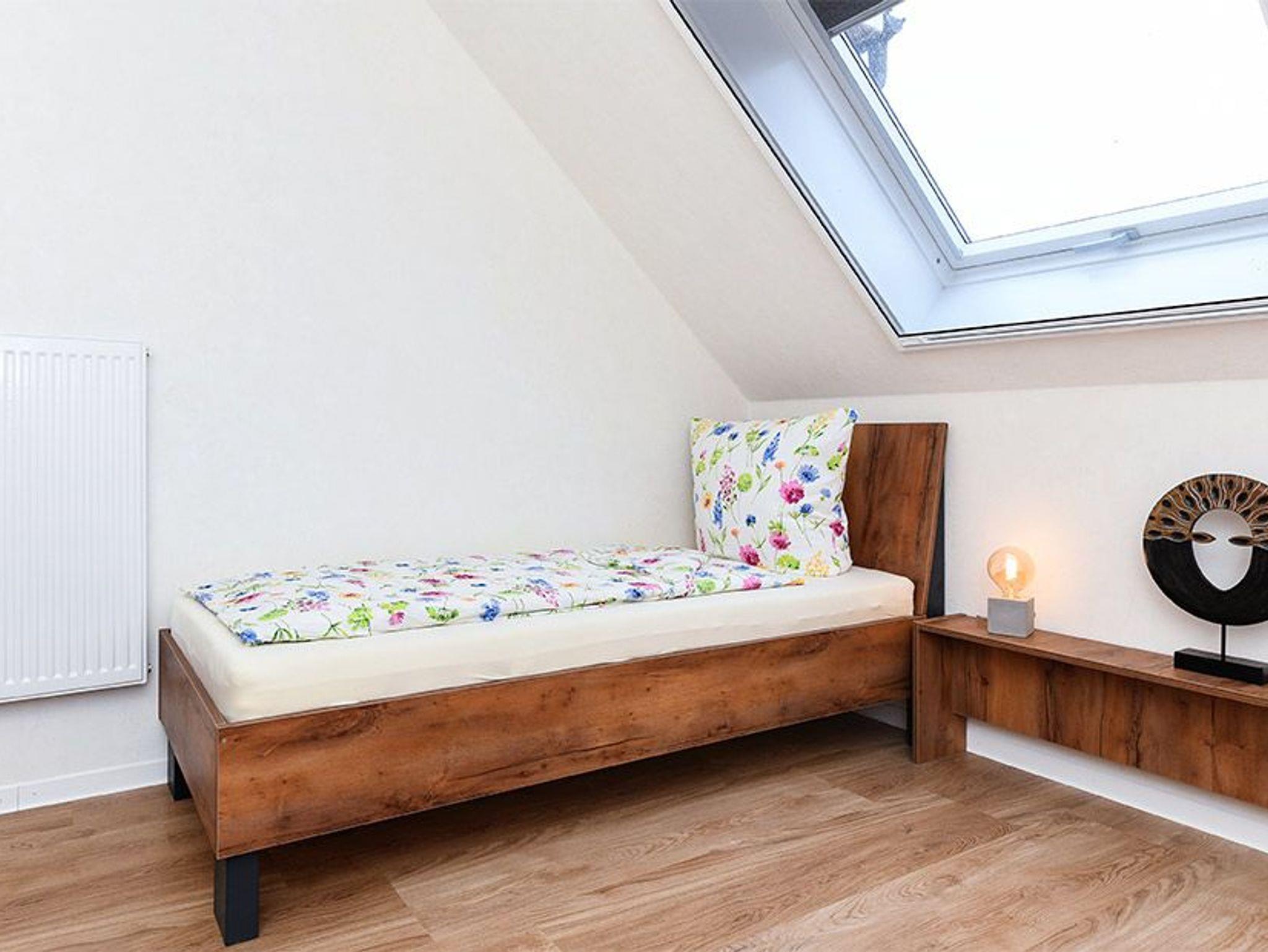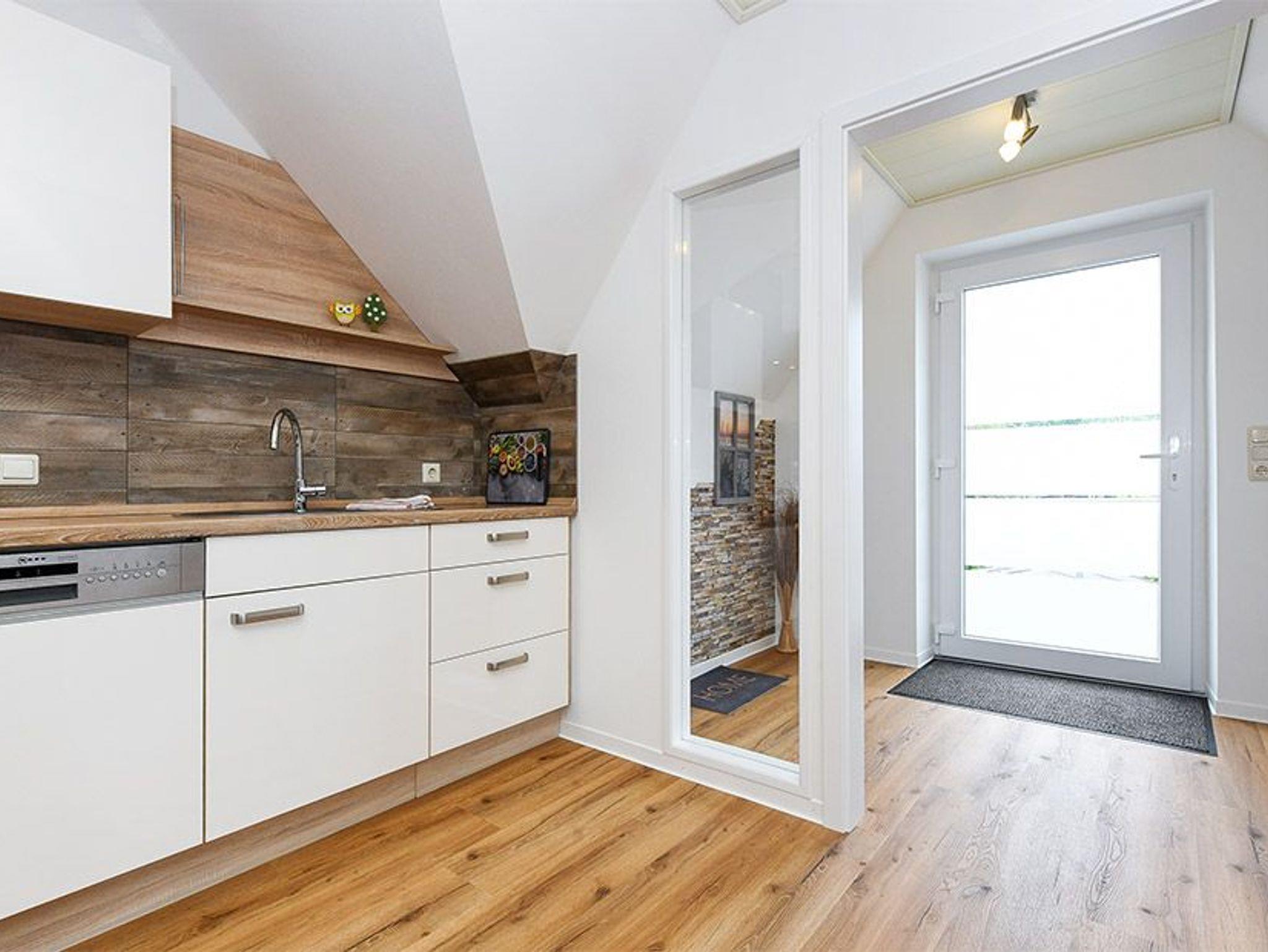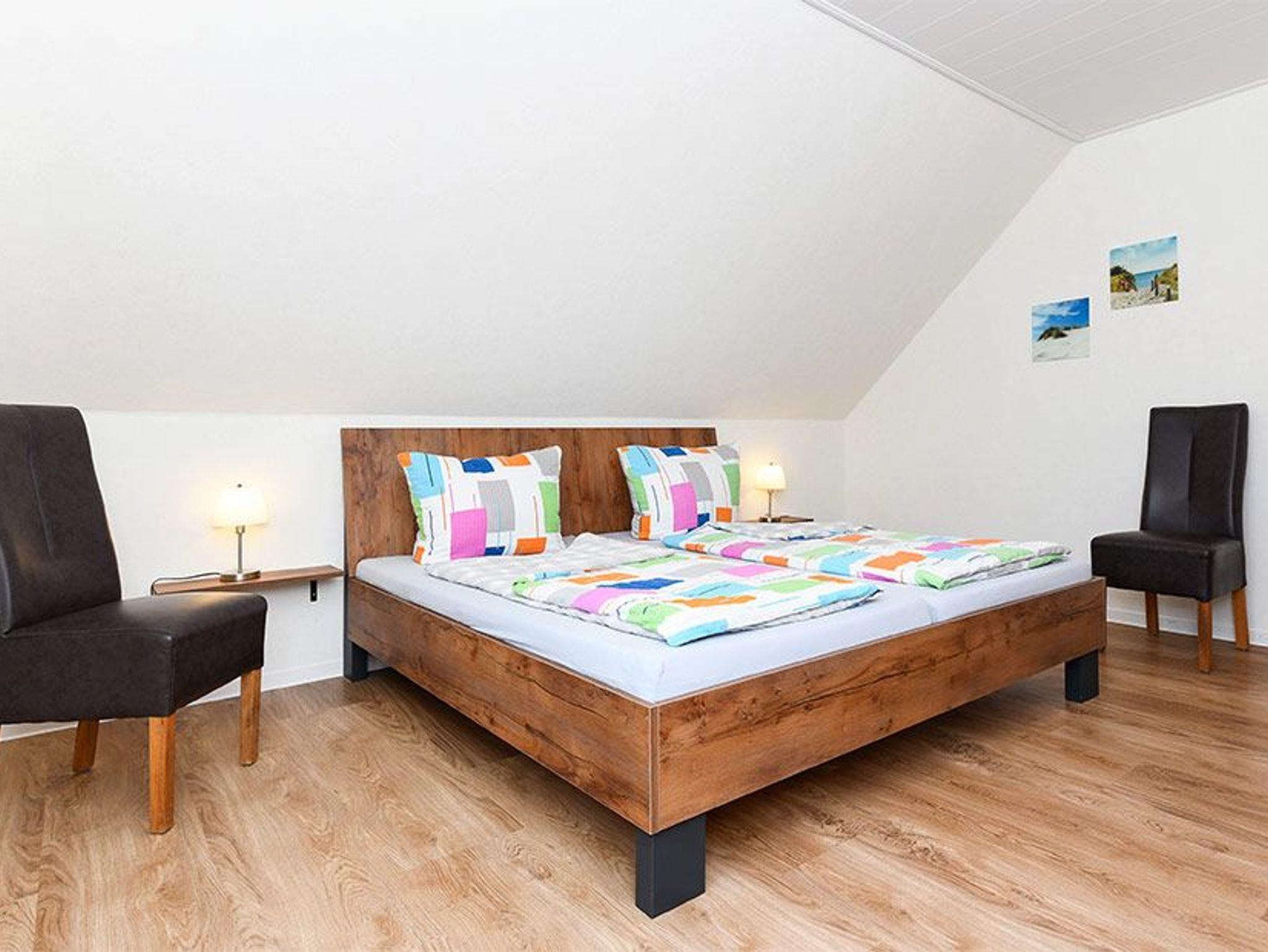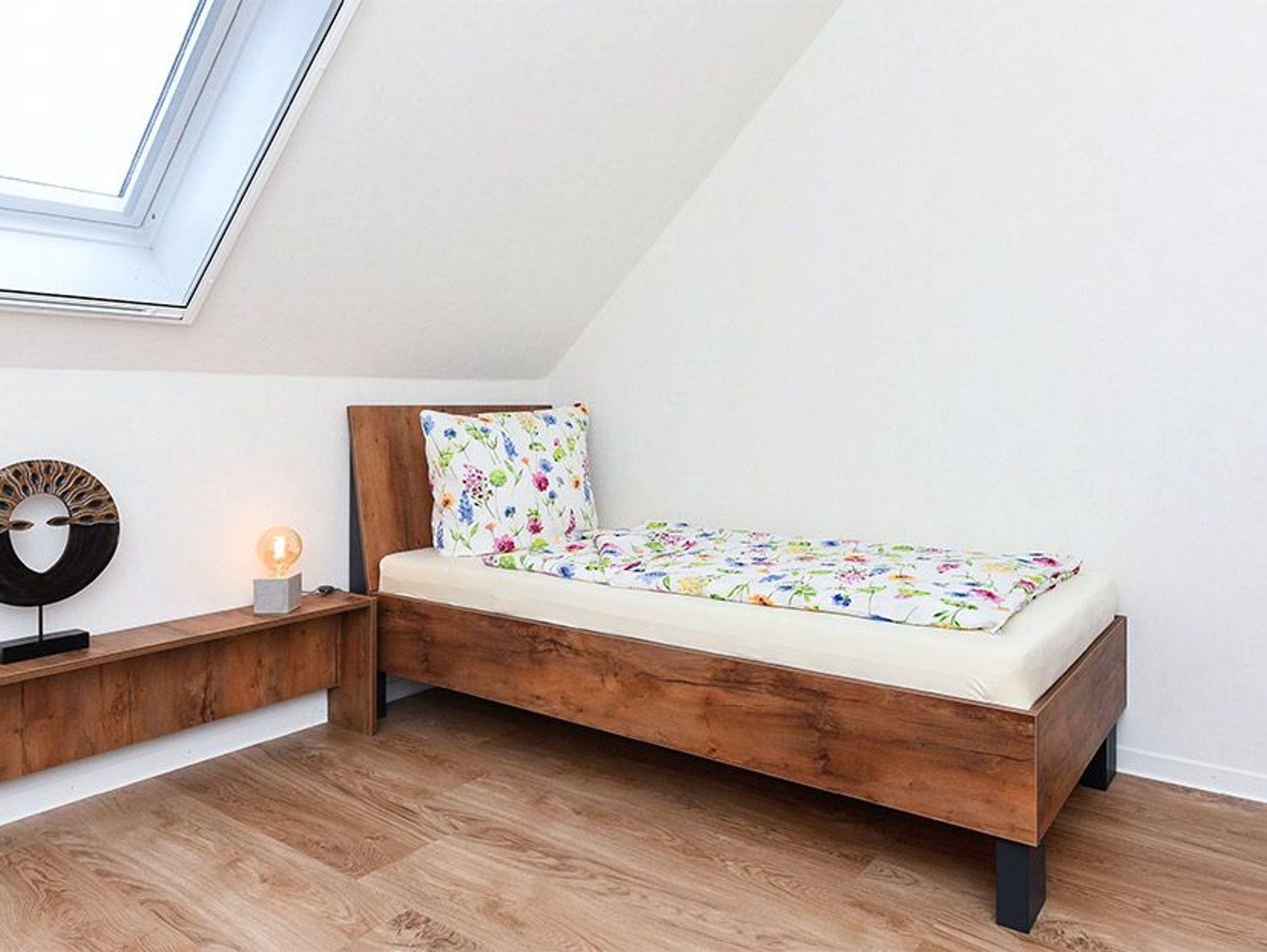 Größe ca. 65 Quadratmeter, Wohnzimmer mit integrierter Küche, Schlafzimmer, zweites separates Schlafzimmer/Kinderzimmer, Badezimmer mit Doppel-Waschbecken, Dusche und WC, Obergeschoss, optimal für 2 bis 4 Personen, seperater Fahrradschuppen zum abschließen.