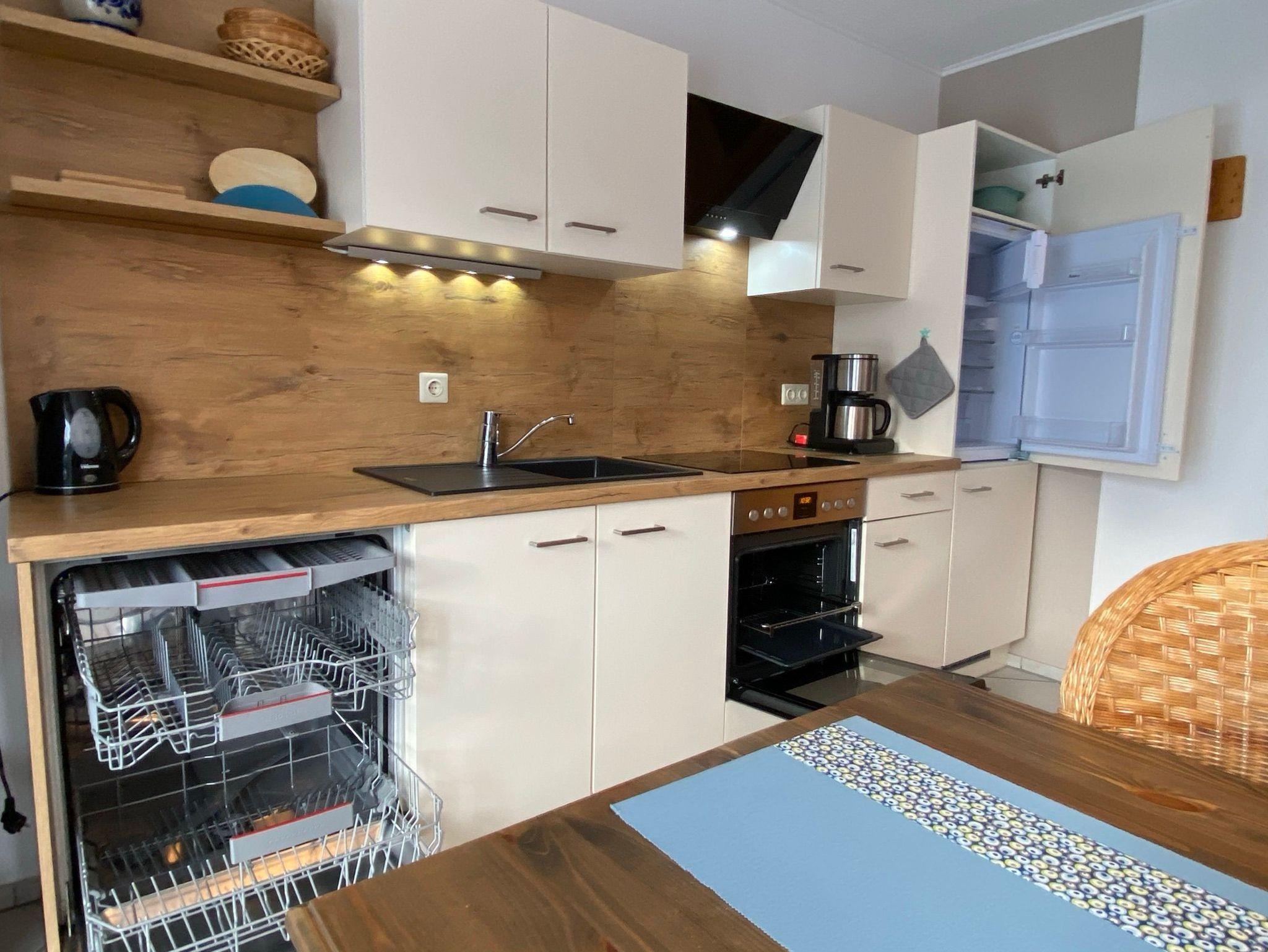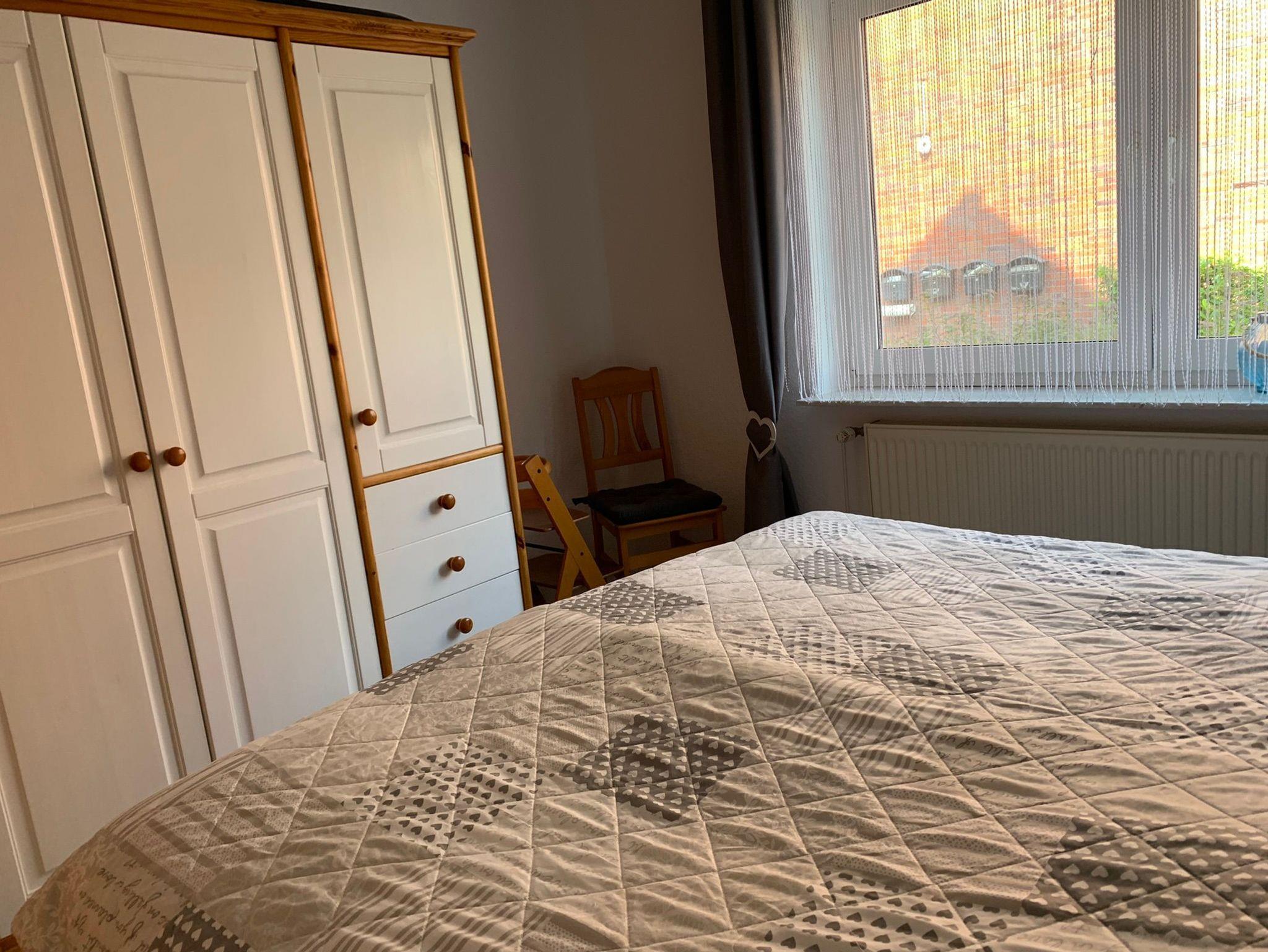 Das Haus besteht aus 4 Wohneinheiten, unsere Ferienwohnung Moin Moin 2 befindet sich im Erdgeschoss links. Sie besteht aus 2 Schlafzimmern mit je einem Doppelbett, einem Wohnzimmer mit neuen Küchenzeile (2020) und einem Essbereich. In der Küchenzeile ist ein 4-Platten Cerankochfeld, ein Backofen, eine Mikrowelle, ein Geschirrspüler, ein Kühlschrank, eine Kaffeemaschine, eine Senseo Kaffee-Pad Maschine, ein Toaster und ist mit den üblichen Küchenutensilien ausgestattet. Im Wohnzimmer ist ein Flachbildschirm-TV mit Sat- Anschluss, ein DVD- Player, (kostenloses) WLAN, ein Radio mit CD-Player. Im zweiten Schlafzimmer ist ebenfalls ein Flachbildschirm-TV mit Sat-Anschluss vorhanden. Im neuen Badezimmer (2020) mit Fenster ist eine Bodenebene Dusche und ein WC, es liegt ein Fön bereit. Auf der Terrasse befinden sich ein Tisch mit 4 Stählen und Sitzauflagen, ein großer Sonnenschirm, 2 Liegen und ein Grill. Im Obergeschoss befindet sich im Waschraum eine Münzwaschmaschine (2,00€ pro Waschgang). Außerdem gibt ist eine Kleinkindausstattung: mit einem Kinderreisebett (von Hauck mit Matratze), einen Kinderhochstuhl und einen Kinderrausfallschutz, dieses kann an der Bettaußenseite angebracht werden.