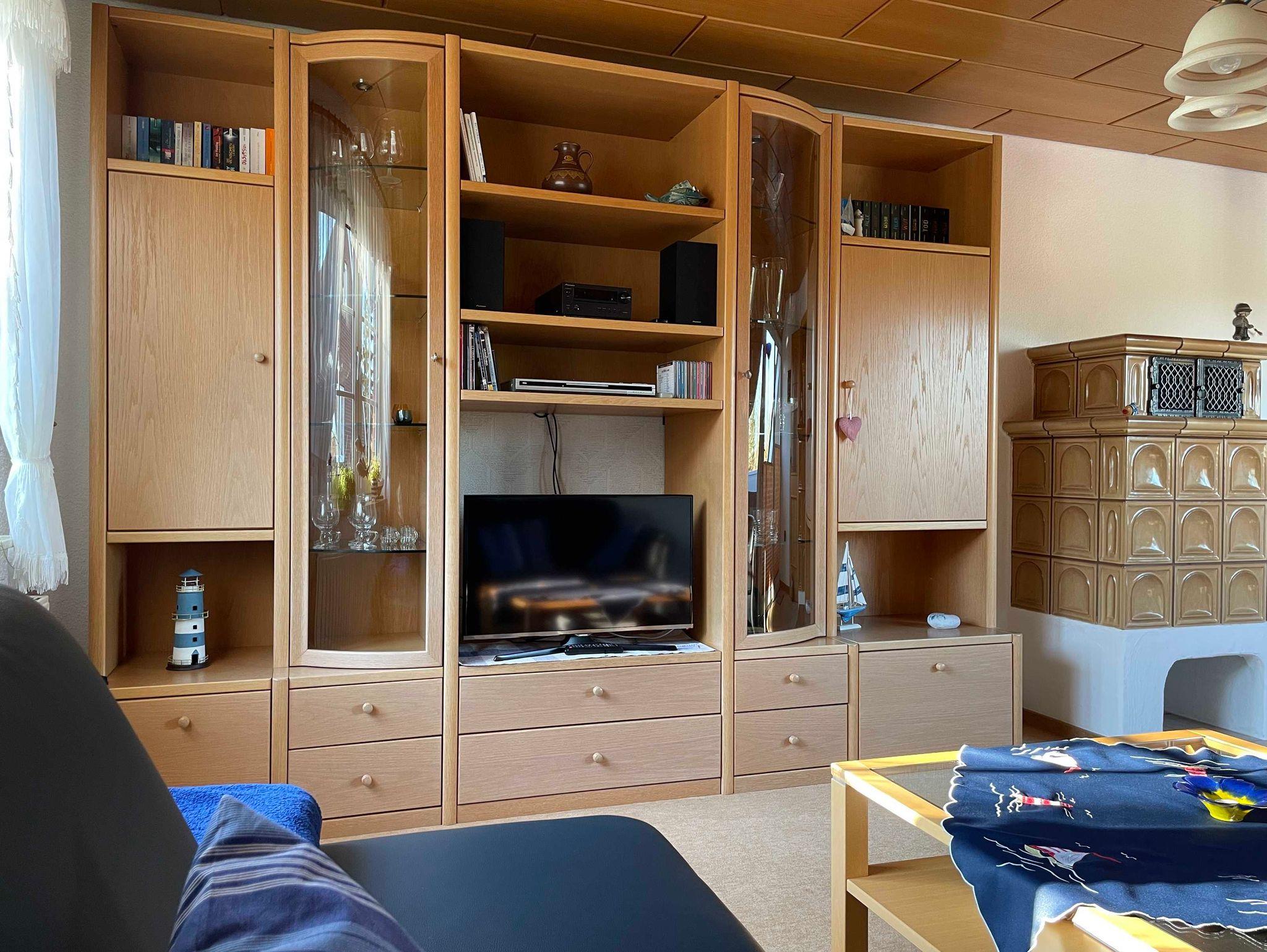 Gemütliches Wohnzimmer mit Ledergarnitur und LCD-TV (Kabel-Digital), 1 Schlafzimmer mit großem Kleiderschrank, 1 Bad mit Dusche sowie eine komplett ausgestattete Küche (z.B. Geschirrspüler, Backofen und Mikrowelle). Von der großen Dachterrasse haben Sie einen herrlichen Blick auf die Weide.