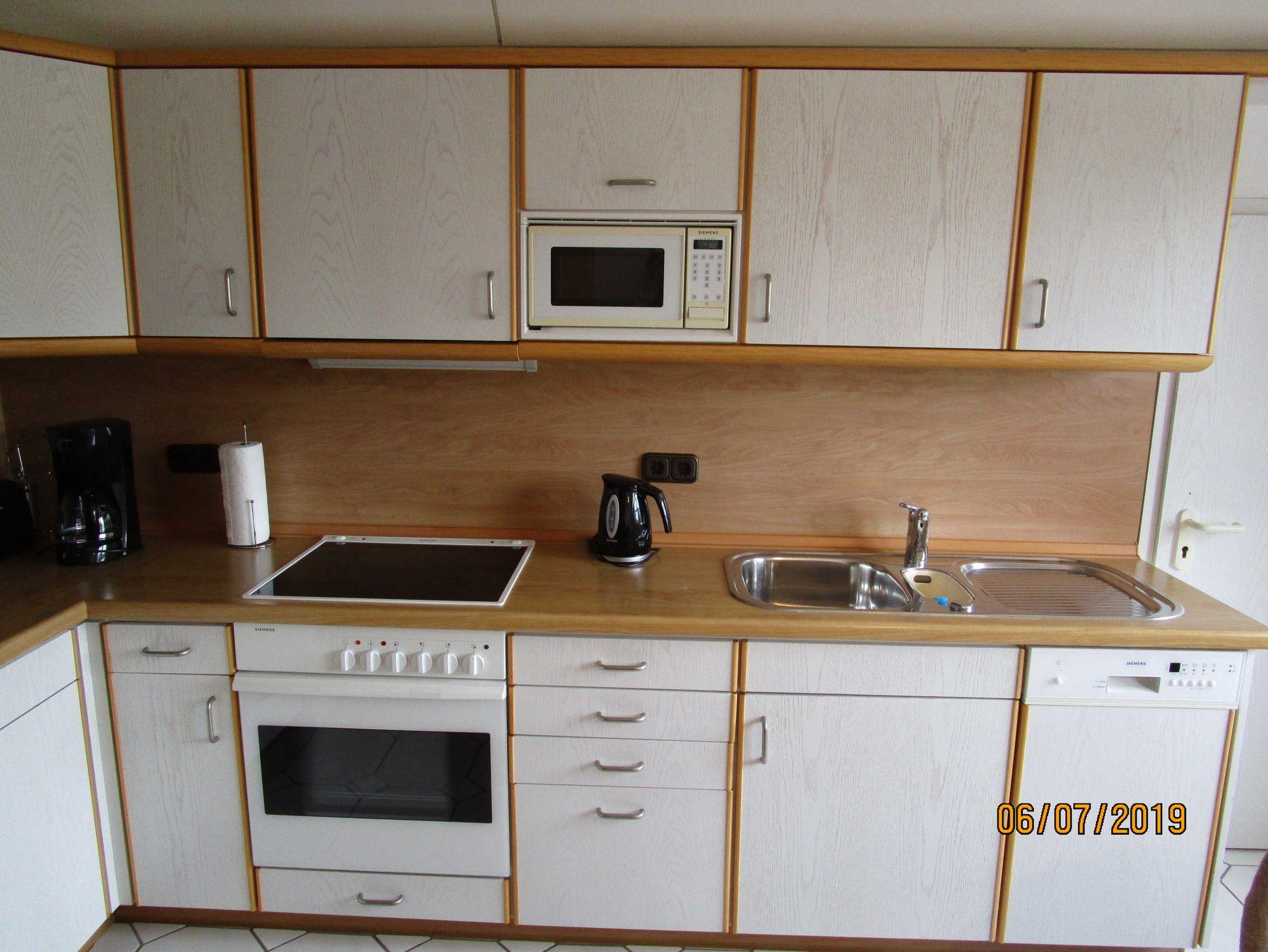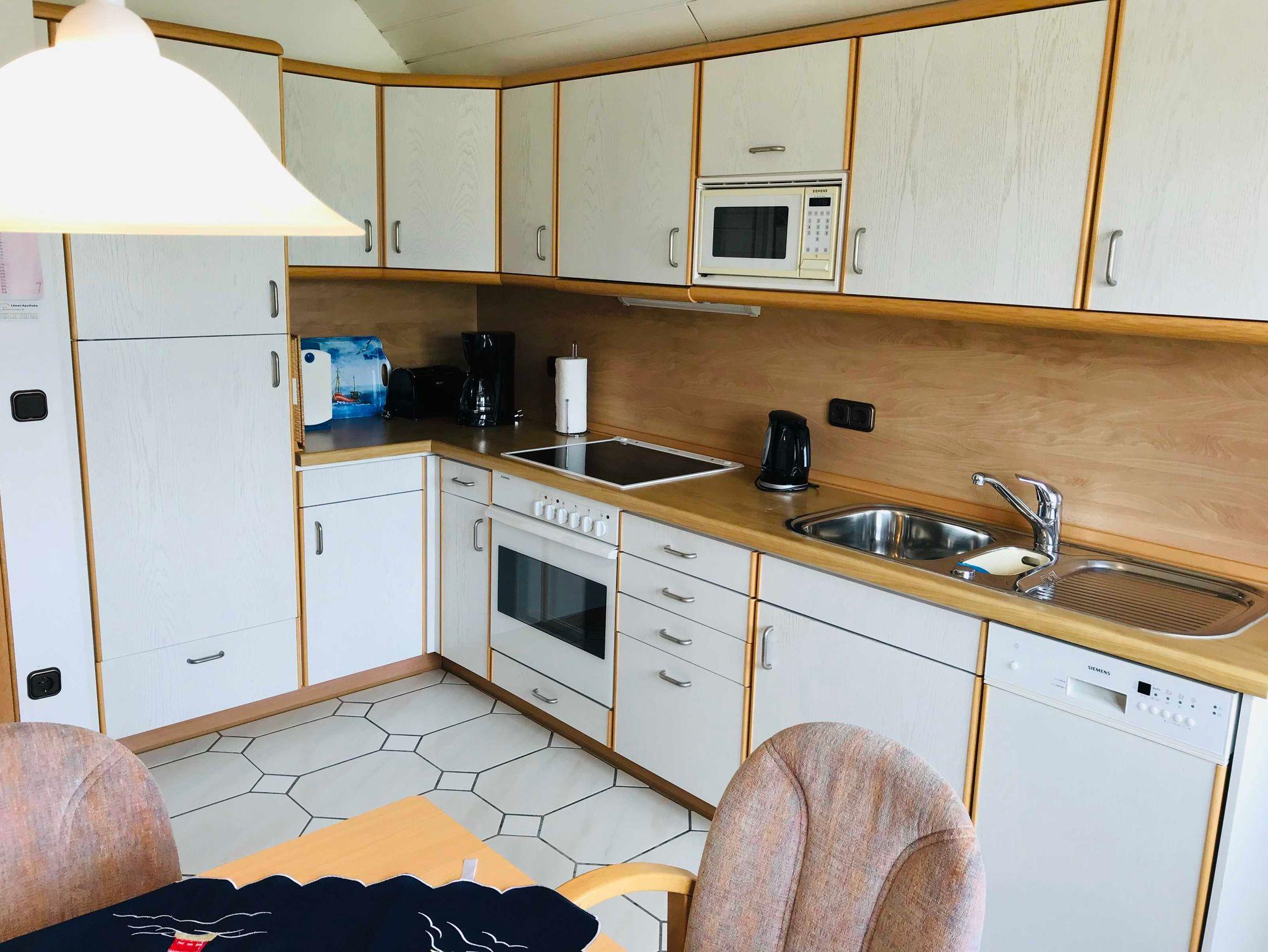 Die Küche hat eine Einbauküche, eine Sitzecke und eine Zugang zur großen Dachterrasse. Die Küche ist komplett ausgestattet mit Herd mit Ceranfeld, Dunstabzugsanlage, Kühlschrank mit großem Gefrierfach, Geschirrspüler, Kaffeemaschine, Eierkocher, Toaster, Wasserkocher, Mixer, Mikrowelle, Besteck, Geschirr etc. Wäscheständer- und klammern, Staubsauger, Bügelbrett und Bügeleisen. Die Benutzung von Waschmaschine und Trockner im Haus ist möglich.