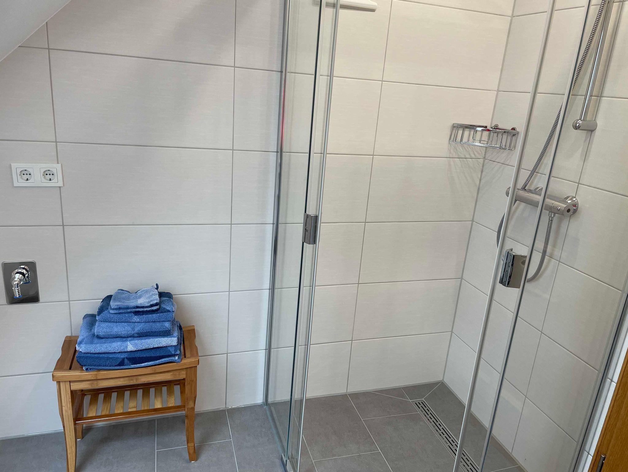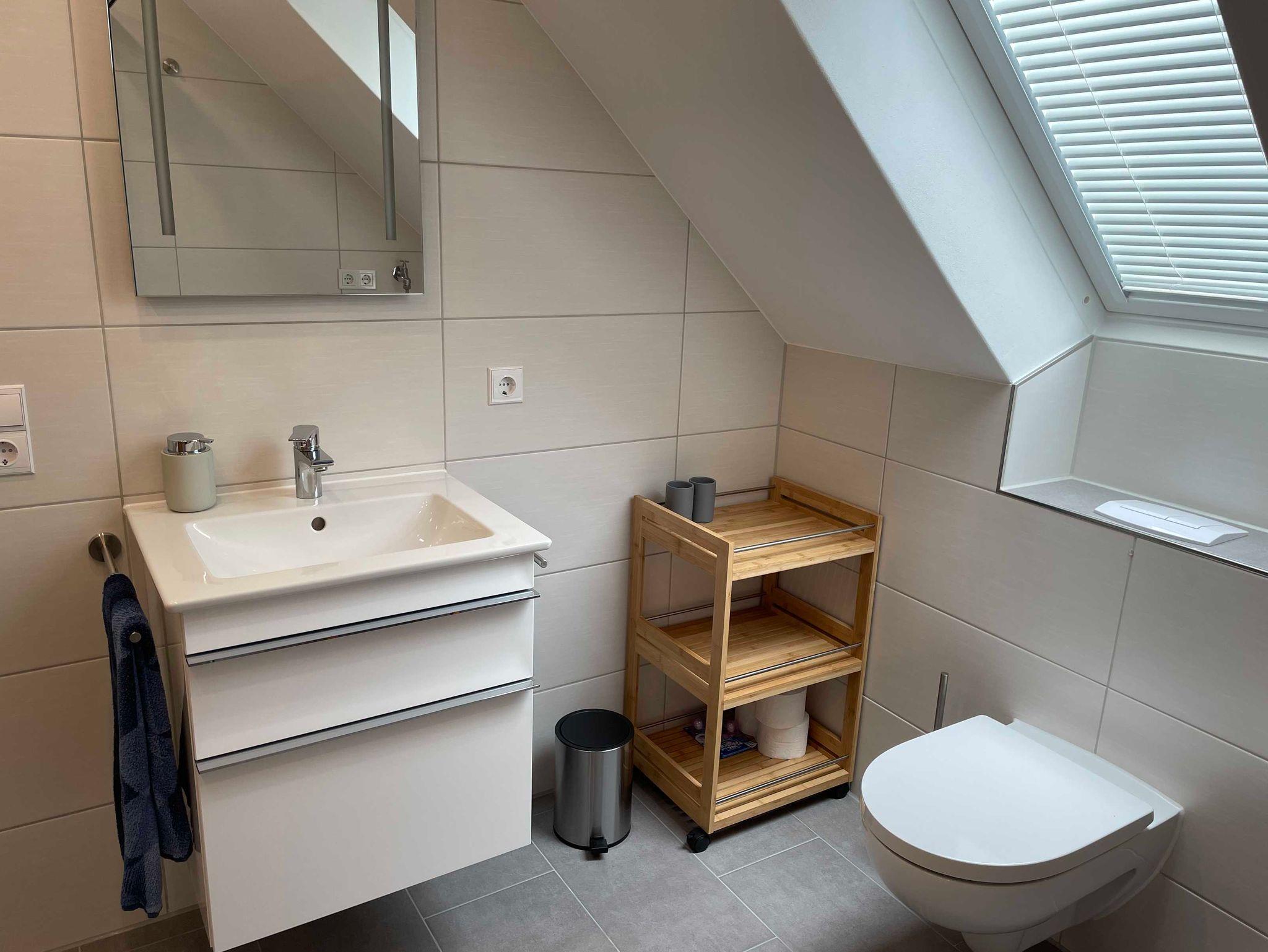 Im Bad befinden sich WC und bodengleiche Dusche.
