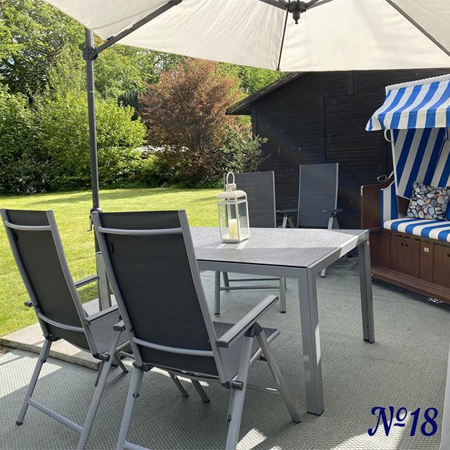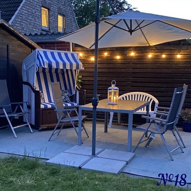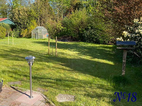 Auf der großen Wiese hinter dem Haus finden Sie eine Sitzecke mit Strandkorb, einem großen Sonnenschirm und Gartenmöbeln zum Relaxen. Für die Kleinen befindet sich dort ein Sandkasten mit etwas Sandspielzeug.
