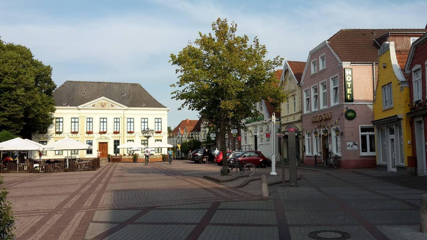 Die Ferienwohnung „Esenser Bär“ heißt Sie mit einer warmen, gemütlichen Atmosphäre willkommen. Im behaglichen Wohnzimmer lädt ein praktisches Schrankbett zum Entspannen ein, während im separaten Schlafzimmer ein komfortables französisches Doppelbett für erholsame Nächte sorgt – ideal für zwei Personen.