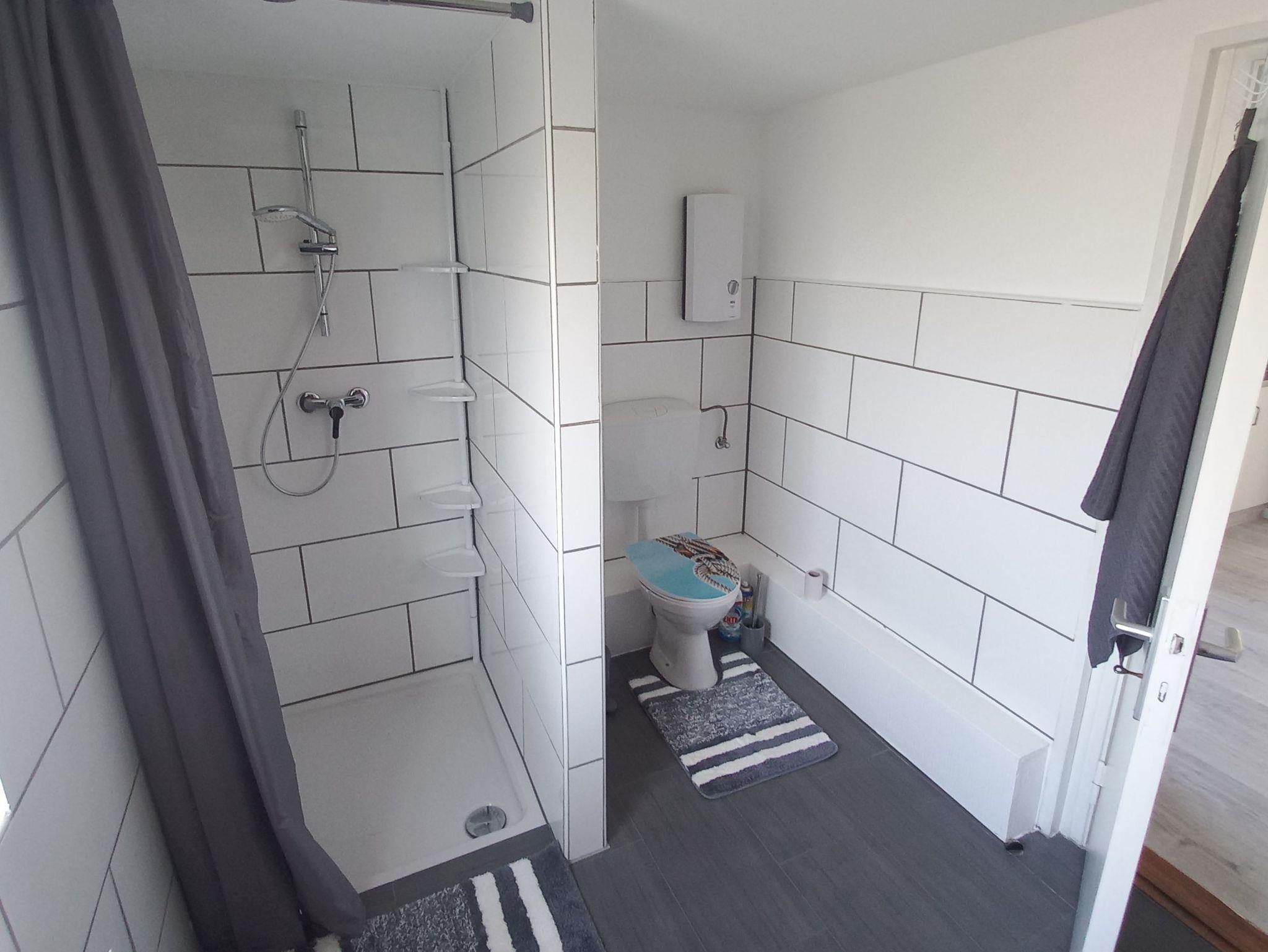 • Badezimmer mit ebenerdiger Dusche; Handtücher zu buchbar