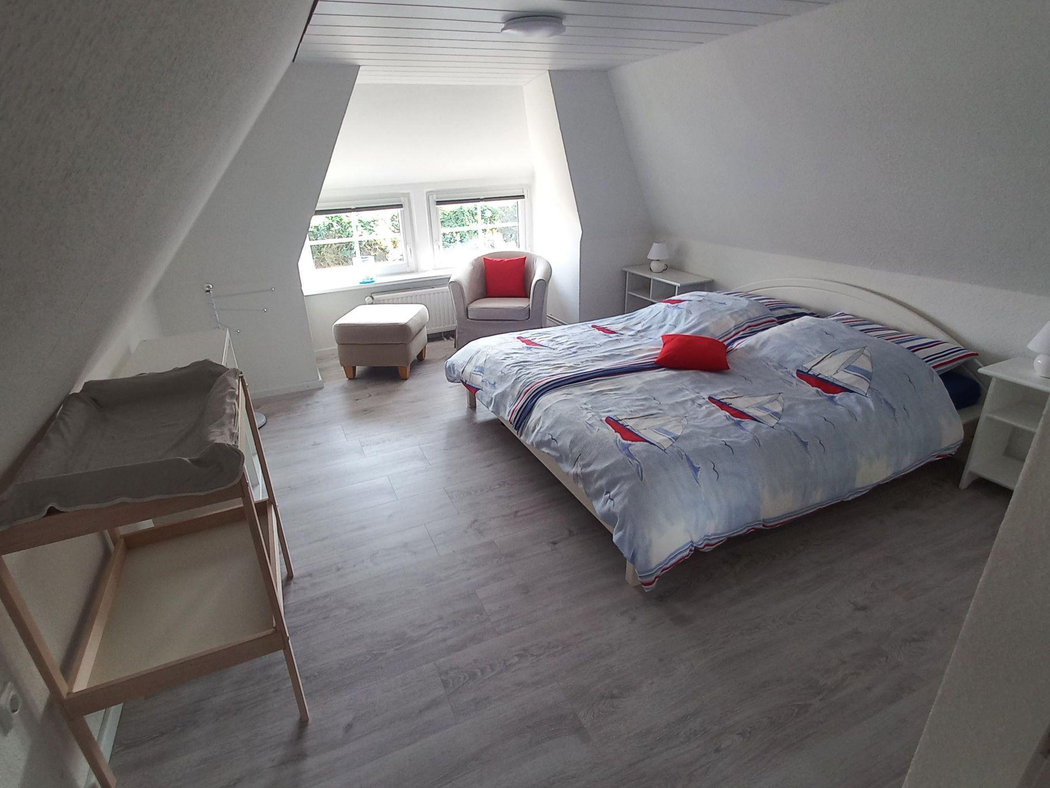 • Schlafzimmer mit Doppelbett (180x200), Babyzustellbett und Wickeltisch; Bettwäsche zu buchbar