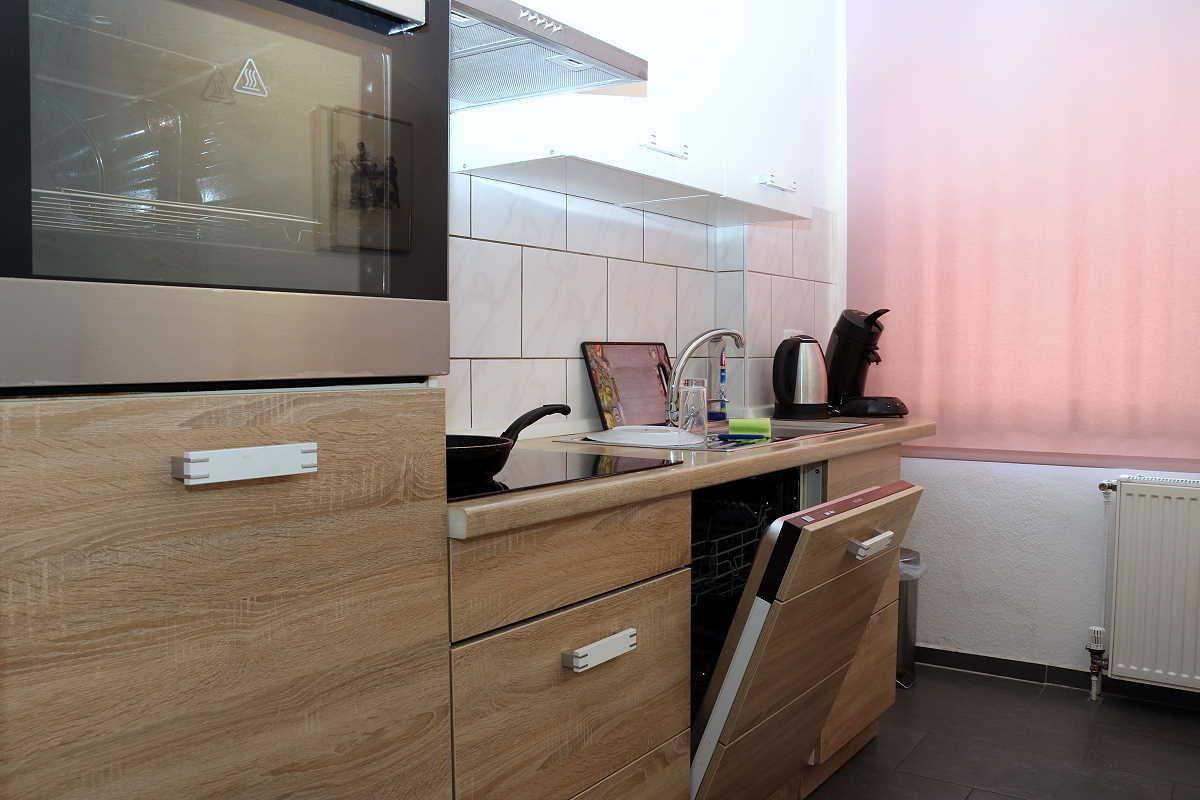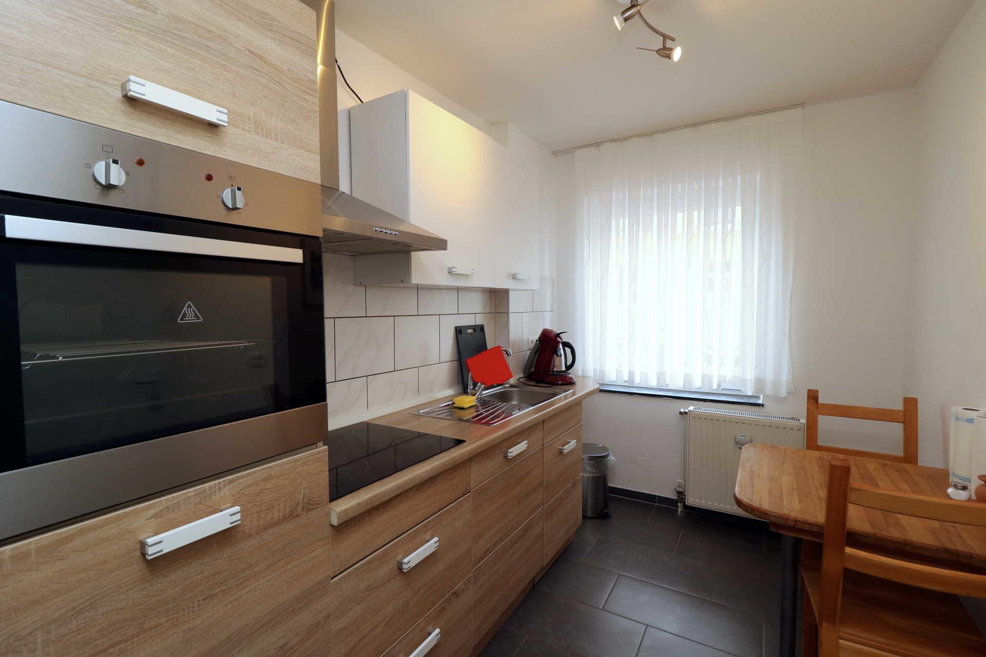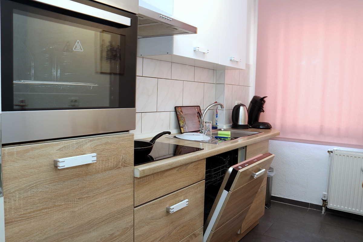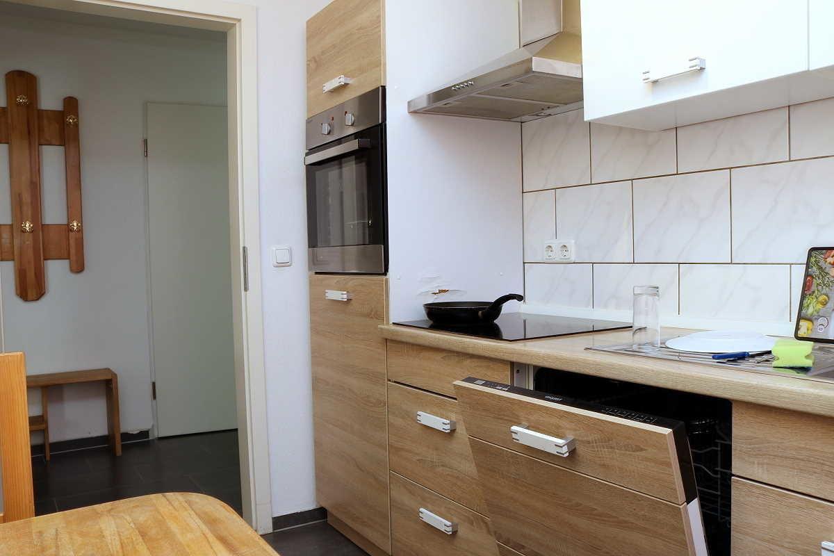Die Küche ist mit Kühlschrank (3-Sterne-Gefrierfach), Backofen, Ceranfeld, Spülmaschine, Dunstabzughaube mit Kochfeldbeleuchtung, Spüle, Kaffeemaschine, Wasserkocher, Tisch und 2 Stühlen komplett eingerichtet. Topfset, Bratpfanne, Geschirr/Besteck/ Tassen/Gläser für 4 Personen vorhanden.