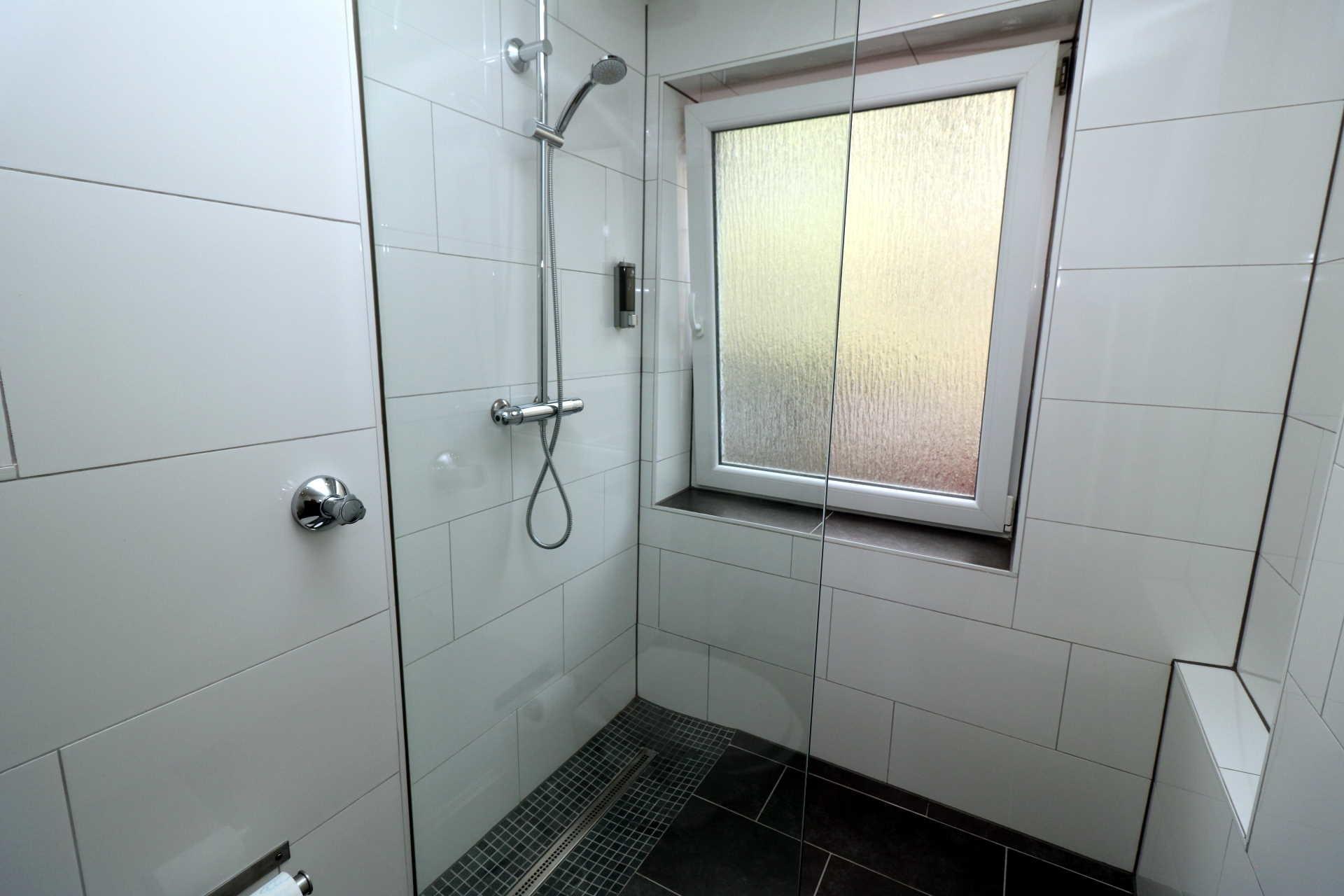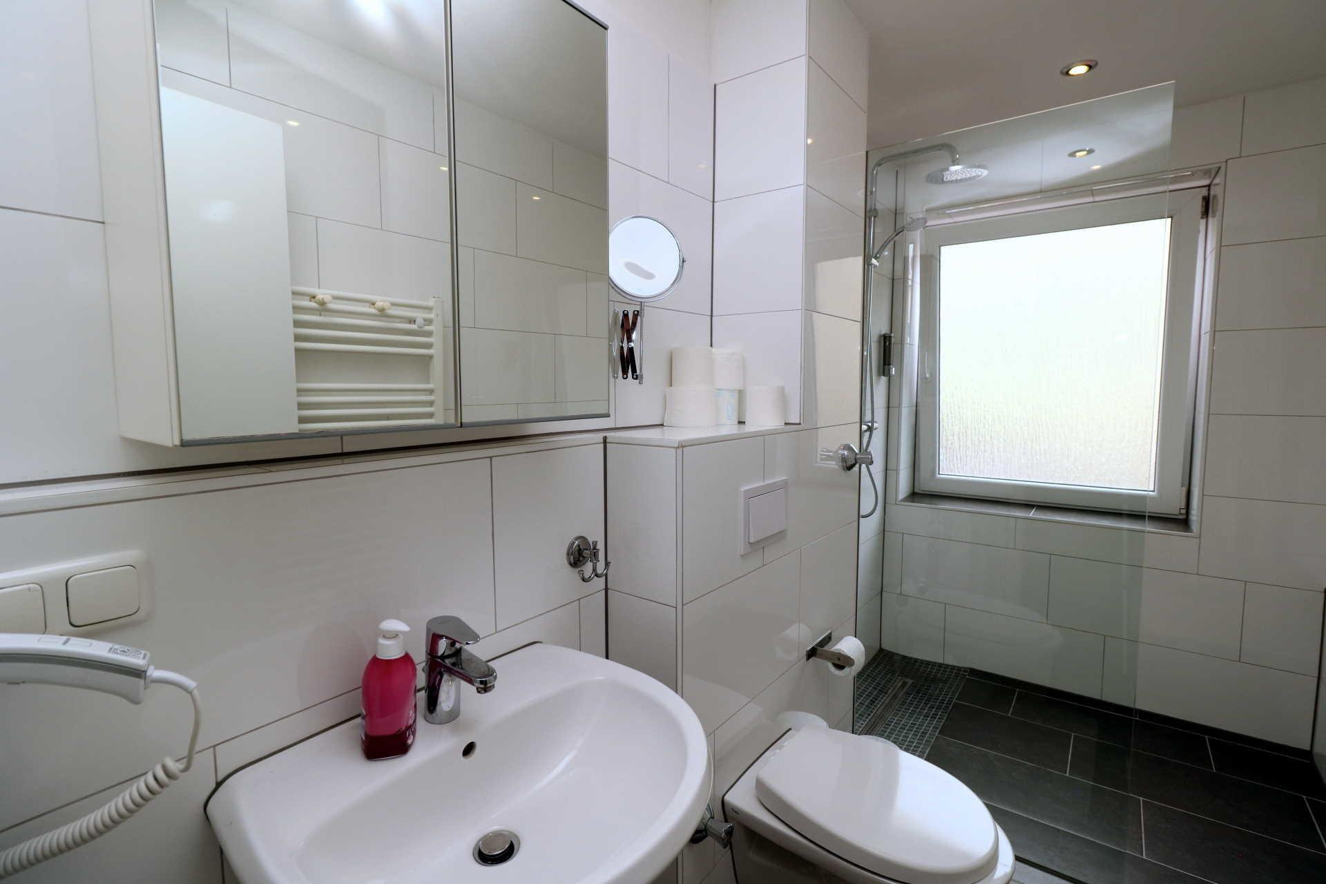 Das Badezimmer verfügt über einen Waschtisch, Spiegelschrank, WC und bodengleiche Dusche. Der Heizkörper ist als Handtuchheizung konzipiert, ein Föhn ist ebenfalls vorhanden.