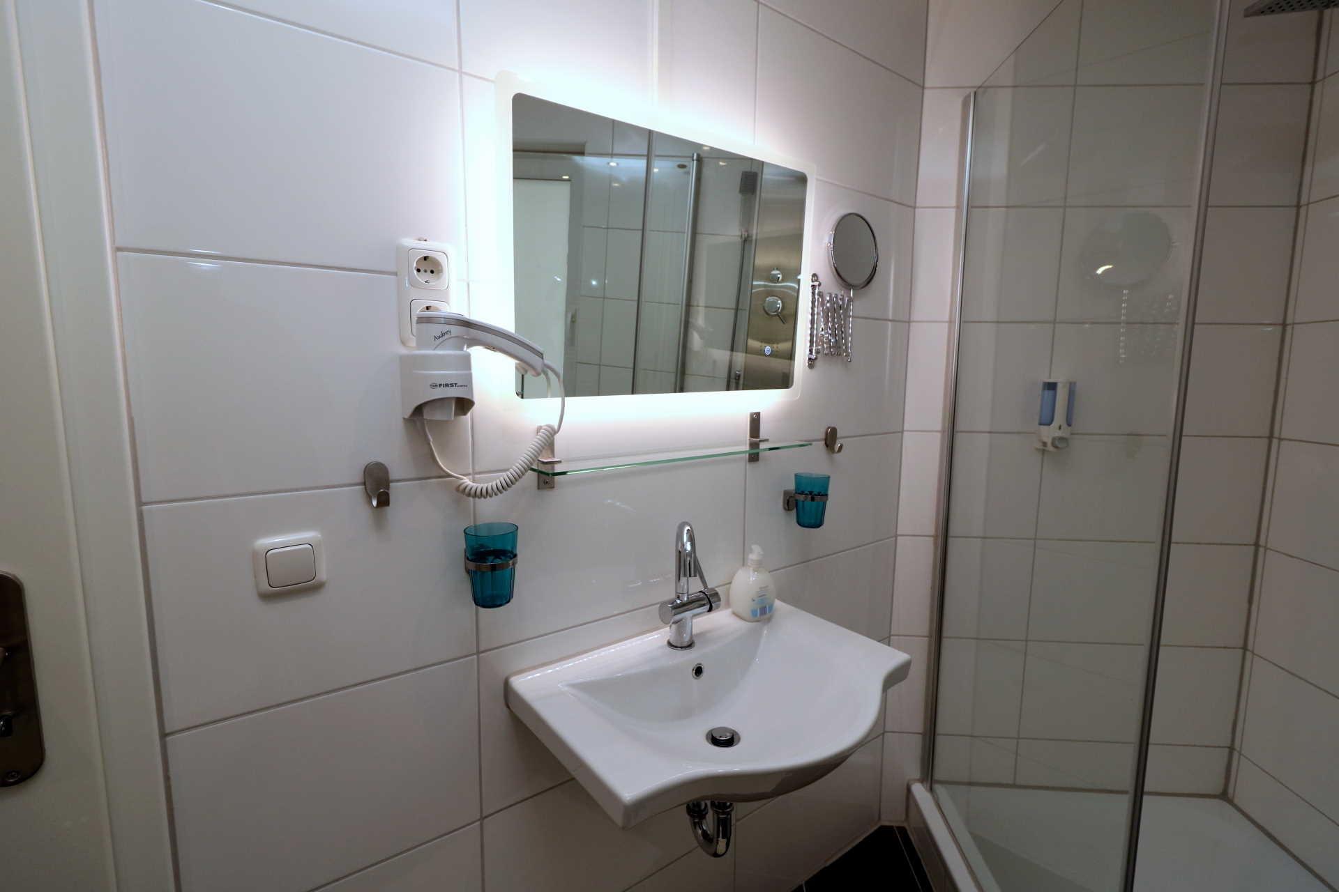 Das Duschbad verfügt über eine ebenerdige Dusche, Waschtisch, beleuchteten Spiegel , Glasablage und WC. Ein Föhn ist ebenfalls vorhanden.