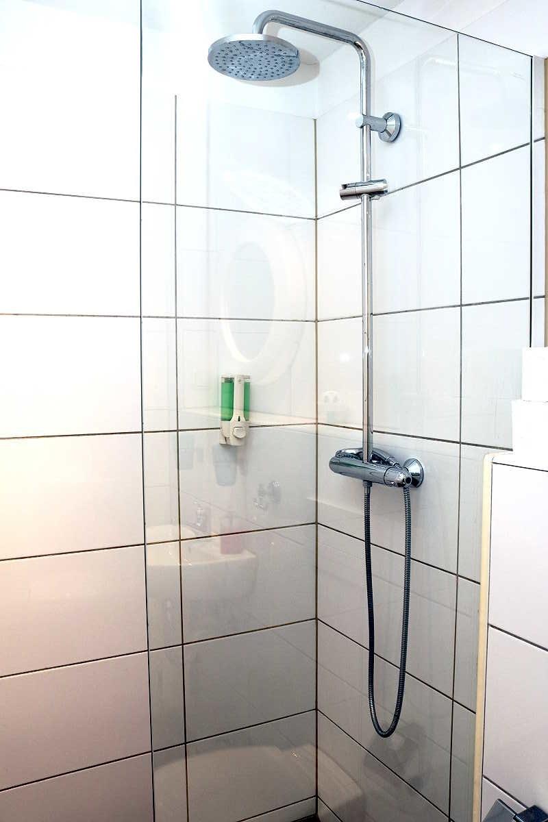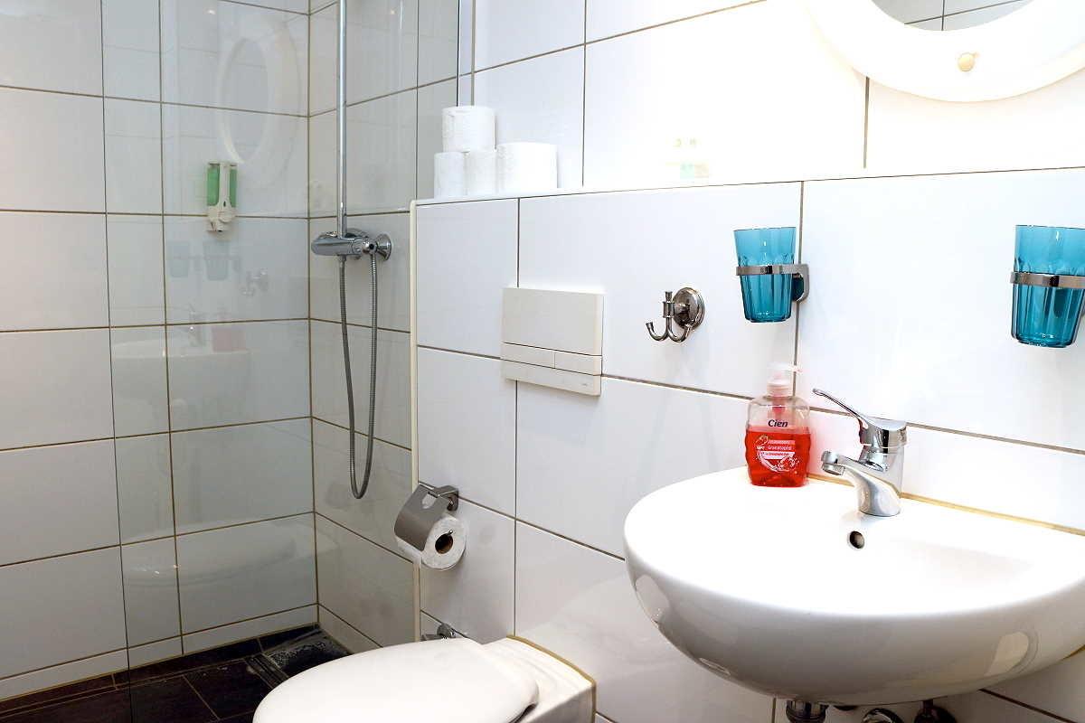 Das Badezimmer verfügt über einen Waschtisch, Spiegel, Kosmetikspiegel, WC und bodengleicher Dusche. Der Heizkörper ist als Handtuchheizung konzipiert, ein Föhn ist ebenfalls vorhanden.