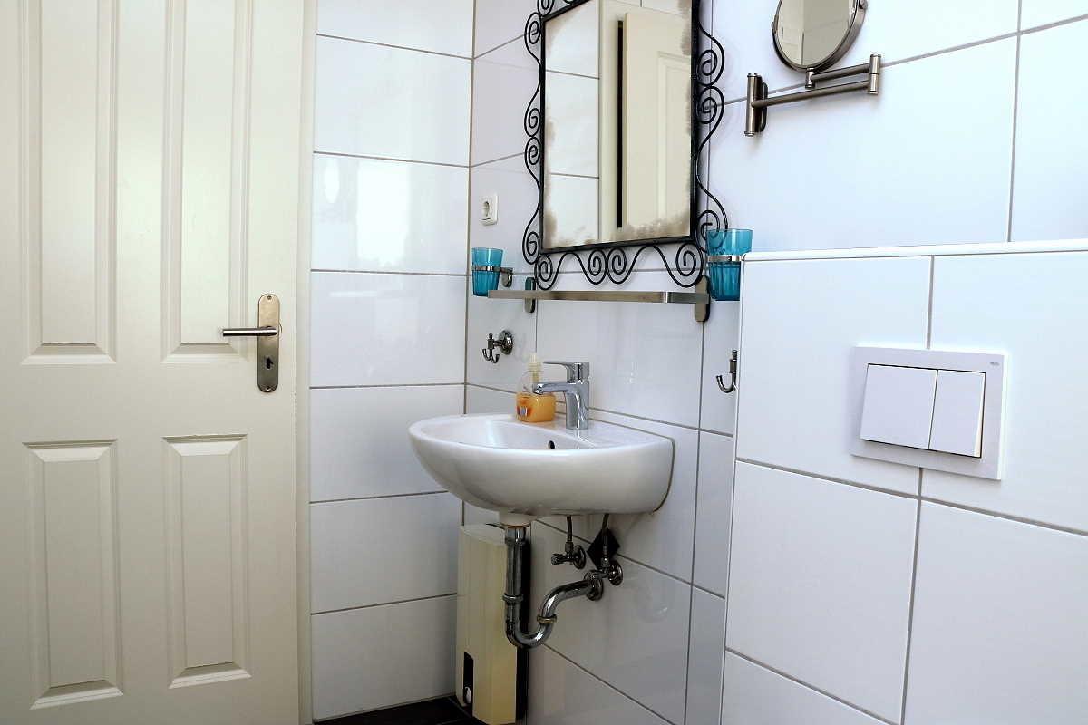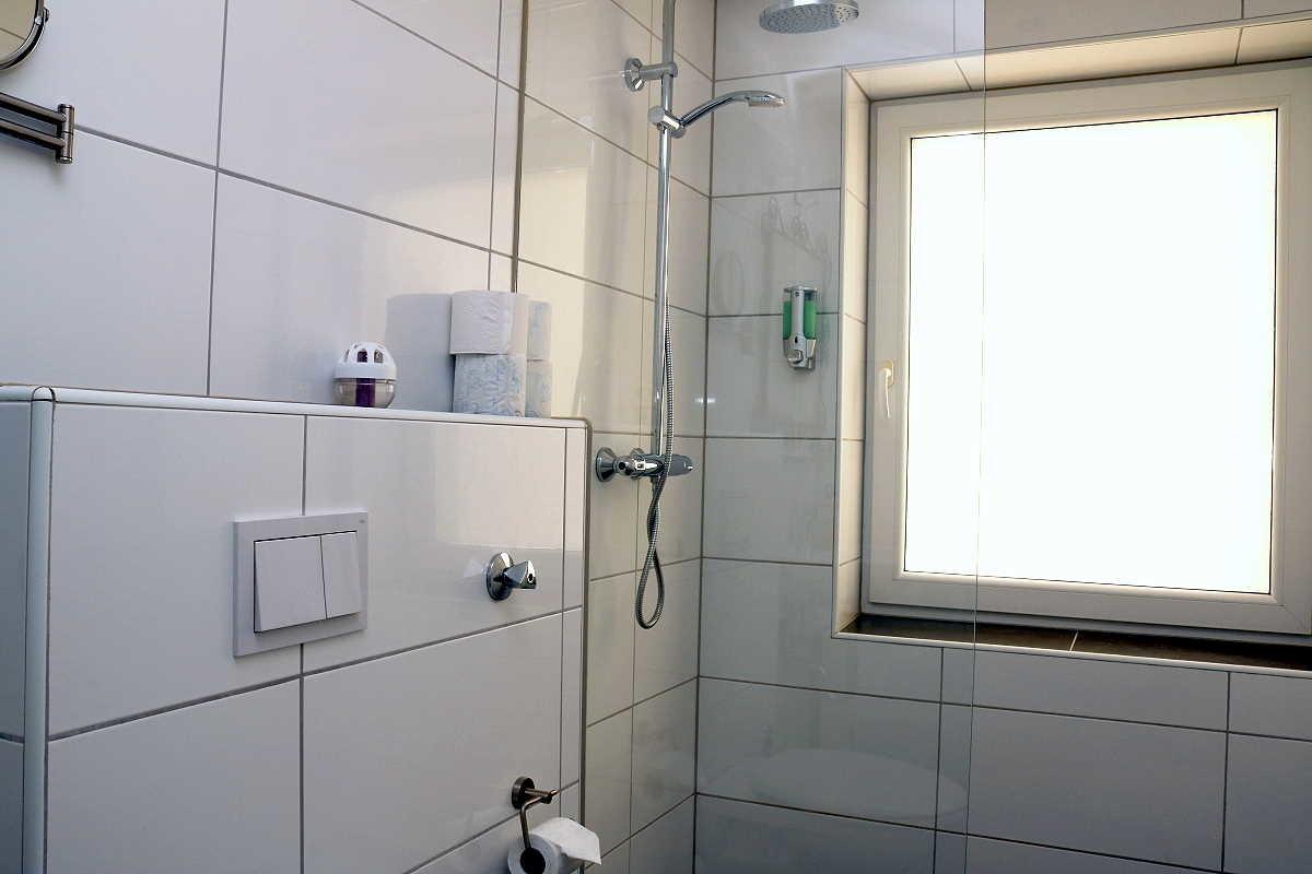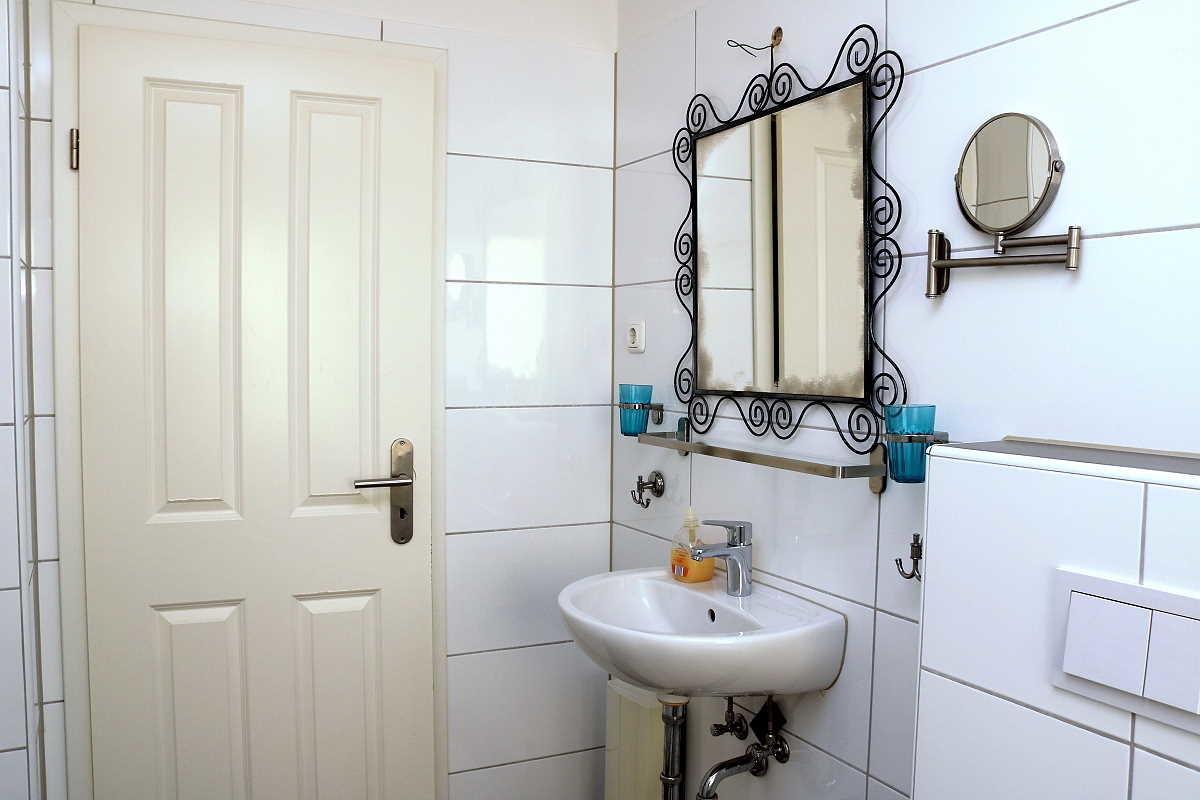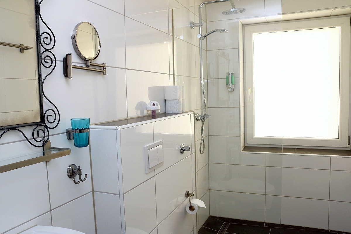 Das Badezimmer verfügt über einen Waschtisch, Spiegel, Kosmetikspiegel, WC und bodengleicher Dusche. Der Heizkörper ist als Handtuchheizung konzipiert, ein Föhn ist ebenfalls vorhanden.