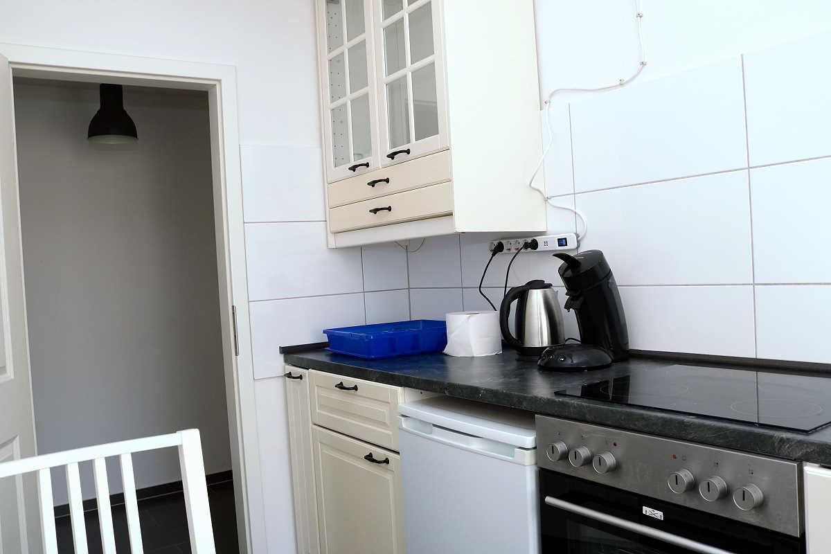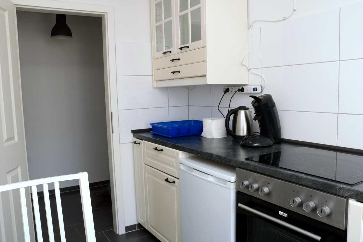 Die Küche ist mit Kühlschrank (3-Sterne-Gefrierfach), Backofen, Ceranfeld, Spülmaschine, Spüle, Kaffeemaschine, Wasserkocher, Tisch und 2 Stühlen komplett eingerichtet. Topfset, Bratpfanne, Geschirr/Besteck/ Tassen/Gläser für 4 Personen vorhanden.