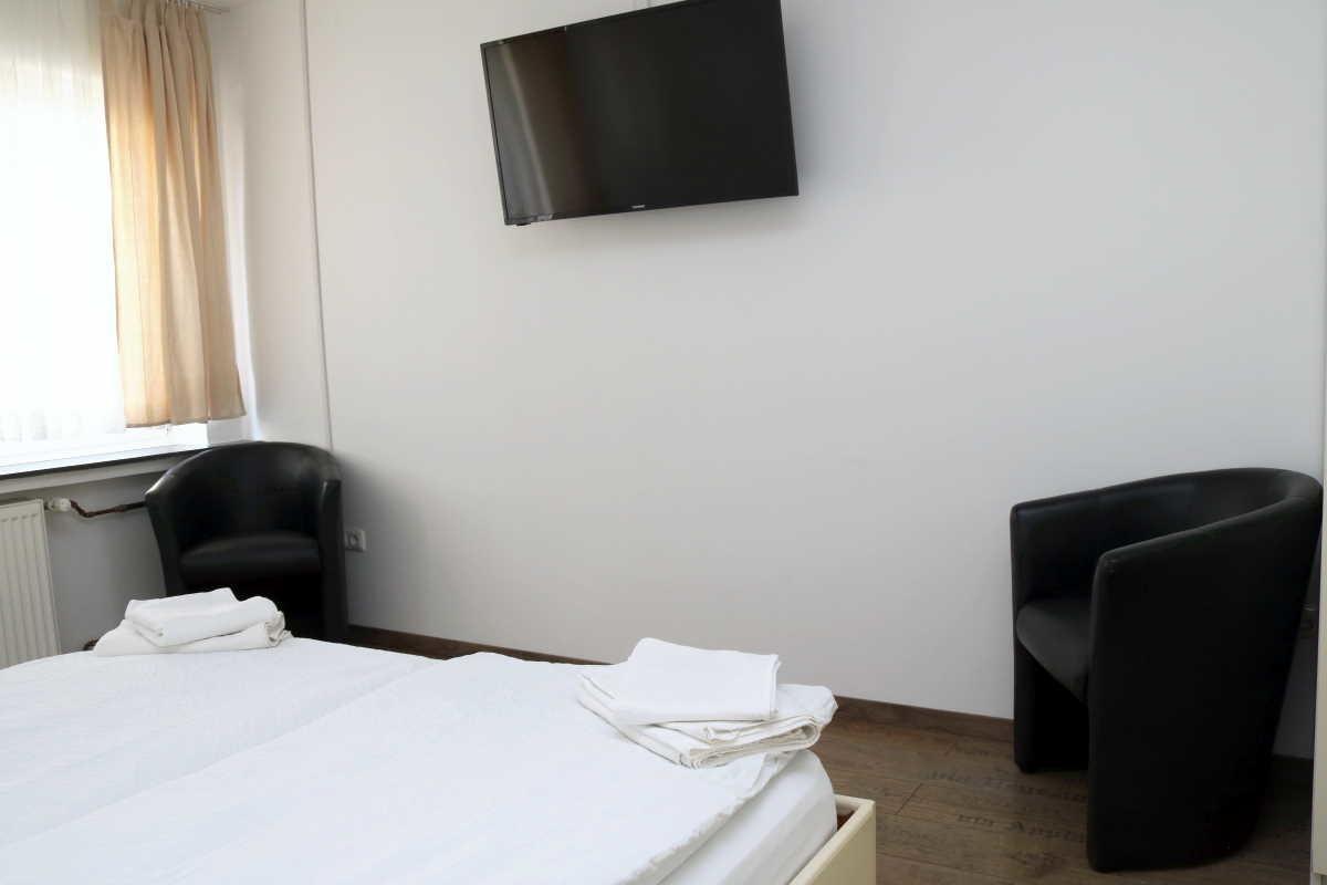 Das Schlafzimmer 1 ist mit Doppelbett, einem Kleiderschrank, modernen Schrankelementen, Kabel-TV, einem kleinem Tisch und 2 Clubsesseln ausgestattet.