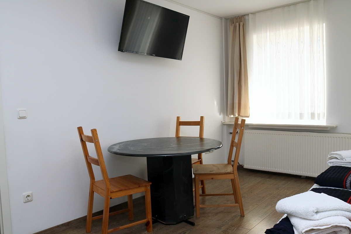 Von Schlafzimmer 1 (102) gibt es einen Zugang zu einem kleinen Balkon, der über 2 Sitzgelegenheiten und einen kleinen Tisch verfügt. Ein Aschenbecher ist ebenfalls vorhanden.