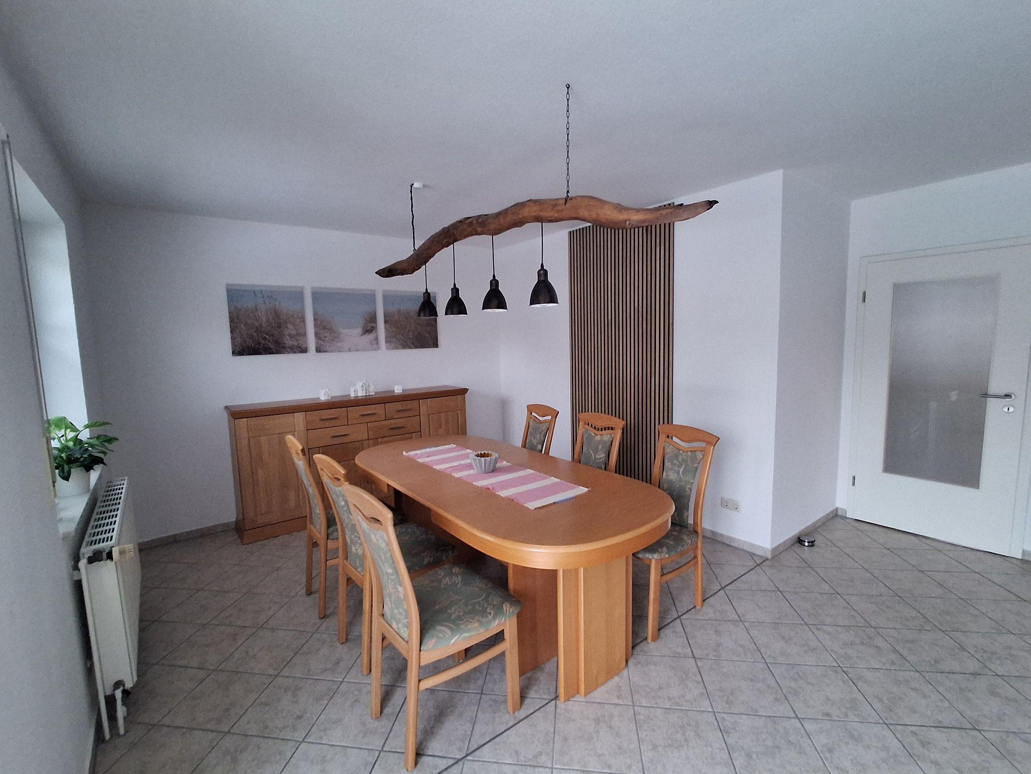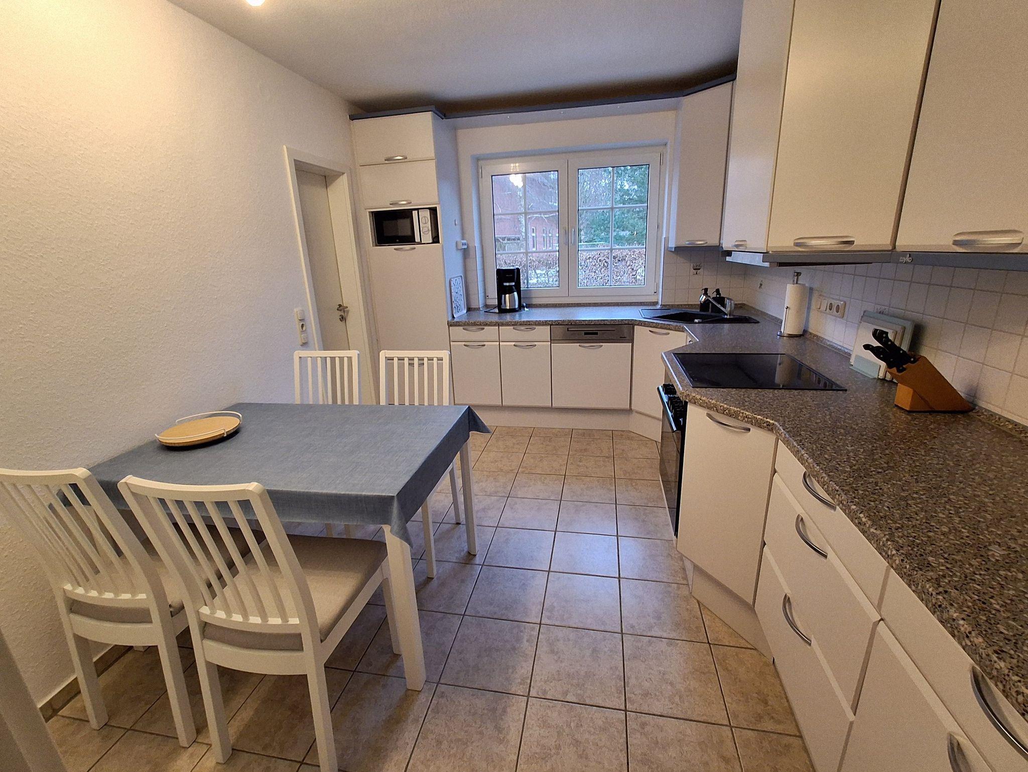 Esszimmer und voll ausgestattete Küche mit Geschirrspüler, Mikrowelle, Kaffeemaschine, Toaster und Heißluftfritteuse