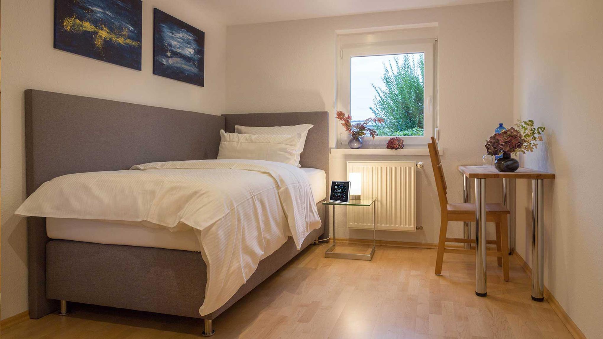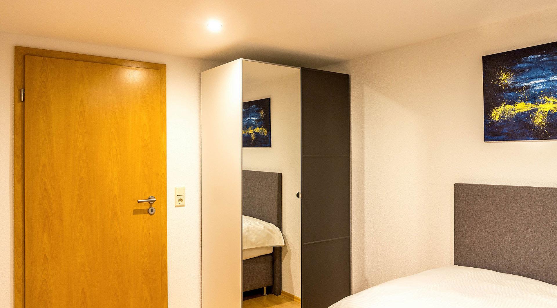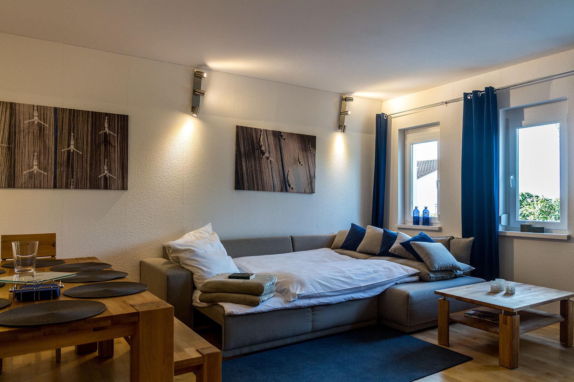 Die Wohnung ist im Sommer 2016 innen komplett renoviert worden. Der Schnitt der Wohnung ist wie das ganze Haus etwas ungewöhnlich, es gibt auch mal keine rechten Winkel. Die Zimmer sind alle hell und freundlich. Um Ihnen ein Zuhause auf Zeit zu ermöglichen, haben wir helle Holzmöbel und angenehme Stoffe ausgewählt. In der ganzen Wohnung wurde Wert auf wunderschönes Licht gelegt, weil die Sonne ja nicht immer scheint. Alle Fenster sind 3-fach verglast und haben Rollläden. Bei längeren Aufenthalten (ab 7 Tage) bieten wir eine wöchentliche Zusatzreinigung an. Den Termin sprechen wir mit Ihnen ab.