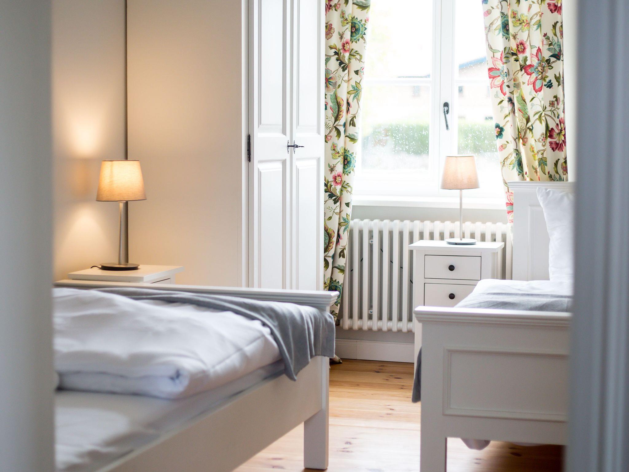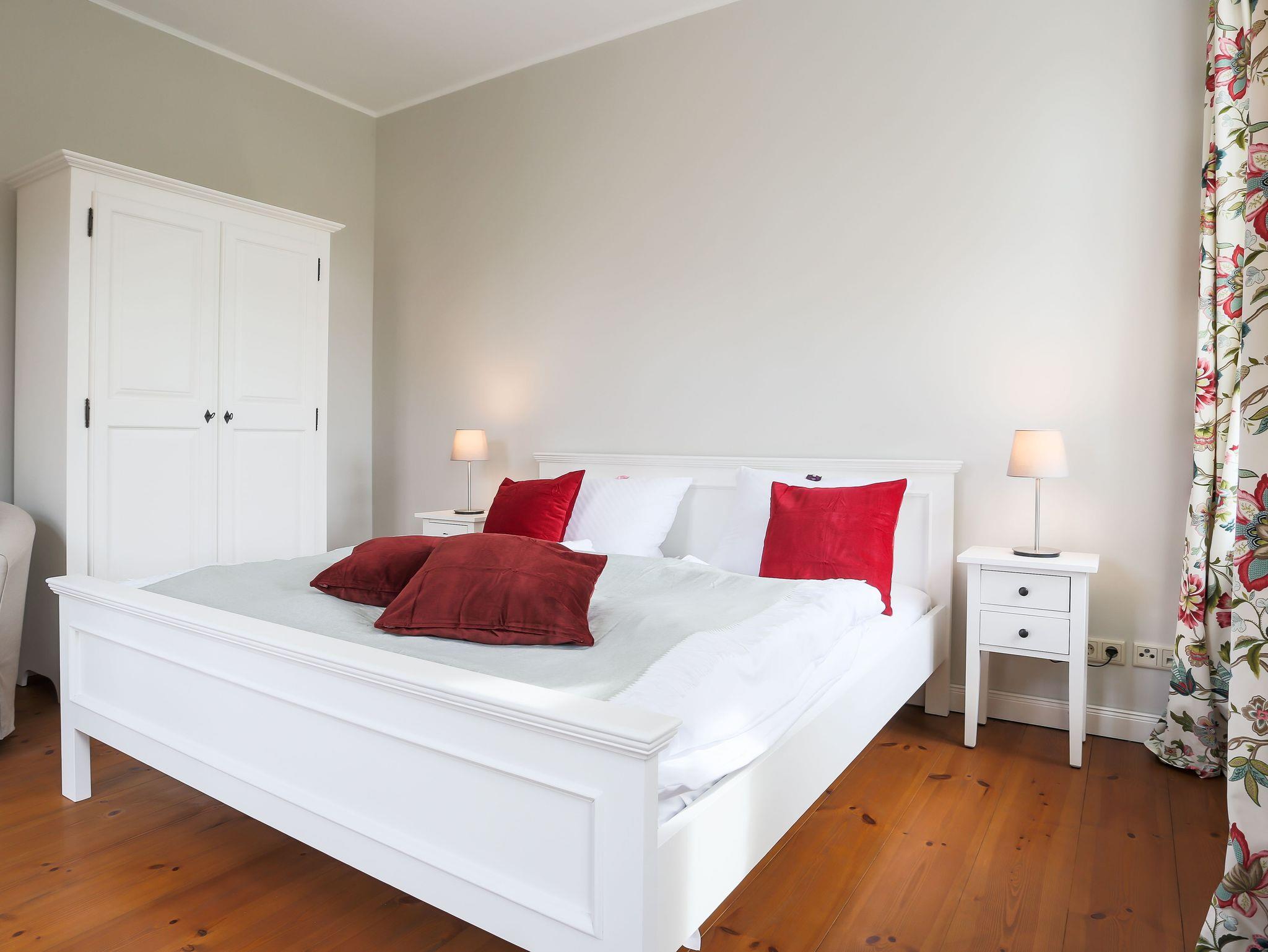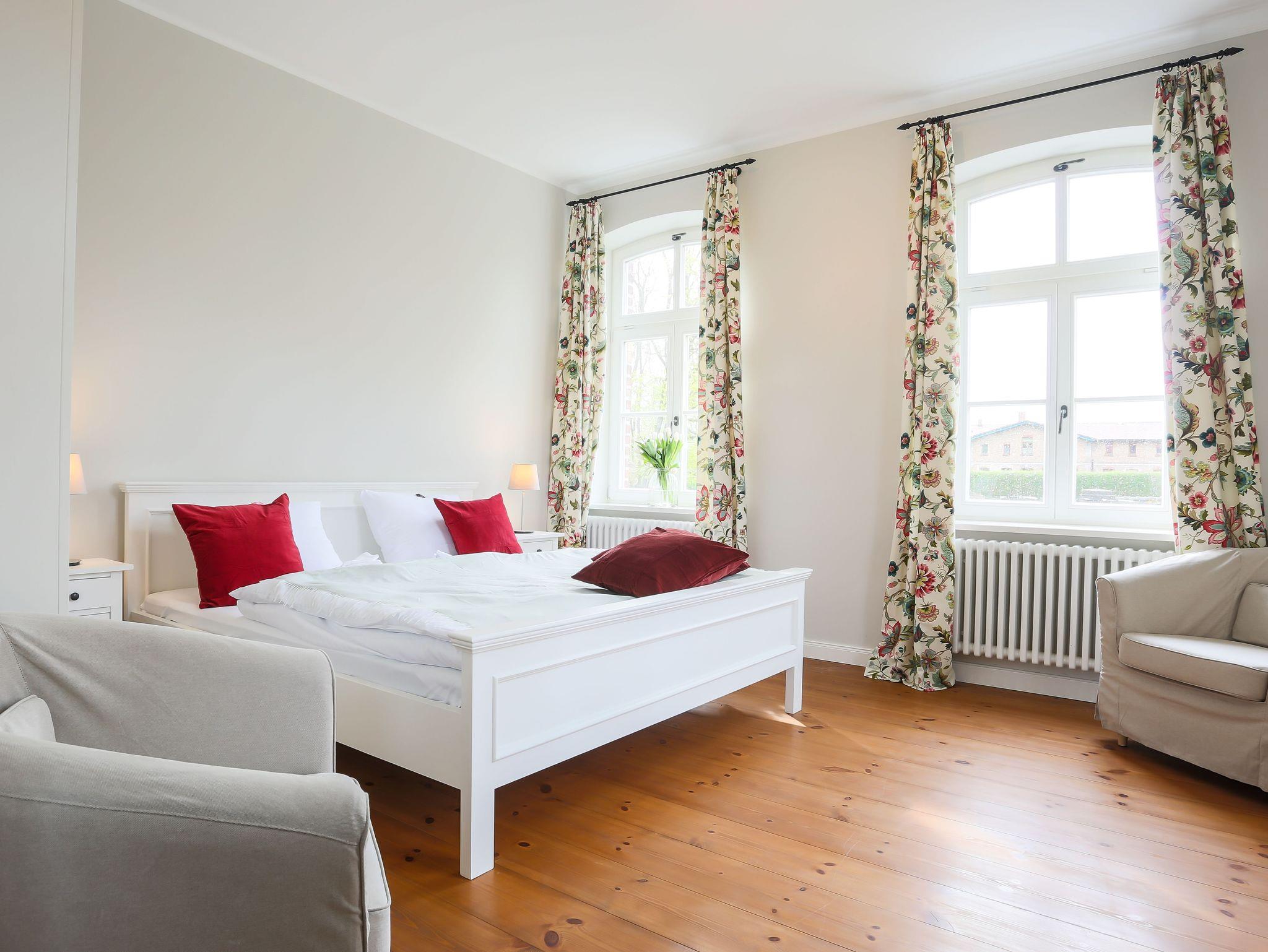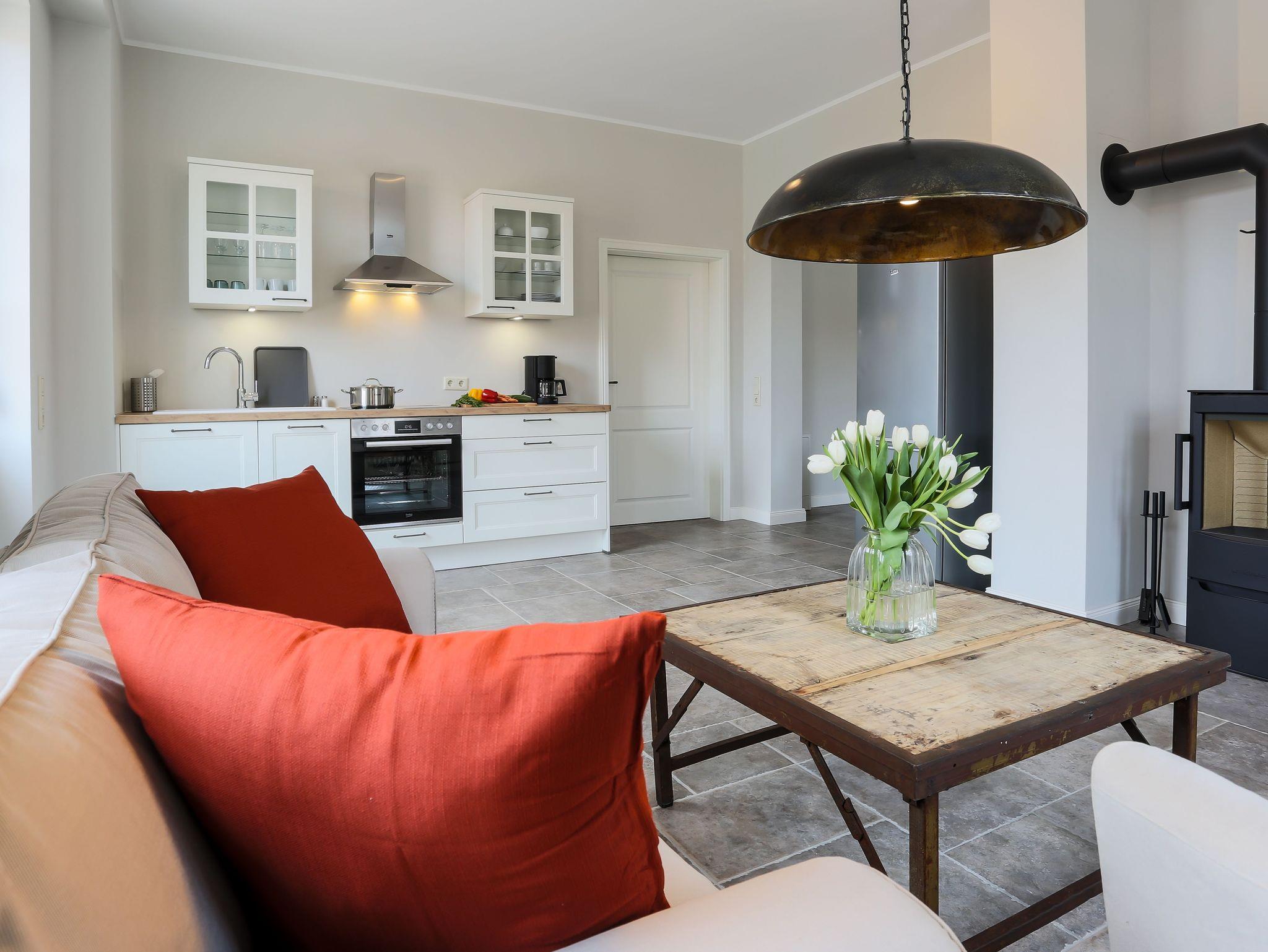 Ein ganz besonderes Wohnerlebnis erfahren Sie in unserer Wohnung „Gransee“. Sie liegt auf der Stirnseite und und besitzt ein sechsstufiges Eingangsportal, auf dem sich neben der geräumigen Terrasse die Abendsonne genießen lässt. Die Wohnung ist sehr hell. Eine moderne Einbauküche verbindet sich mit dem Wohn- und Essbereich. Vor dem Kamin lässt es sich auch an kälteren Tagen wunderbar auf dem Loung-Sofa kuscheln. Über einen kleinen Flur gelangen Sie in die beiden Schlafräume. Einmal mit großem Doppelbett, einmal mit zwei Einzelbetten. Das Bad beherbergt ein Doppelwaschbecken mit sehr großem Spiegel, mobilem Kosmetikspiegel, Fön und einer ausladenden bodengleichen Dusche. Selbstverständlich steht auch hier kostenloses WLAN sowie kostenfreie Parkplätze zur Verfügung. Eine Aufbettung mit Zustellbett ist möglich.