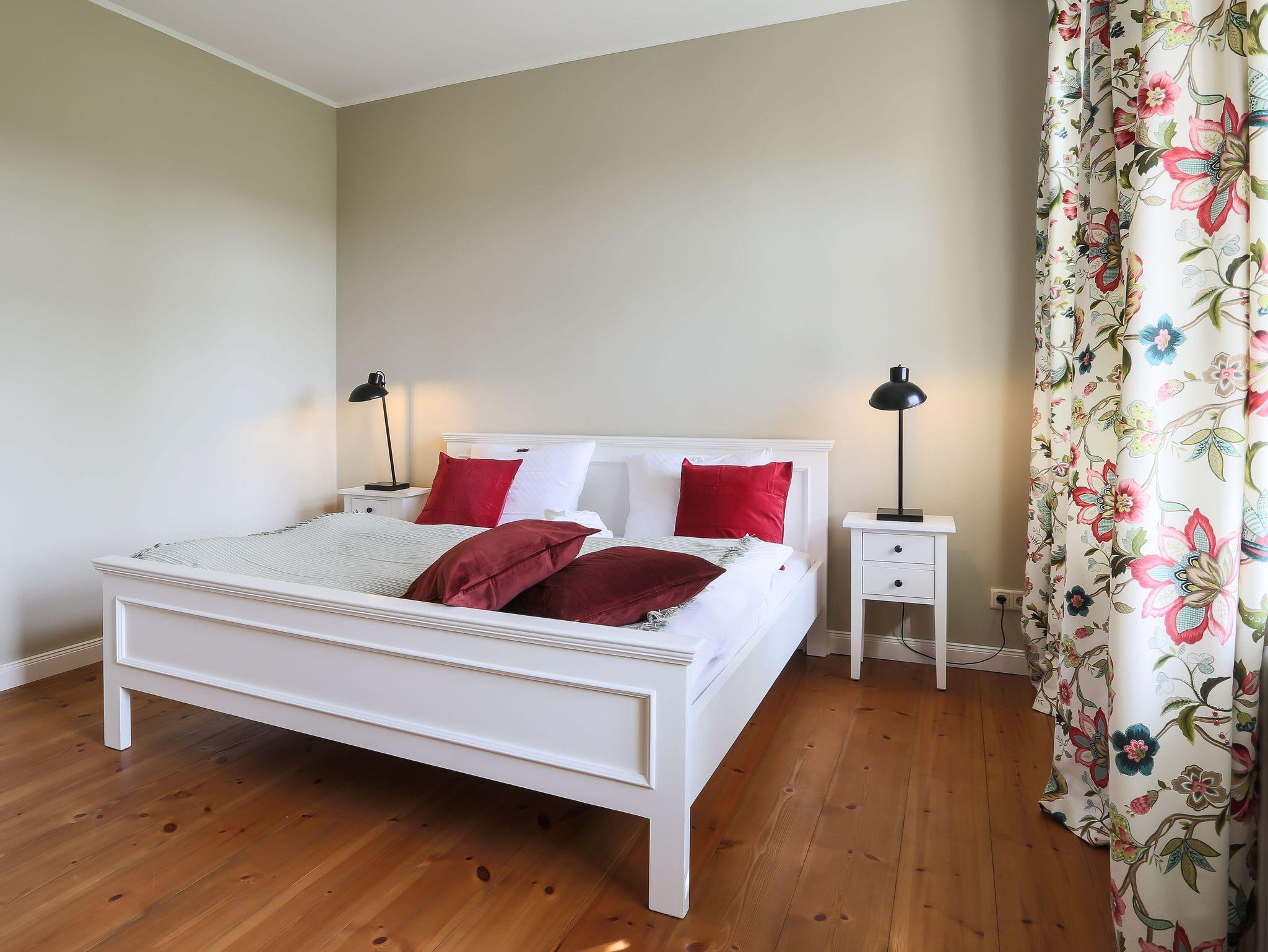 Von der Terrasse geht es gleich in die Küche. Links der große Esstisch. Rechts die komplette, moderne Küchenzeile. Angegliedert der Wohnbereich mit Sofa, Sesseln, Flachbildschirm und Kamin. Dahinter ein großes Schlafzimmer mit Doppelbett und Fenstern zum Park. Das zweite Schlafzimmer geht vom kleinen Flur ab. Es ist so groß wie das Erste, hat aber zwei Einzelbetten. Ebenfalls vom Flur geht es in das geräumige Bad mit großer Erlebnisdusche und Doppelwaschbecken. Farblich harmonisch setzt die rote Wand im Wohnbereich besondere Akzente. Selbstverständlich steht auch hier kostenloses WLAN sowie kostenfreie Parkplätze zur Verfügung. Eine Aufbettung mit Zustellbett ist möglich.