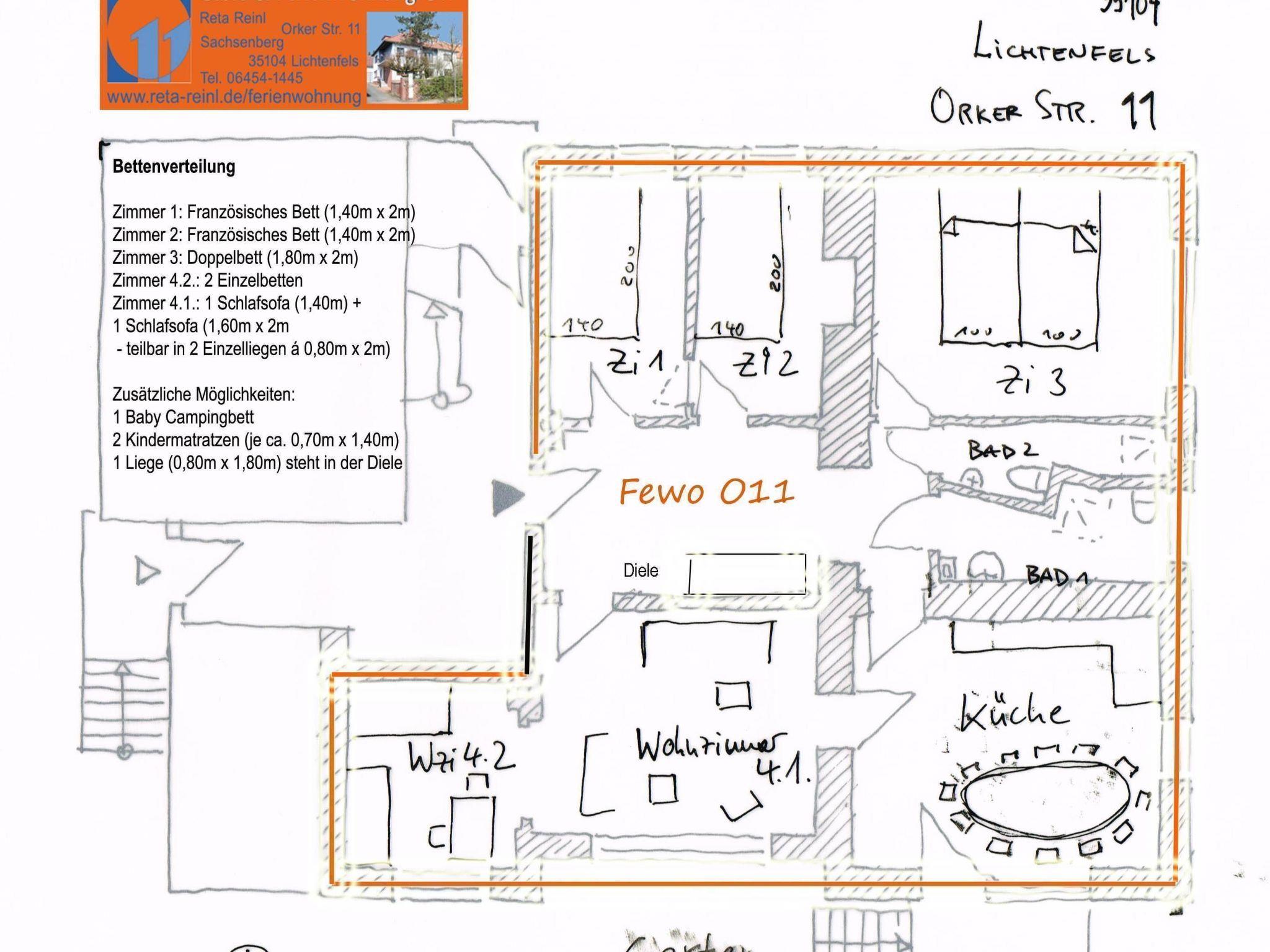 Holiday and guest flat O11 for 4-12 people (125m²) in the Künstlerhaus in Lichtenfels-Sachsenberg, Waldecker Land, Kellerwald-Edersee National Park (World Heritage Site), Diemelsee, Twistesee, Sauerland, Winterberg, Willingen, Medebach (10 km). The holiday flat has 4 ½ rooms, a large, well-equipped eat-in kitchen and direct access to the garden on the ground floor.