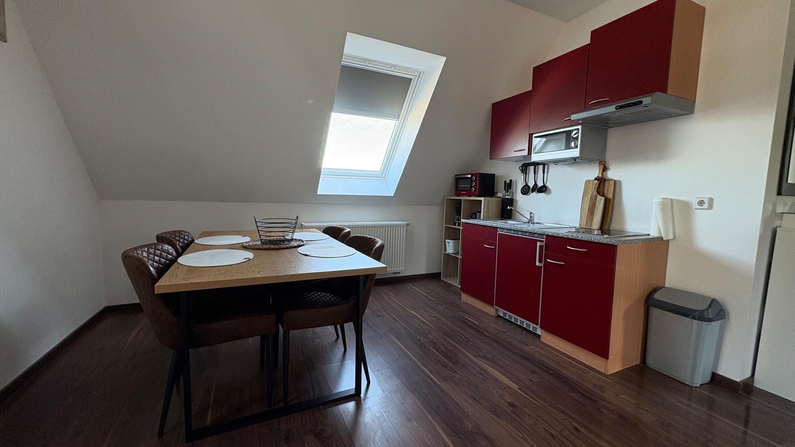 Die Ferienwohnung befindet sich im Dachgeschoss und bietet auf einer Fläche von ca. 55 m² ausreichend Platz für einen erholsamen Aufenthalt. Sie umfasst einen kombinierten Wohn- und Schlafbereich mit integrierter Küche, ein Dusch-Bad und einen Balkon.