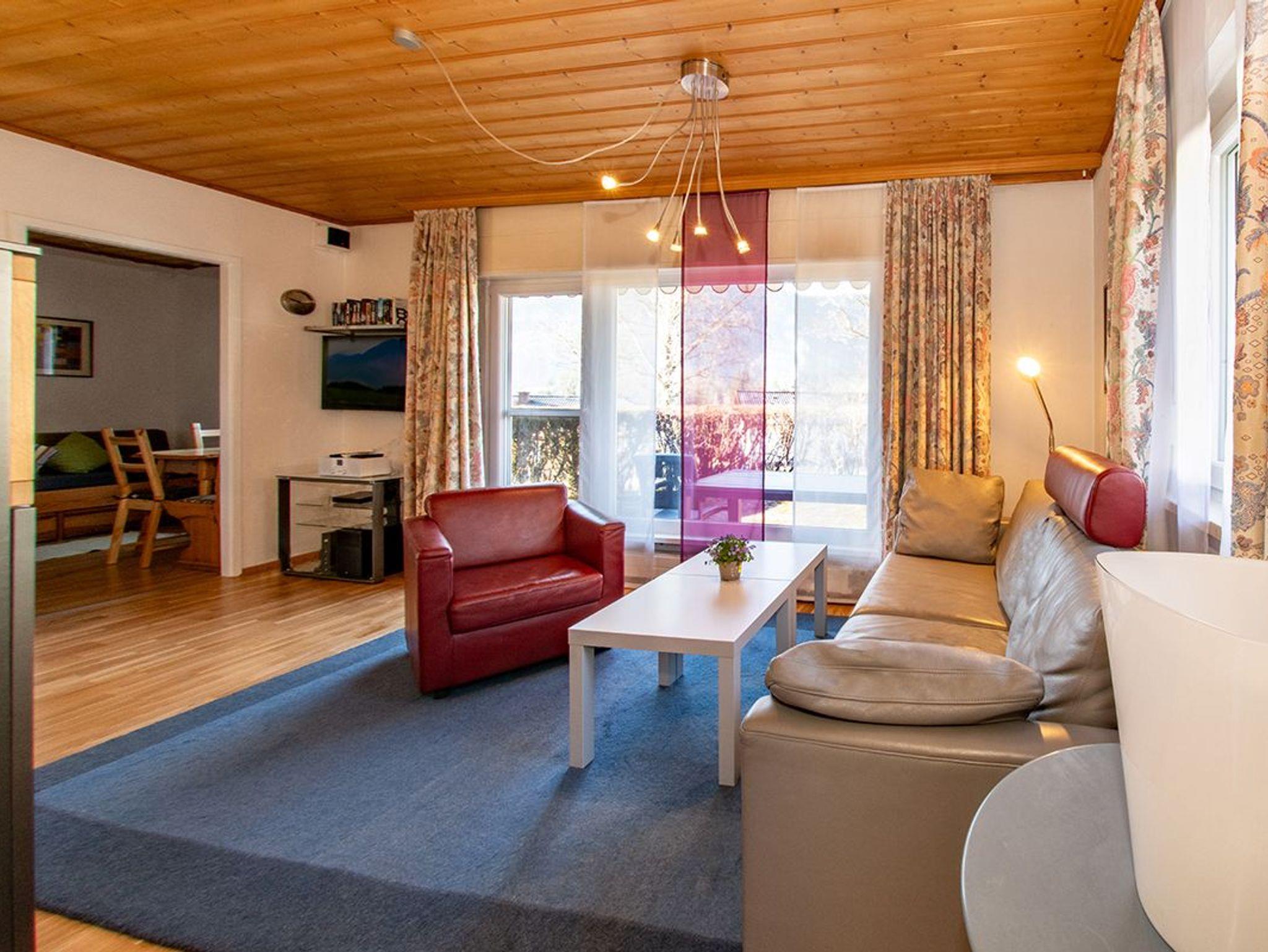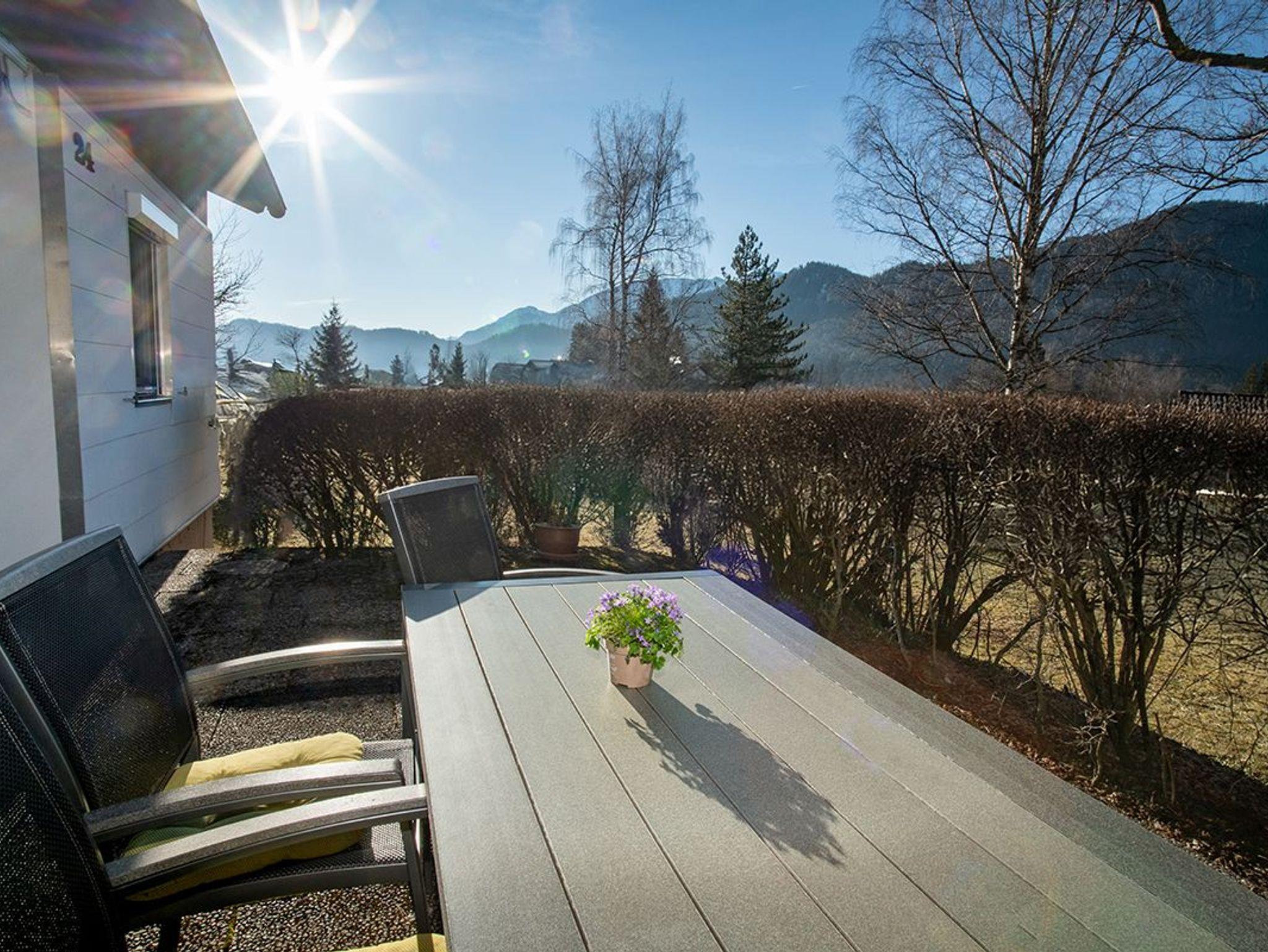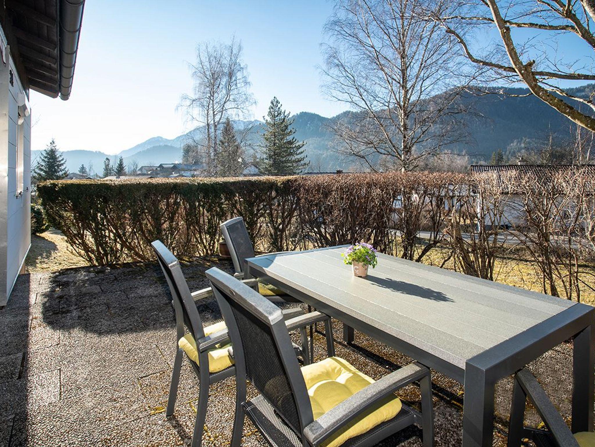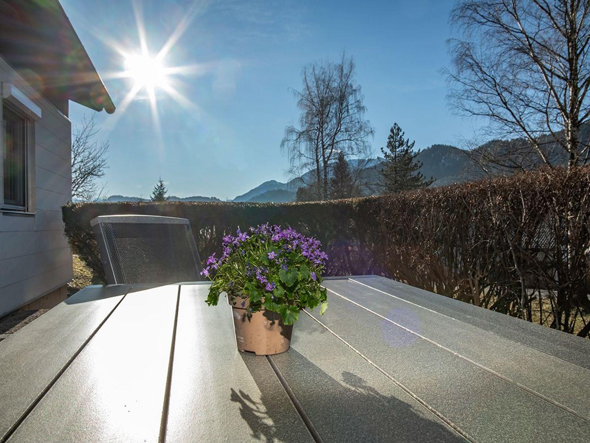 Vor dem Wohnzimmer befindet sich die großzügige, weitgehend uneinsehbare Süd-West-Terrasse mit neuer Tischgruppe und herrlichem Blick auf die Berge. Markise und Gartenmöbel laden dort in der warmen Jahreszeit zum Relaxen oder einem gemütlichen Essen im Freien ein.