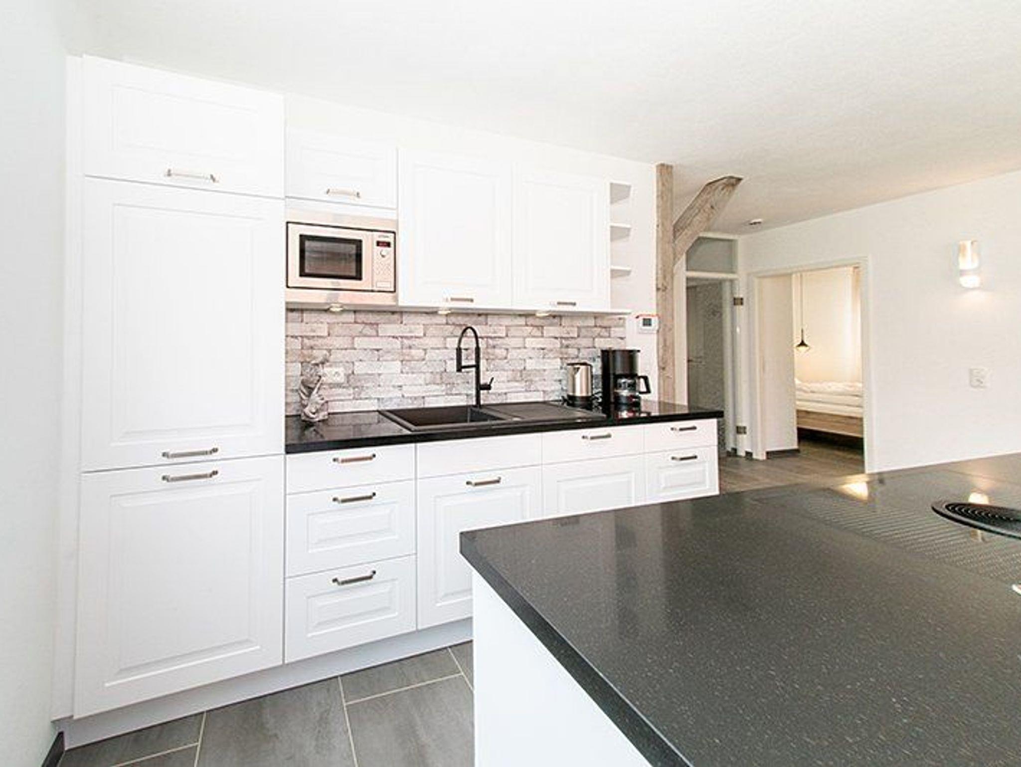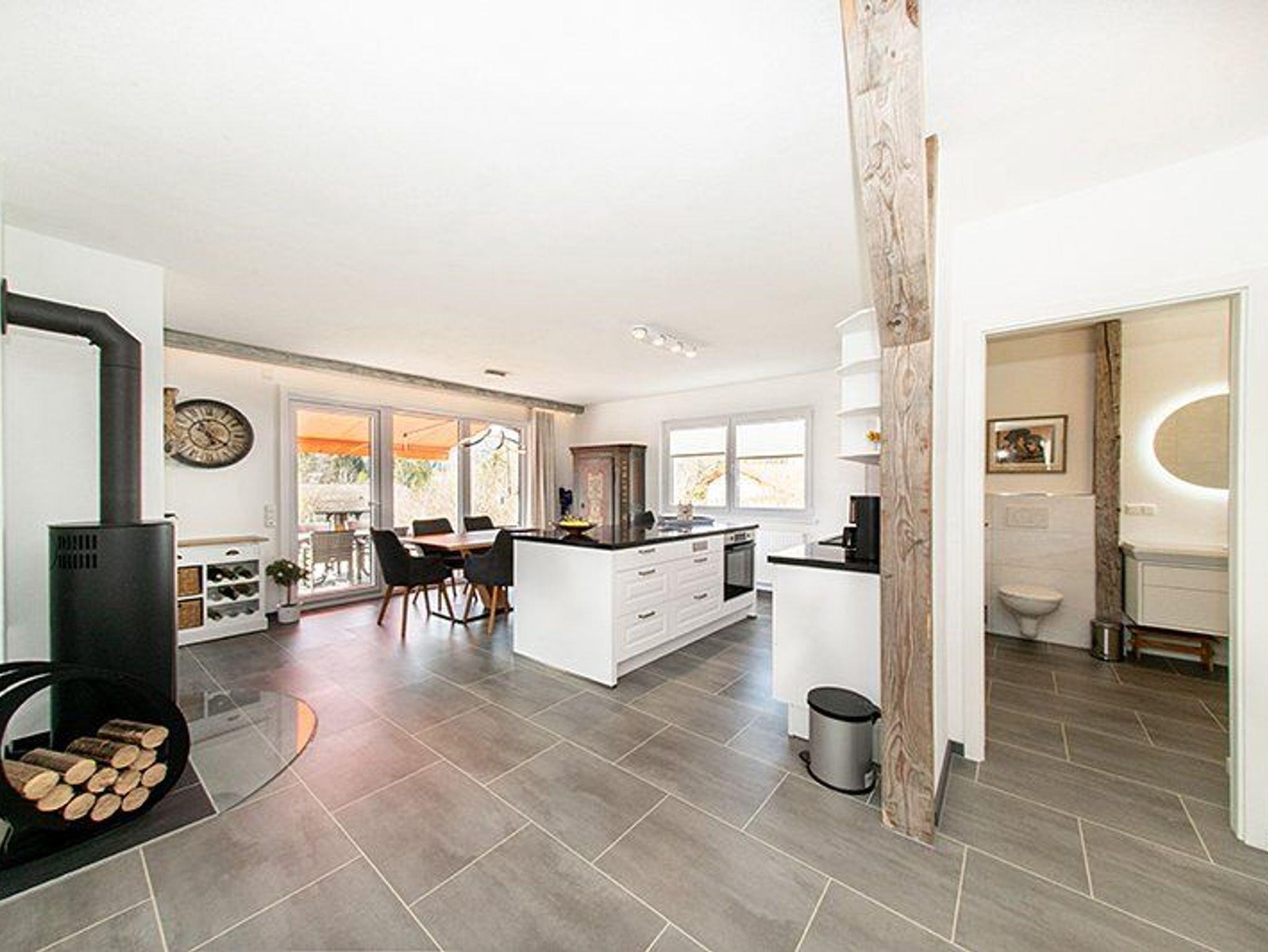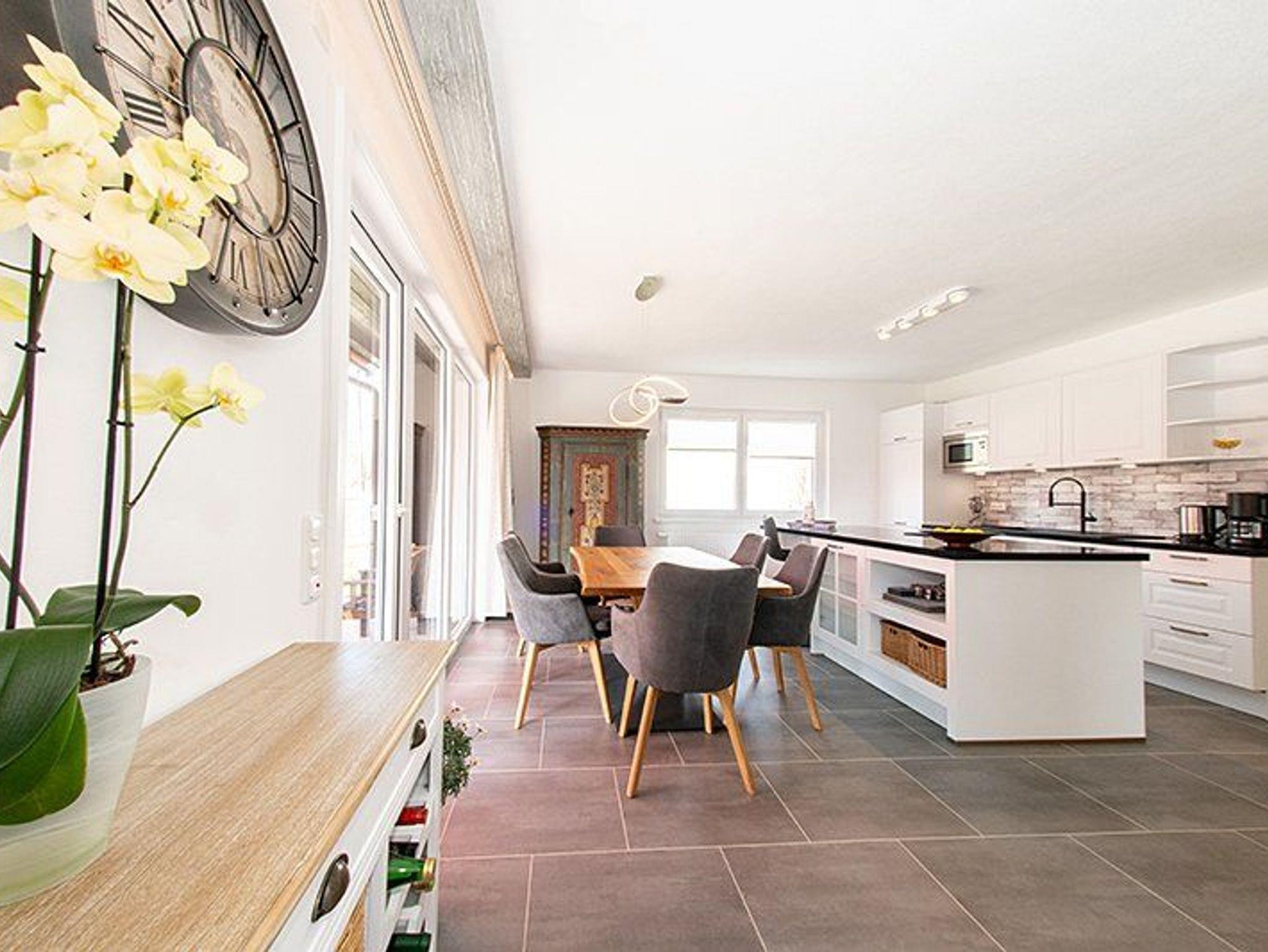 Die offene Wohnküche mit einem großen Esstsich und Kamin bilden das Herzstück des Hauses. Die Kücheninsel mit Bora-Kochfeld lädt zum gemeinsamen Kochen ein. Ein großer Kühlschrank, ein Gefrierschrank sowie eine Spülmaschine und eine Mikrowelle sind selbstverständlich ebenfalls vorhanden. Der Kamin sorgt für gemütliche Wärme an kalten oder grauen Tagen.