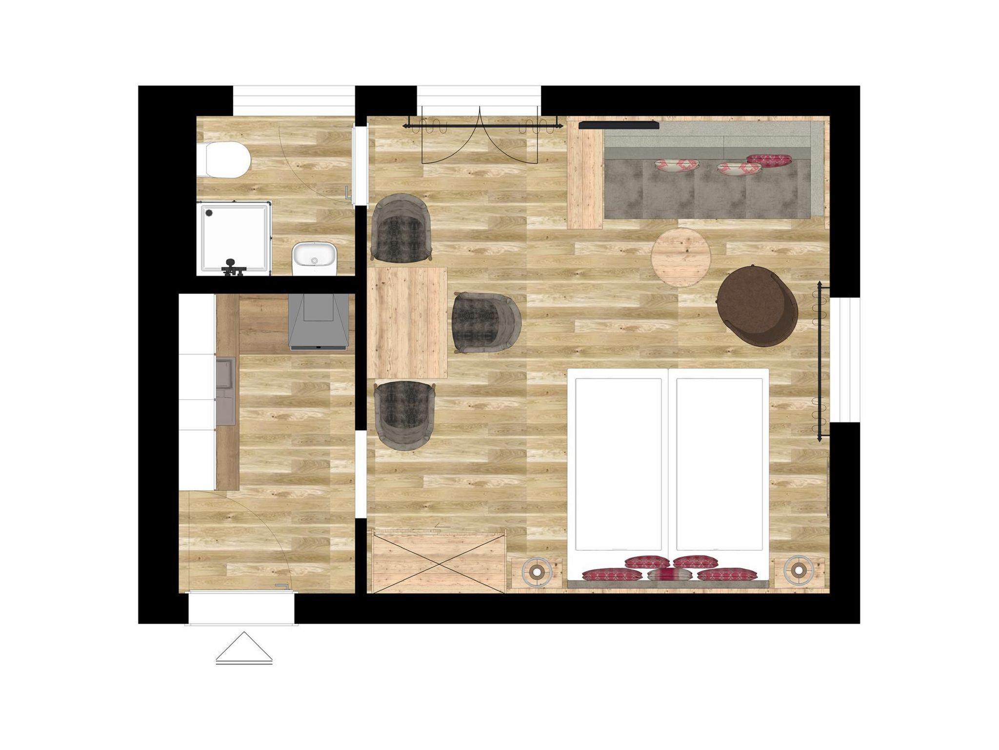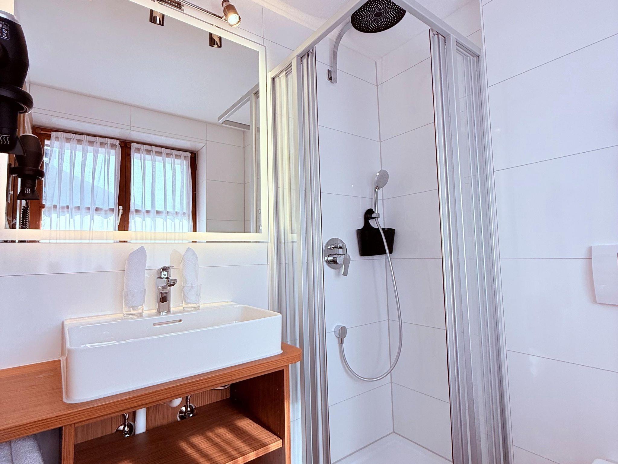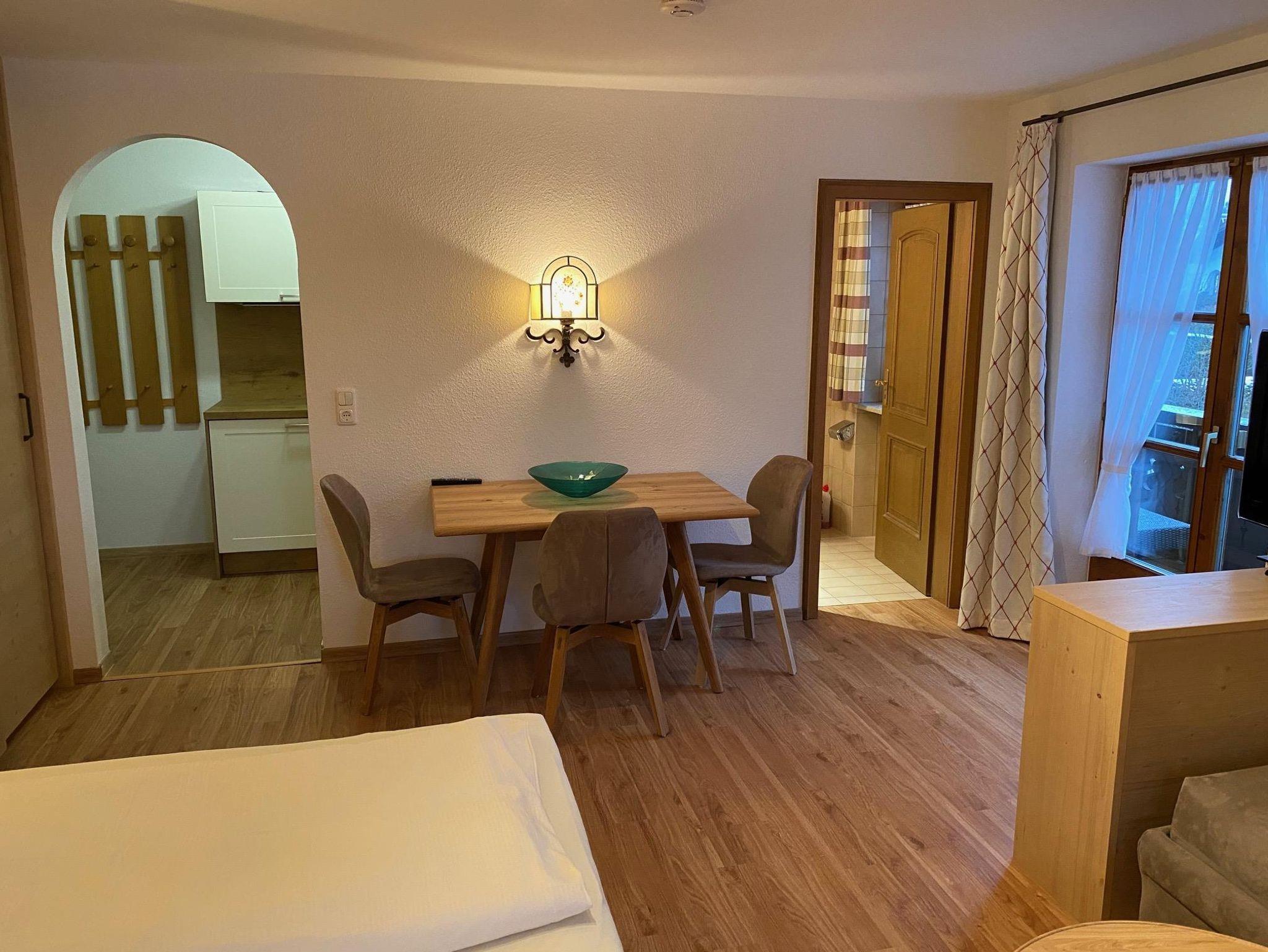 Das Apartment Hohes Schloss befindet sich im ersten Obergeschoss mit sonnigem Westbalkon. Kombinierter Wohn-Schlaf-Raum mit bequemen Doppelbett, Schlafsofa, Esstisch, TV. Durch einen Rundbogen abgetrennte Küche. Bad mit Fenster, Dusche, WC, Waschbecken und Fön.