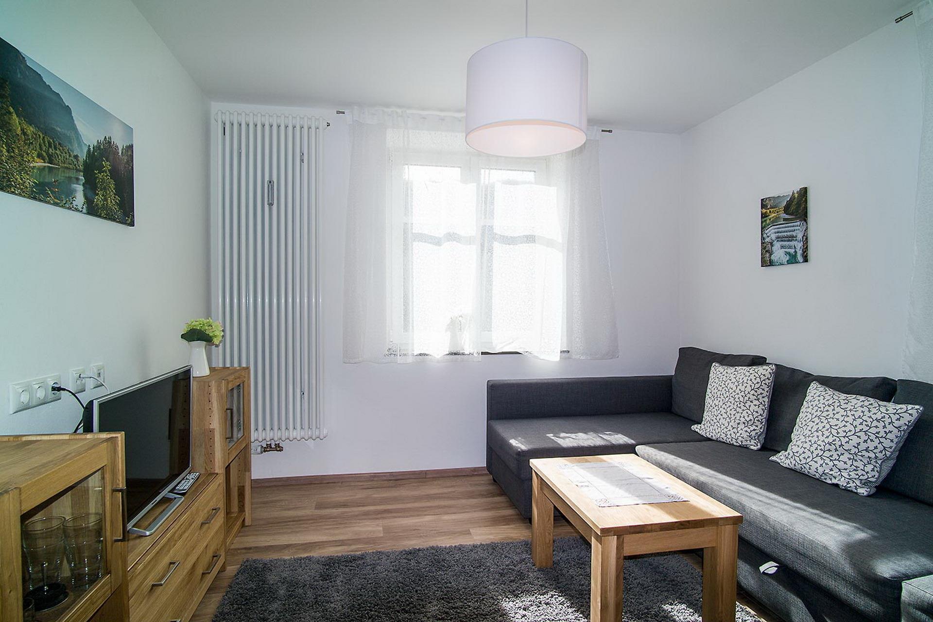 Die moderne Ferienwohnung verfügt über ein separates Schlafzimmer, eine offene Küche mit Essbereich, ein angrenzendes Wohnzimmer mit Eckpolsterganitur, Kabel-TV und einem Zugang zum Südbalkon, ein Badezimmer das mit einer großen Eckglas-Regenschauerdusche, Waschbecken und WC ausgestattet ist.