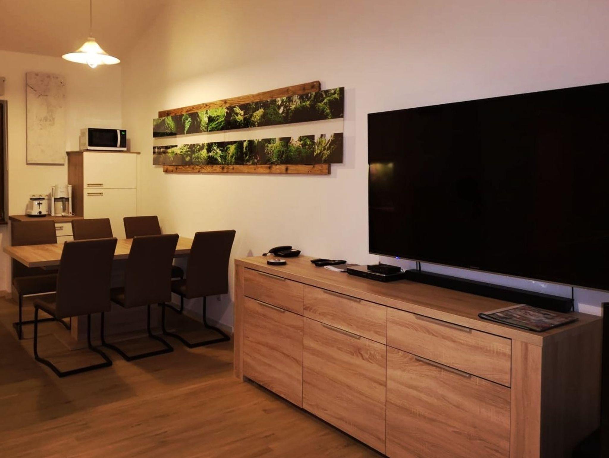 Der große Wohnbereich bietet viel Platz zum Spielen und Relaxen. Der Fernseher mit angeschlossener Soundbar sowie DVD Player ermöglicht entspannte Fernsehabende. Das große Ecksofa lädt zu spaßigen Spieleabenden oder gemütlichen Lesestunden ein. Durch den eingebauten Pellet-Ofen kann man sicher und per Knopfdruck die wohlige Wärme des Feuers genießen. Und dies ohne anzünden, Holz nachlegen oder Asche wegräumen. Der Ofen ist einfach über einen Touchdisplay zu bedienen.