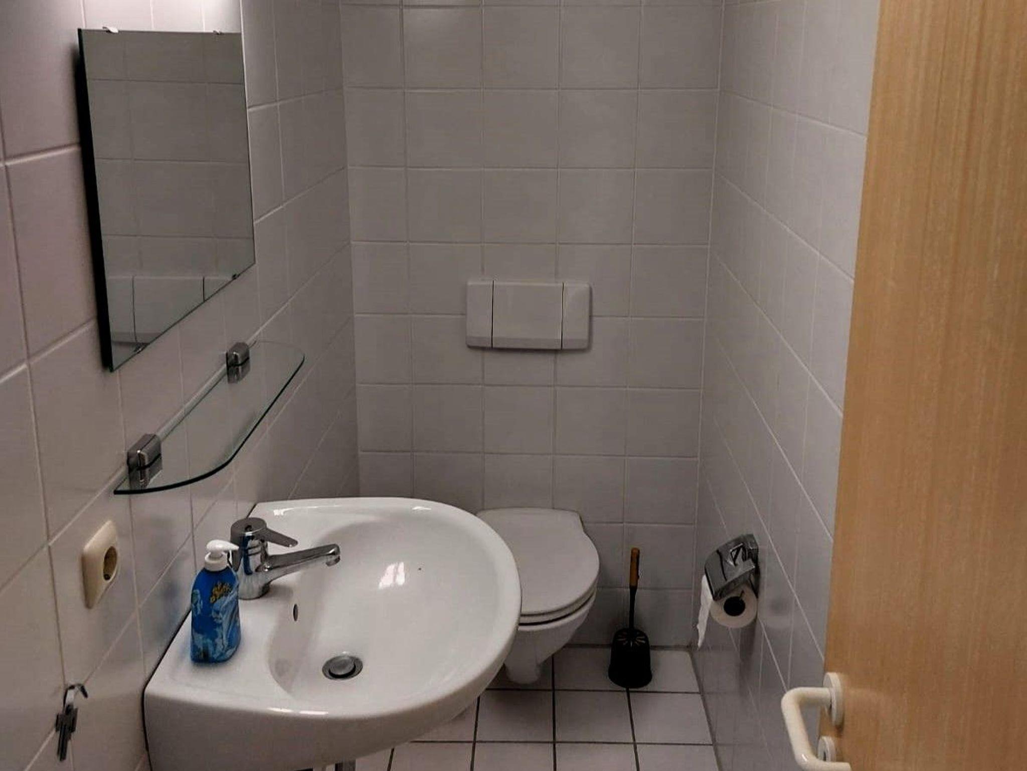 Badezimmer mit Dusche/WC, zwei großen Waschbecken, großem Spiegel. Seperates Gäste-WC, ebenfalls mit Spiegel und großem Waschbecken.