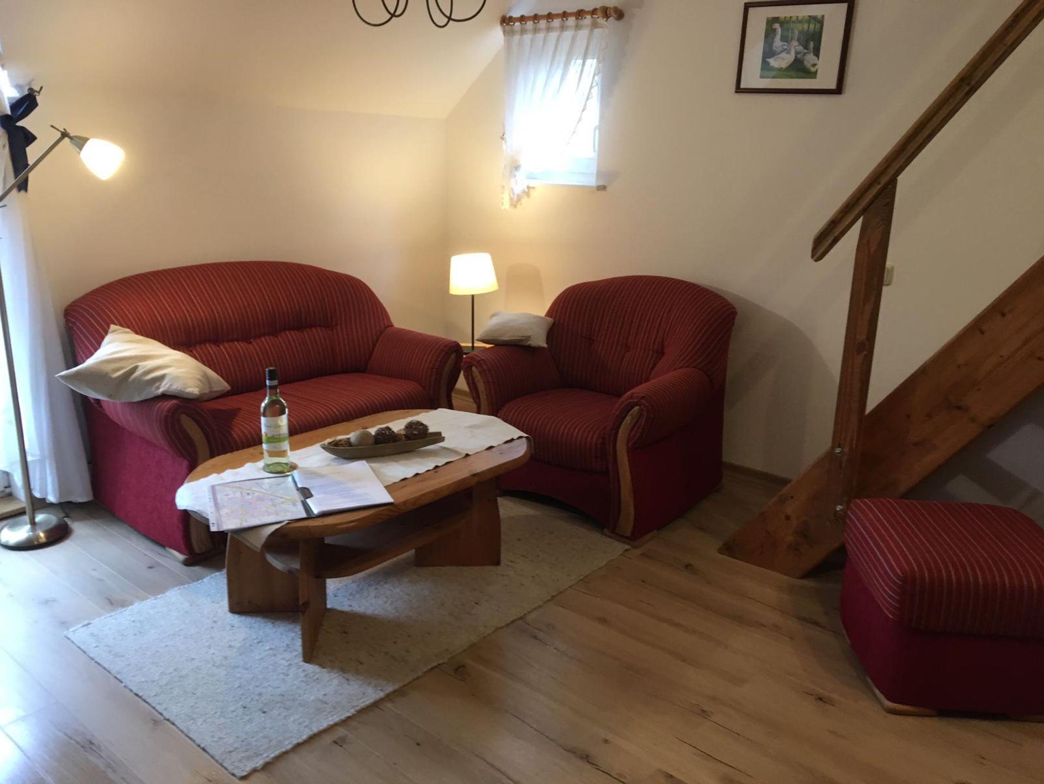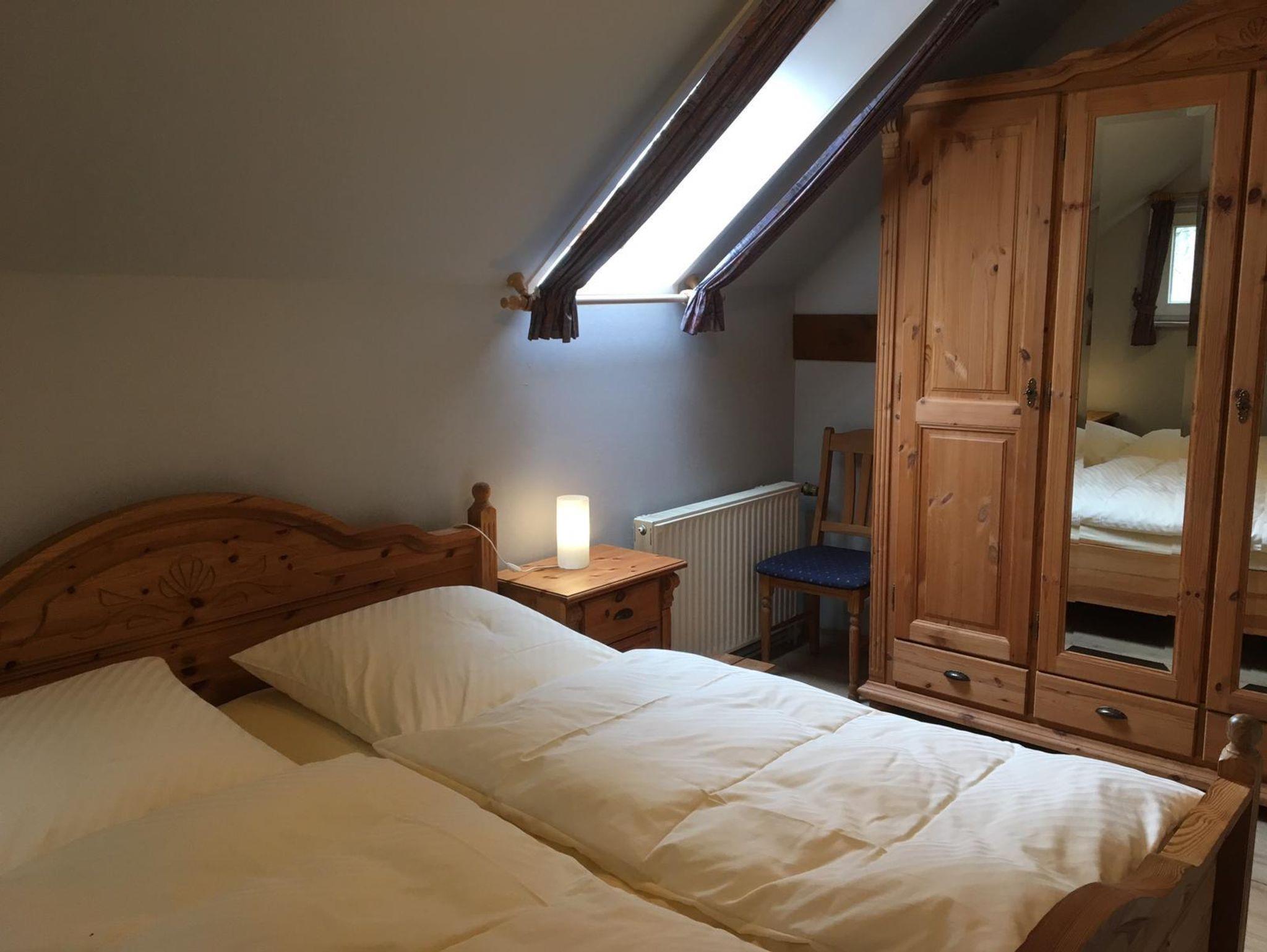 Die Ferienwohnung ist 47 m² groß und geht über zwei Etagen. Sie ist wie folgt aufgeteilt: ein separates Schlafzimmer, ein Bad mit Dusche/WC, ein offenes Wohn-Esszimmer mit einer Küchenzeile. Aus dem Wohnbereich führt eine etwas schmalere Holztreppe in das gemütliche, unterm Dach gelegene Schlafzimmer mit zwei Einzelbetten Die Küchenzeile ist komplett eingerichtet mit Elektroherd, Backofen, Mikrowelle, Toaster, Wasserkocher und Kaffeemaschine (keine Spülmaschine). In der Wohnung befinden sich auch eine Stereoanlage und ein TV-Gerät. Ein Babybett kann zusätzlich aufgestellt werden, hierfür berechnen wir inkl. Bettwäsche einmalig 10,00 Euro.