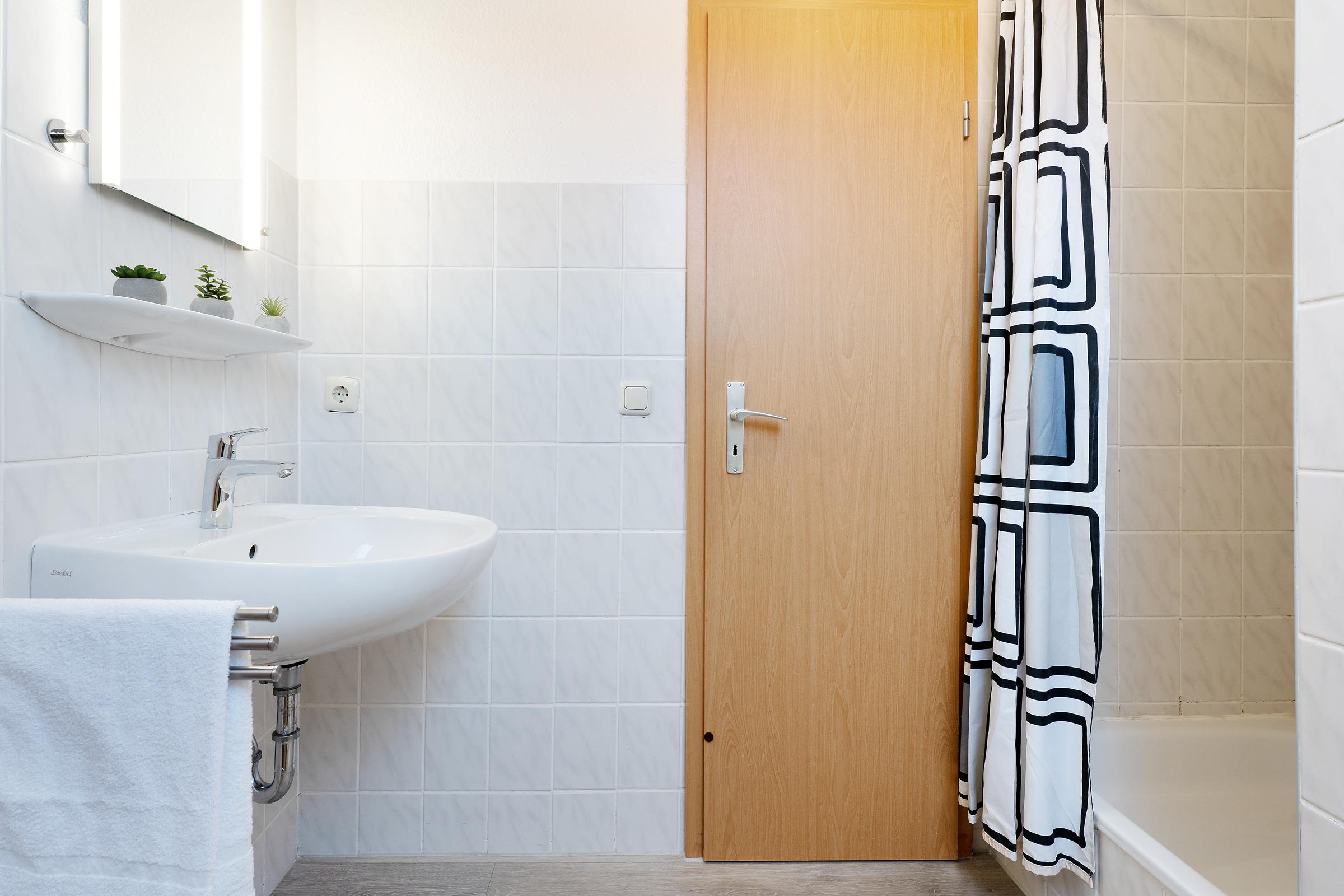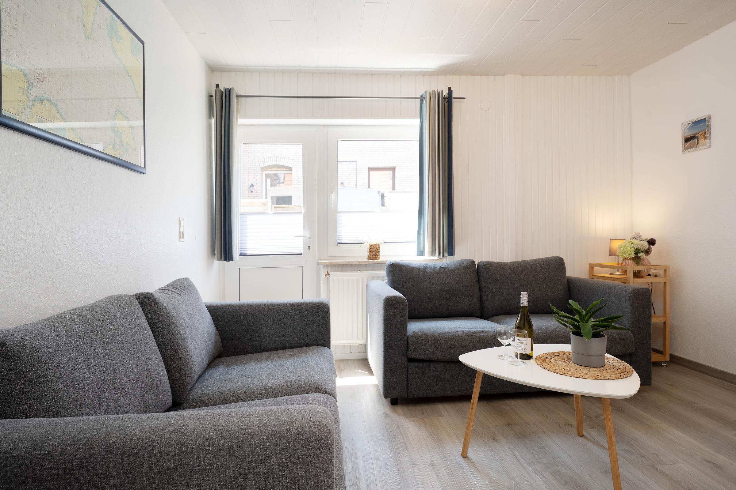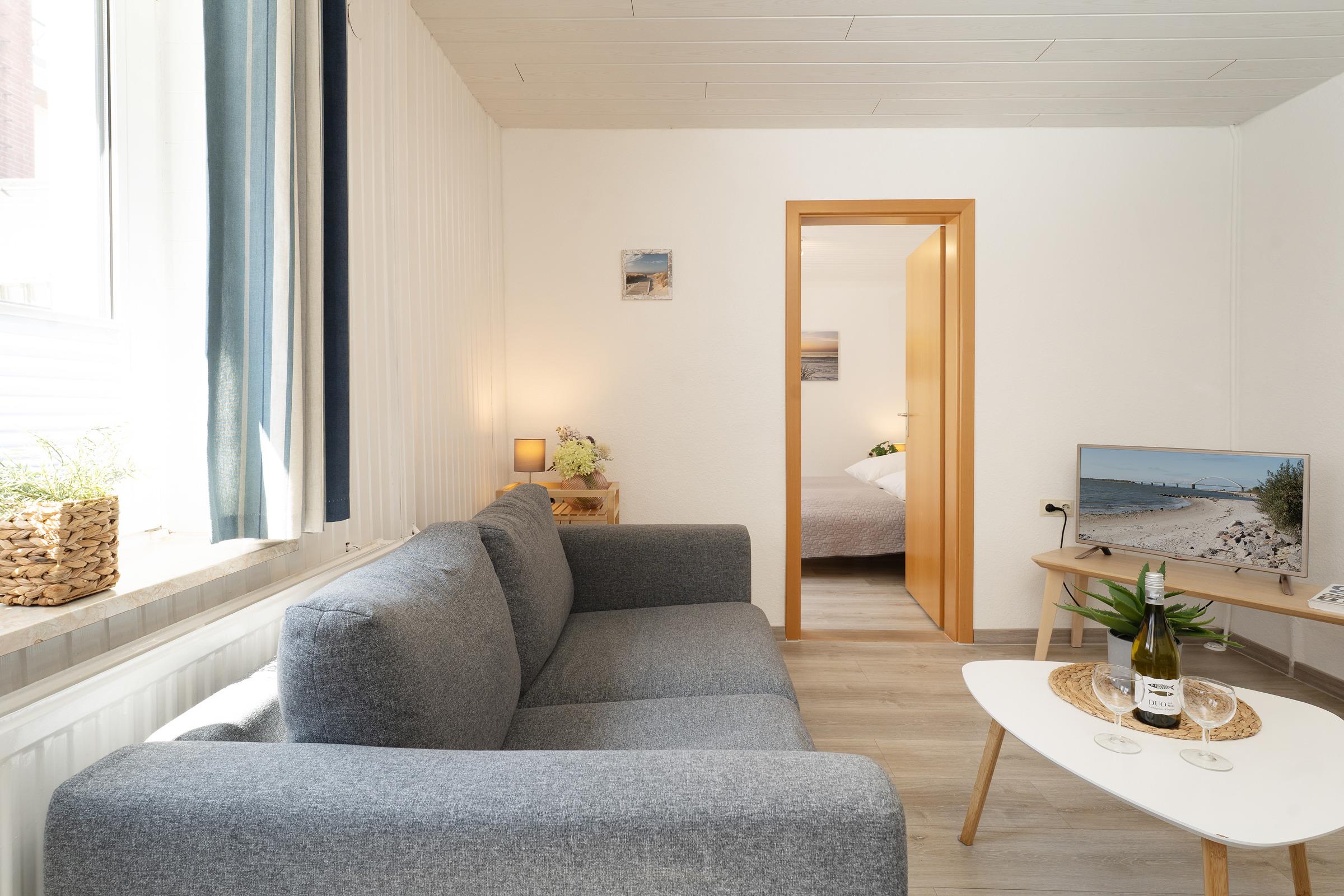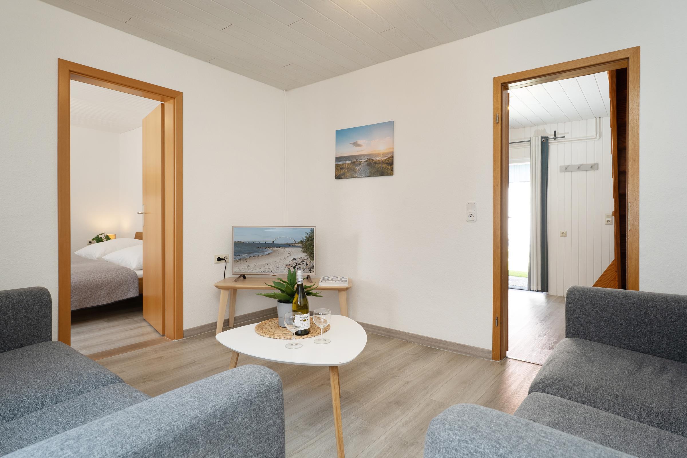Der helle Wohnbereich lädt mit zwei komfortablen Sofas und einem Fernseher zum Entspannen ein. Im Gemeinschaftsgarten stehen Sonnenliegen und ein Strandkorb zur Verfügung – perfekt für sonnige Urlaubstage. Die gut ausgestattete Küche bietet alles, was das Herz begehrt: Mikrowelle, Kühlschrank mit Gefrierfach, Kaffeemaschine und vieles mehr. Angrenzend sorgt der Essbereich für gesellige Stunden bei gemeinsamen Mahlzeiten. Zwei separate Schlafzimmer mit jeweils einem Doppelbett (2x 90x200 cm) bieten erholsamen Schlaf. Das moderne Bad ist mit Dusche und WC ausgestattet.