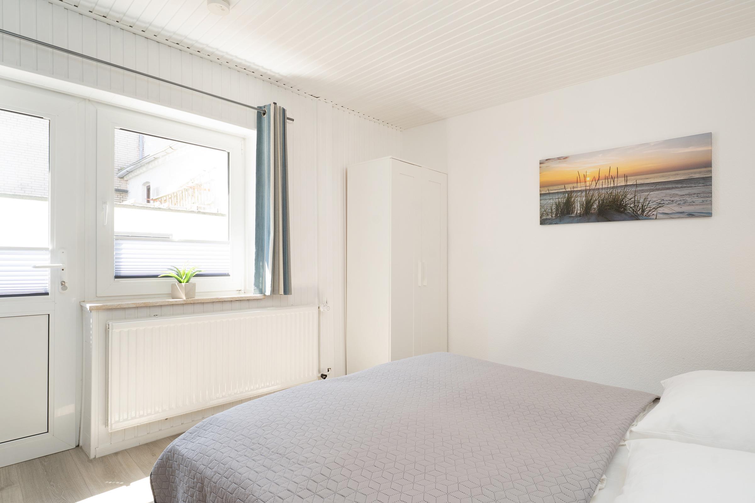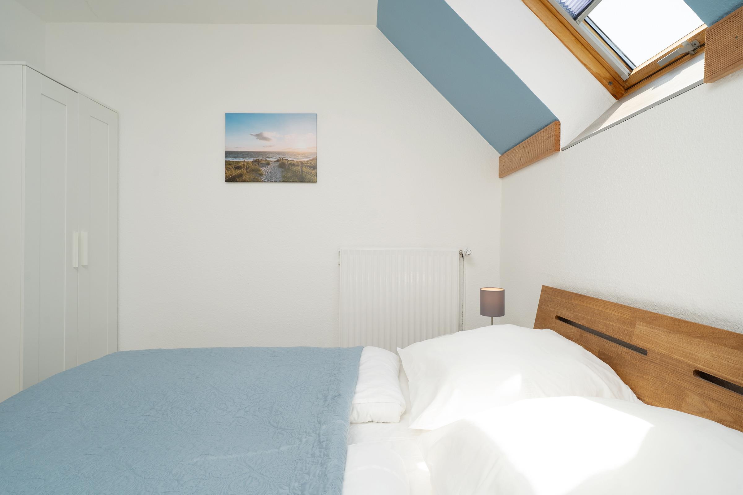Schlafzimmer (1. OG): 1 Doppelbett (2x 90x200 cm), Kleiderschrank, Verdunkelung: Plissees und Vorhänge, kein Platz für ein Babybett