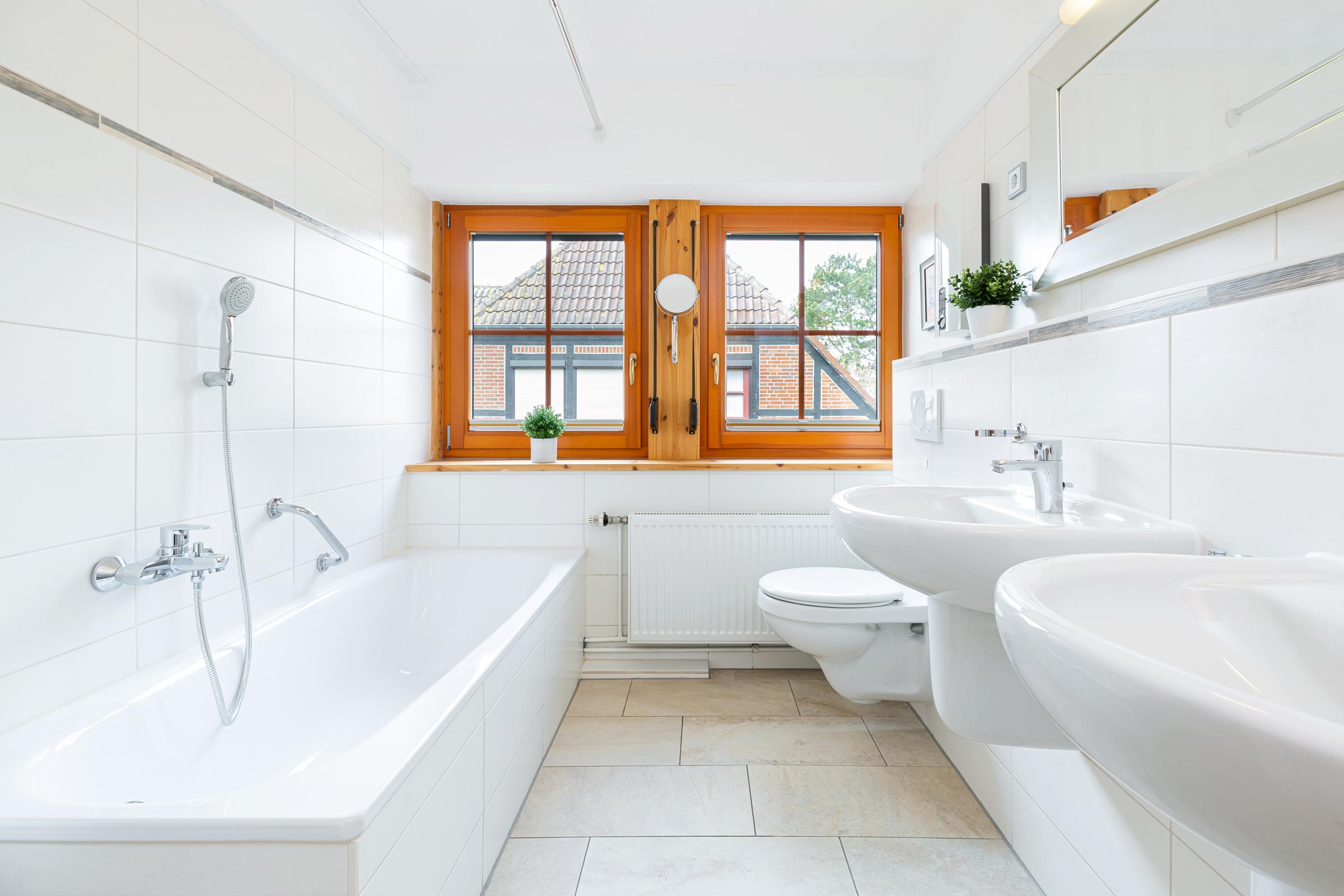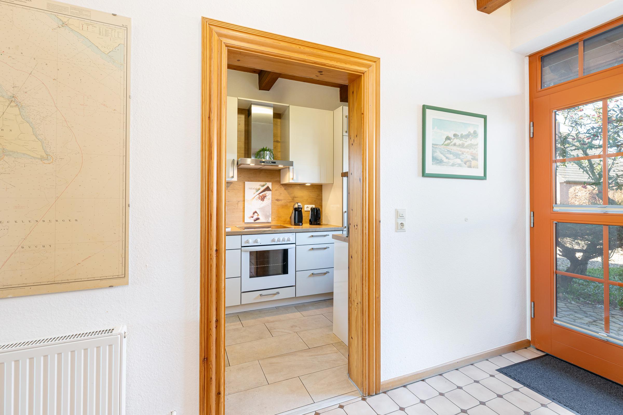 Im Erdgeschoss befindet sich ein großzügiger Wohnbereich mit Sitzecke und Essbereich. Der Blick geht über die Terrasse mit Gartenmöbeln in den großzügigen Garten, über Felder und Wiesen mit freier, unverbauter Sicht Richtung Fehmarnsundbrücke. Der rustikale Kaminofen ist im Wohnbereich ein schönes Highlight: Er spendet an kühleren Tagen wohlige Wärme. Ein großer Fernseher mit Sat-Receiver, Blue-Ray-Player, Radio- und CD-Player sorgt für die richtige Atmosphäre und das richtige Programm. In der sehr gut ausgestatteten Küche finden Sie z. B. Spülmaschine, Herd mit Cerankochfeld, Backofen, Kühlschrank mit Eisfach, Mikrowelle und Kaffeemaschine. Ein Gäste-WC mit Waschmaschine und Trockner, eine Abstellkammer für Ihre Utensilien und ein großer Flur mit Garderobenschrank sind zusätzlich vorhanden.