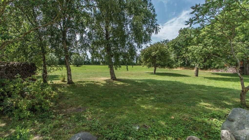 Von dem Wohnraum gelangen sie auf eine Terrasse und haben einen freien Blick auf Wiesen und Felder.