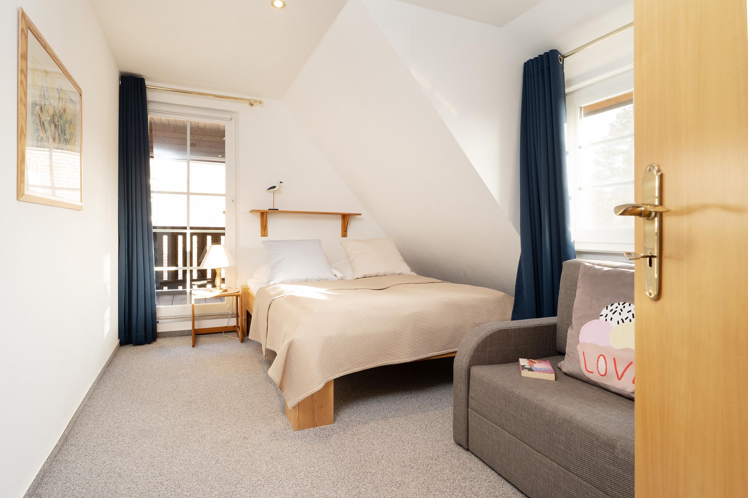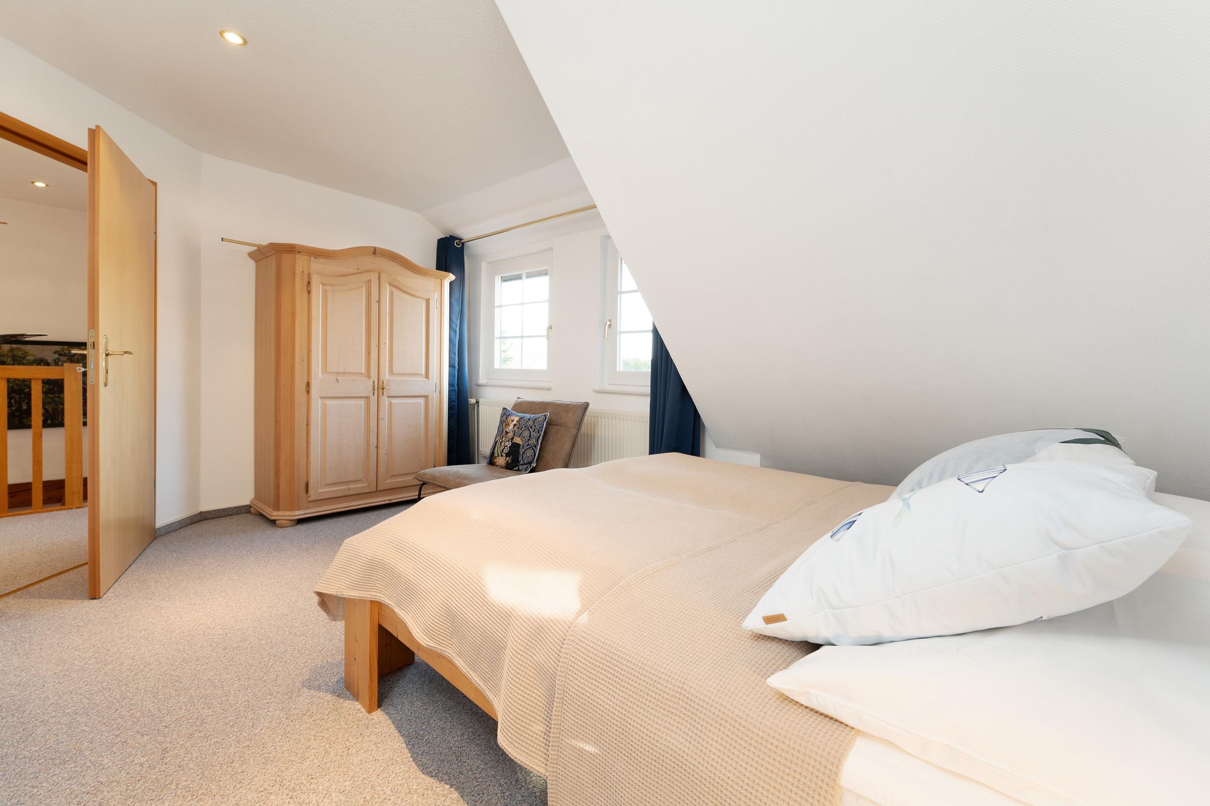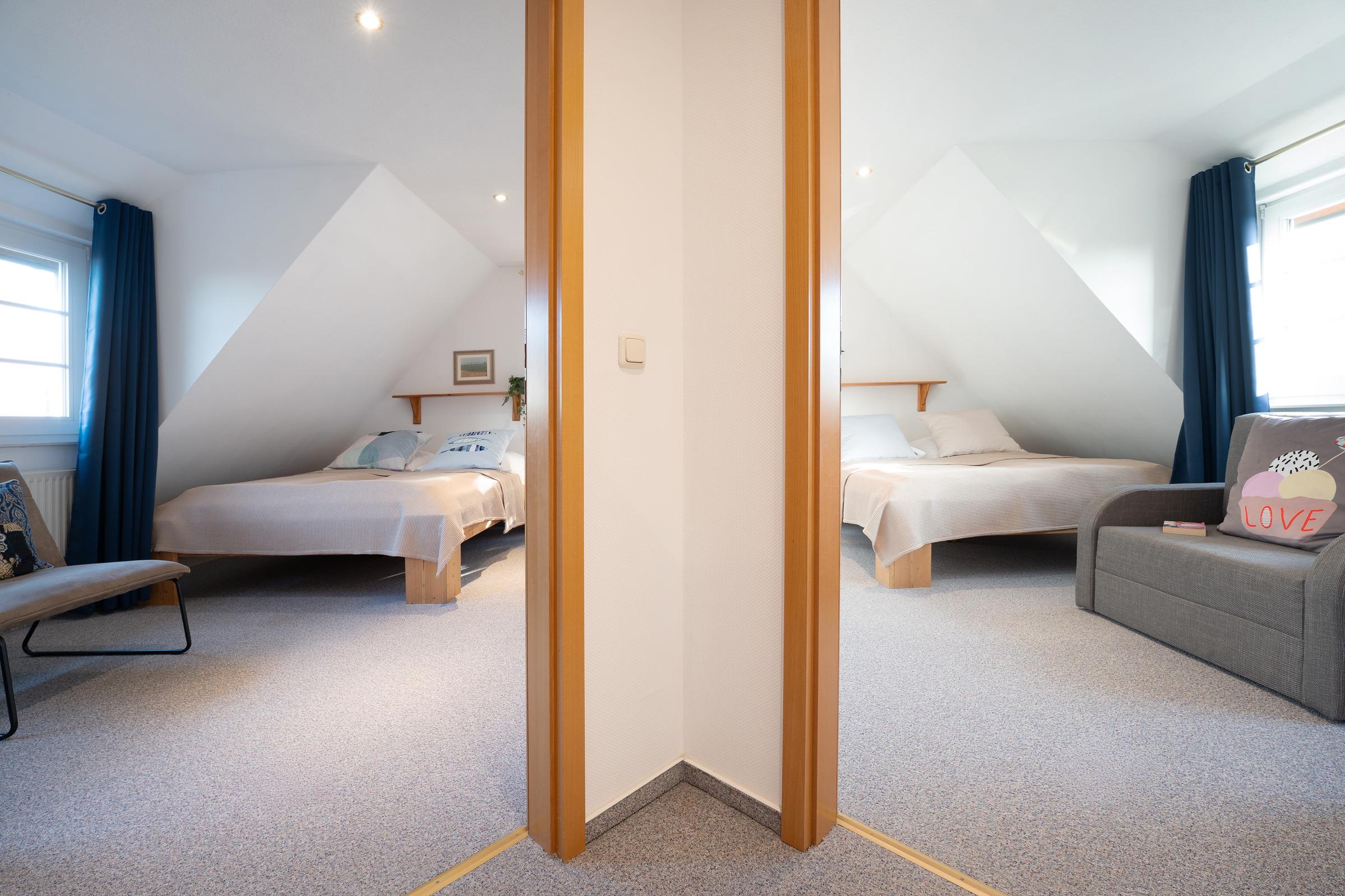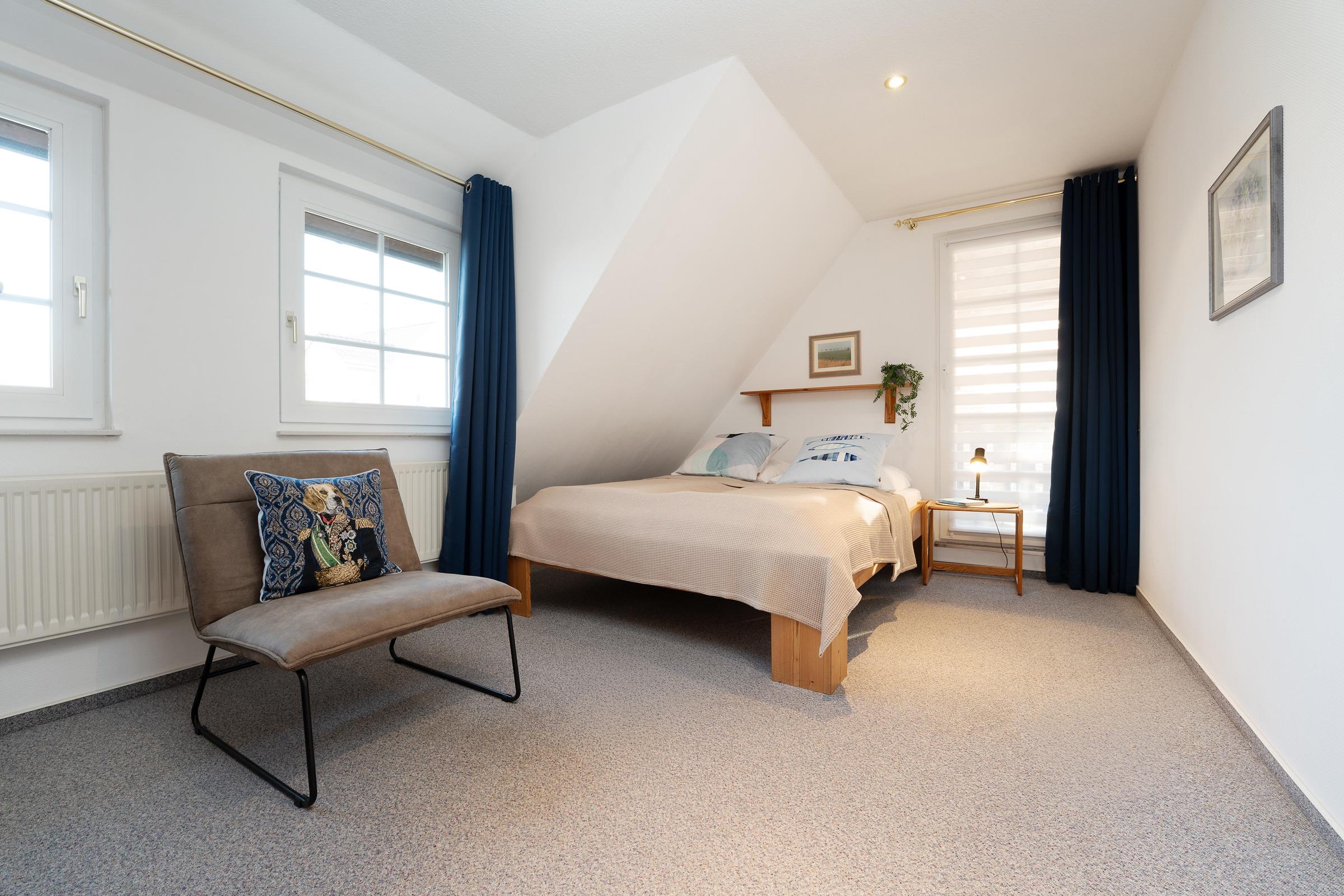 Schlafzimmer 3 (1.OG): 1 Doppelbett (2x 80x200 cm), Verdunkelung: Verdunkelungsvorhänge, kein Platz für ein Babybett vorhanden