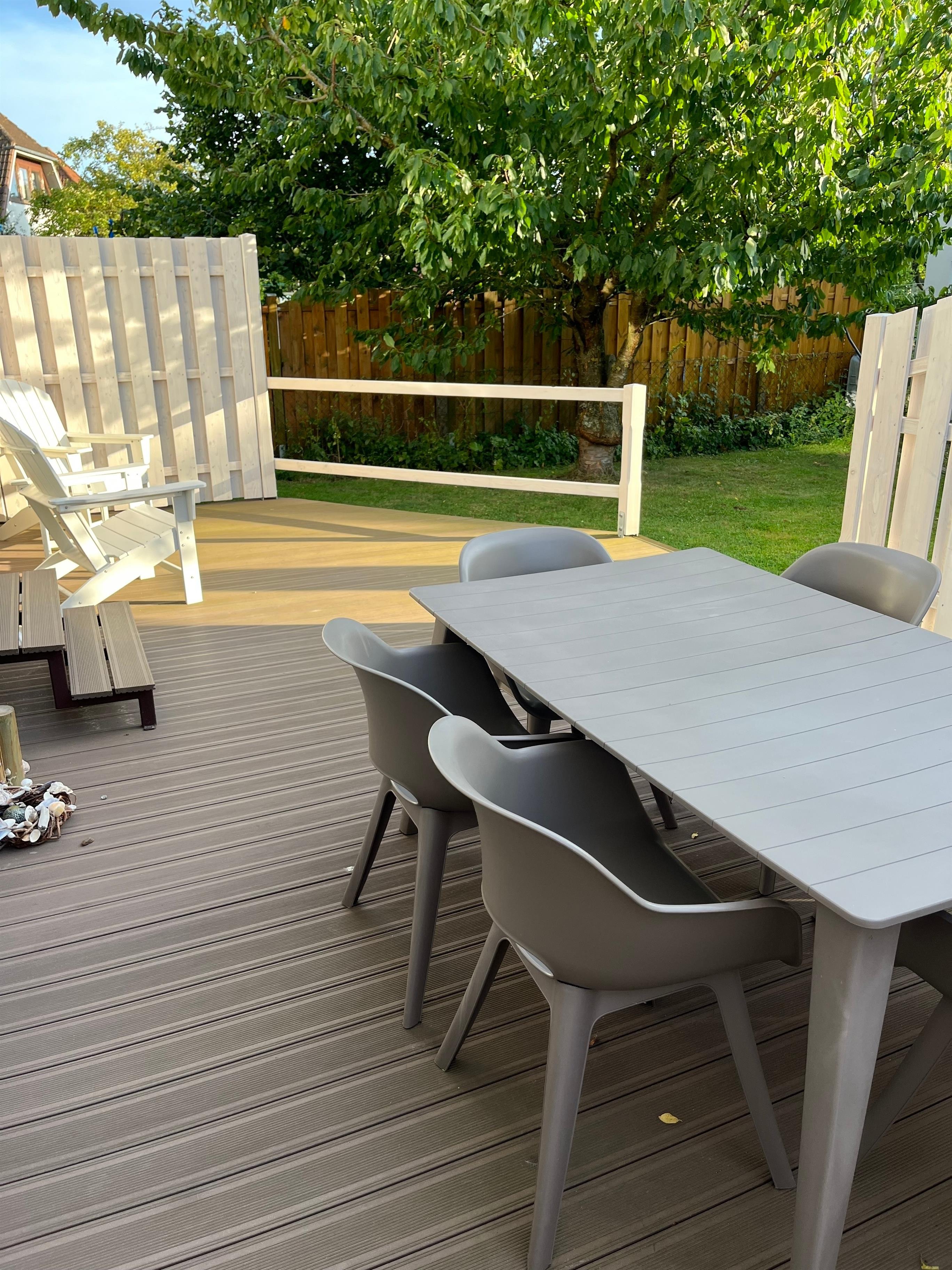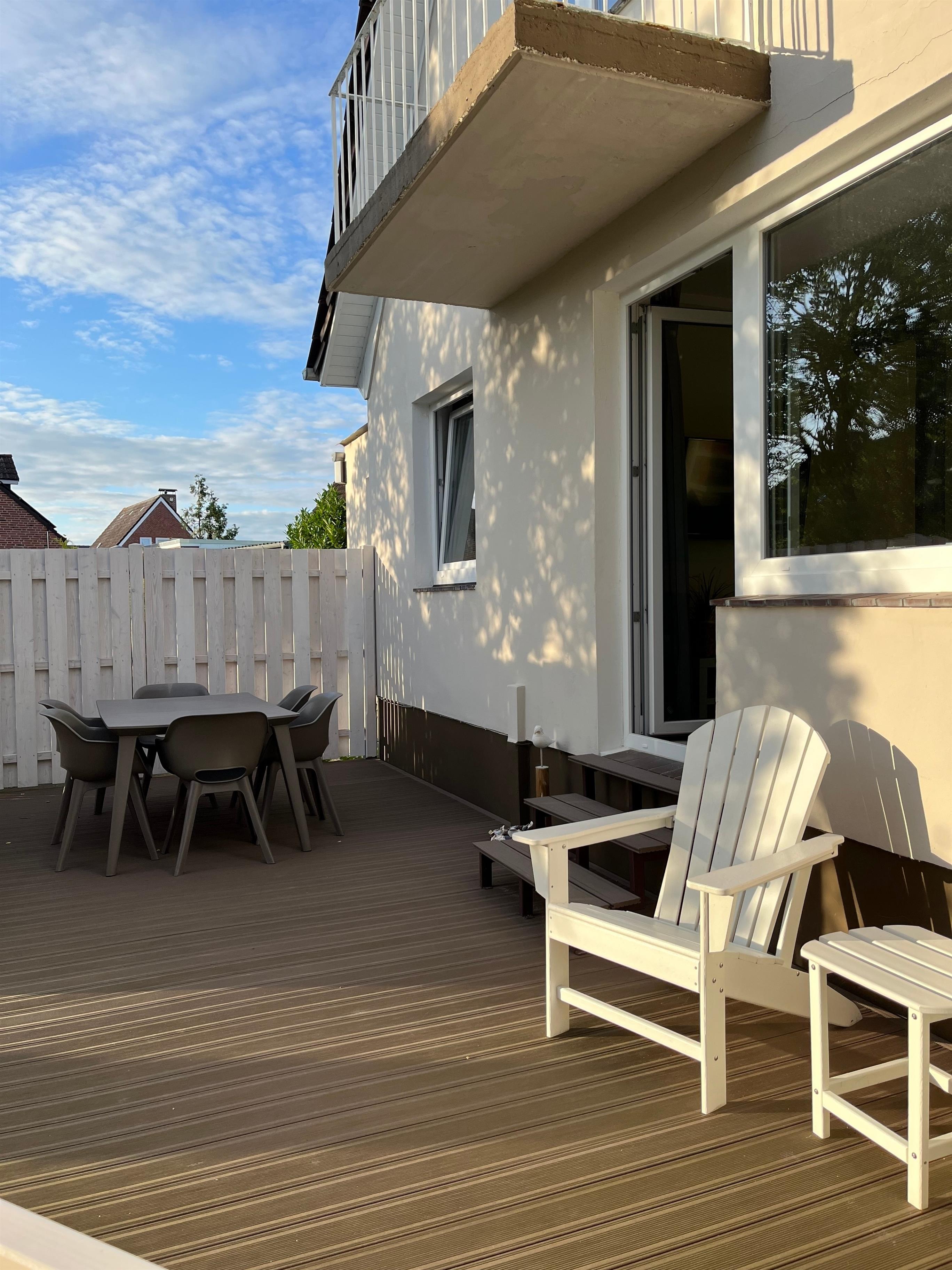 Große Terrasse mit einem Esstisch und sechs Stühlen, zwei Sonnenliegen. Gemauerter Außengrill. Große Rasenfläche mit Obstbäumen. Südlage mit traumhaften Sonnenuntergängen. Garten zu alleinigen Nutzung. Auch Surfer und Kiter können gerne ihr Material ausbreiten und trocknen lassen.