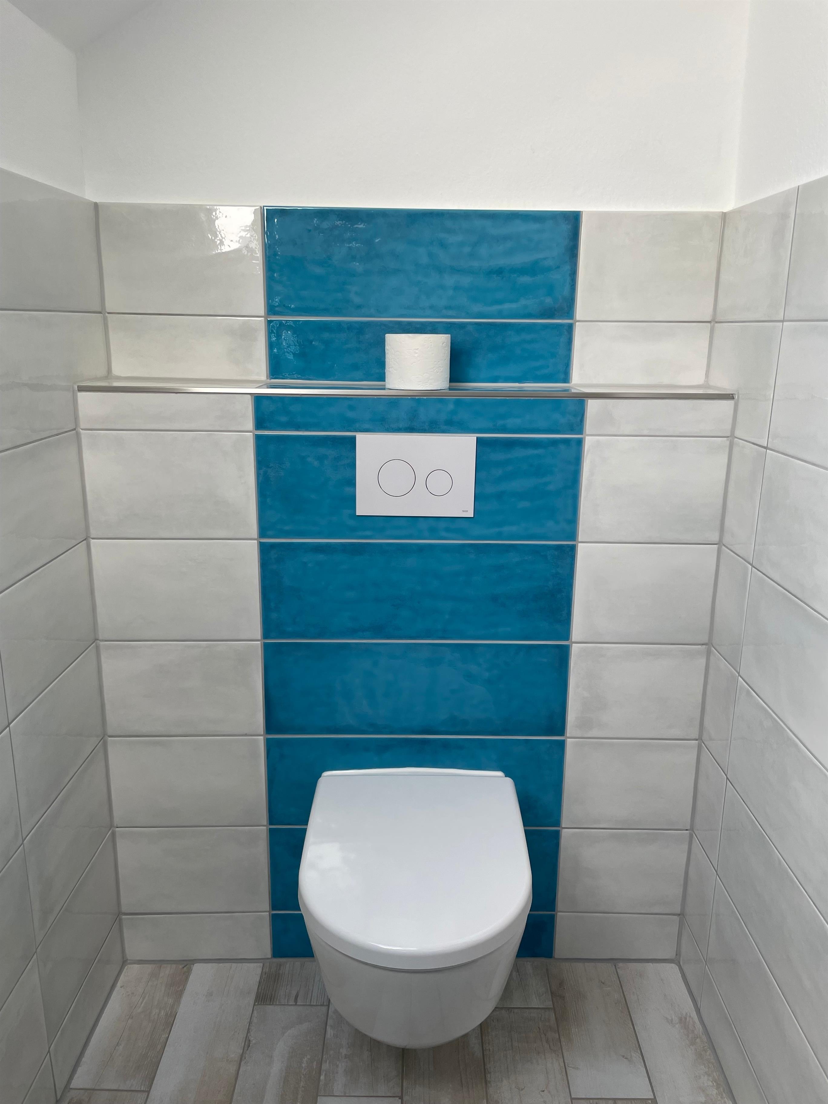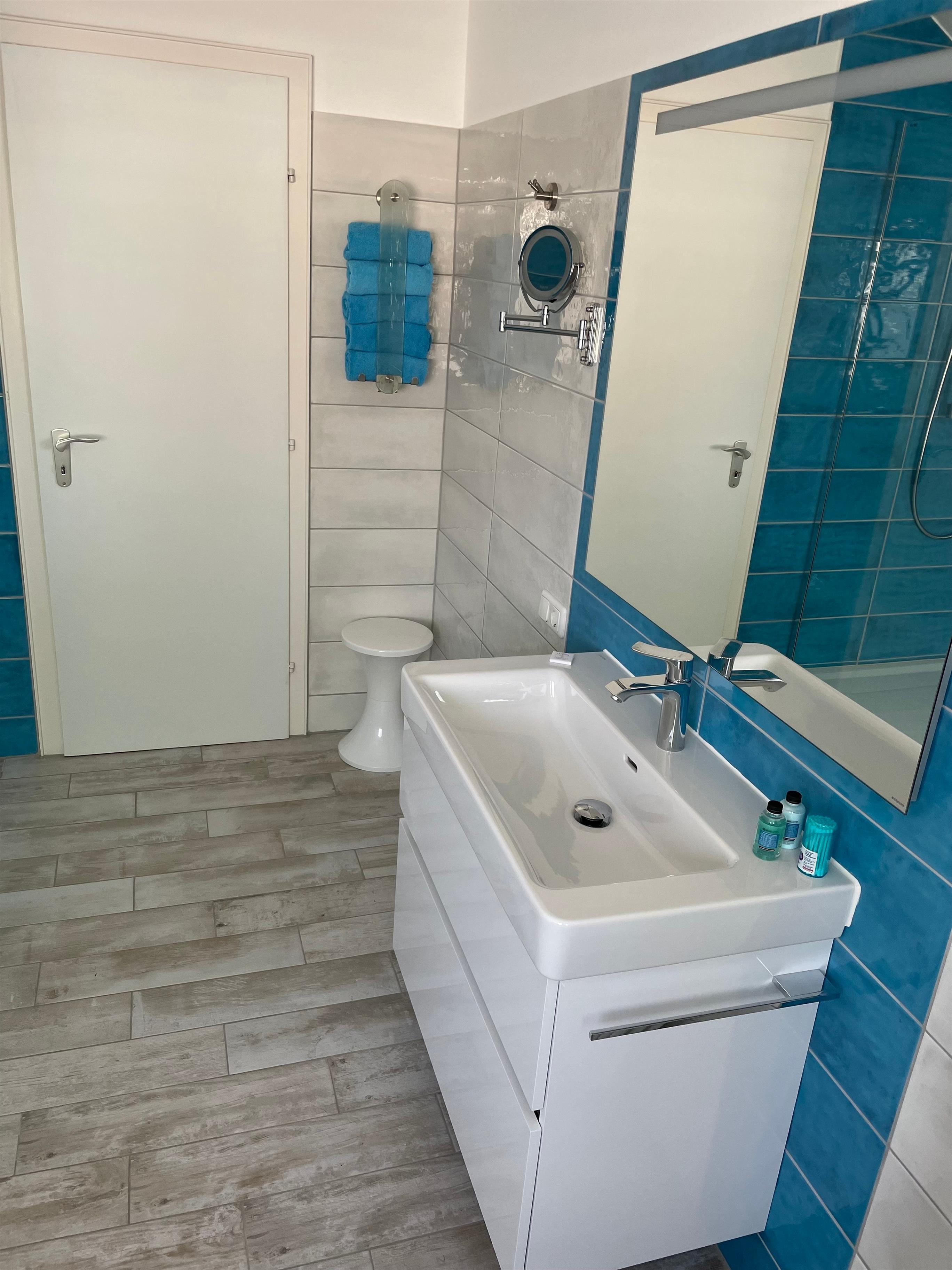 Die Badestube ist mit Badewanne, Dusche, Bidet und zwei Waschbecken ebenfalls vollständig eingerichtet.