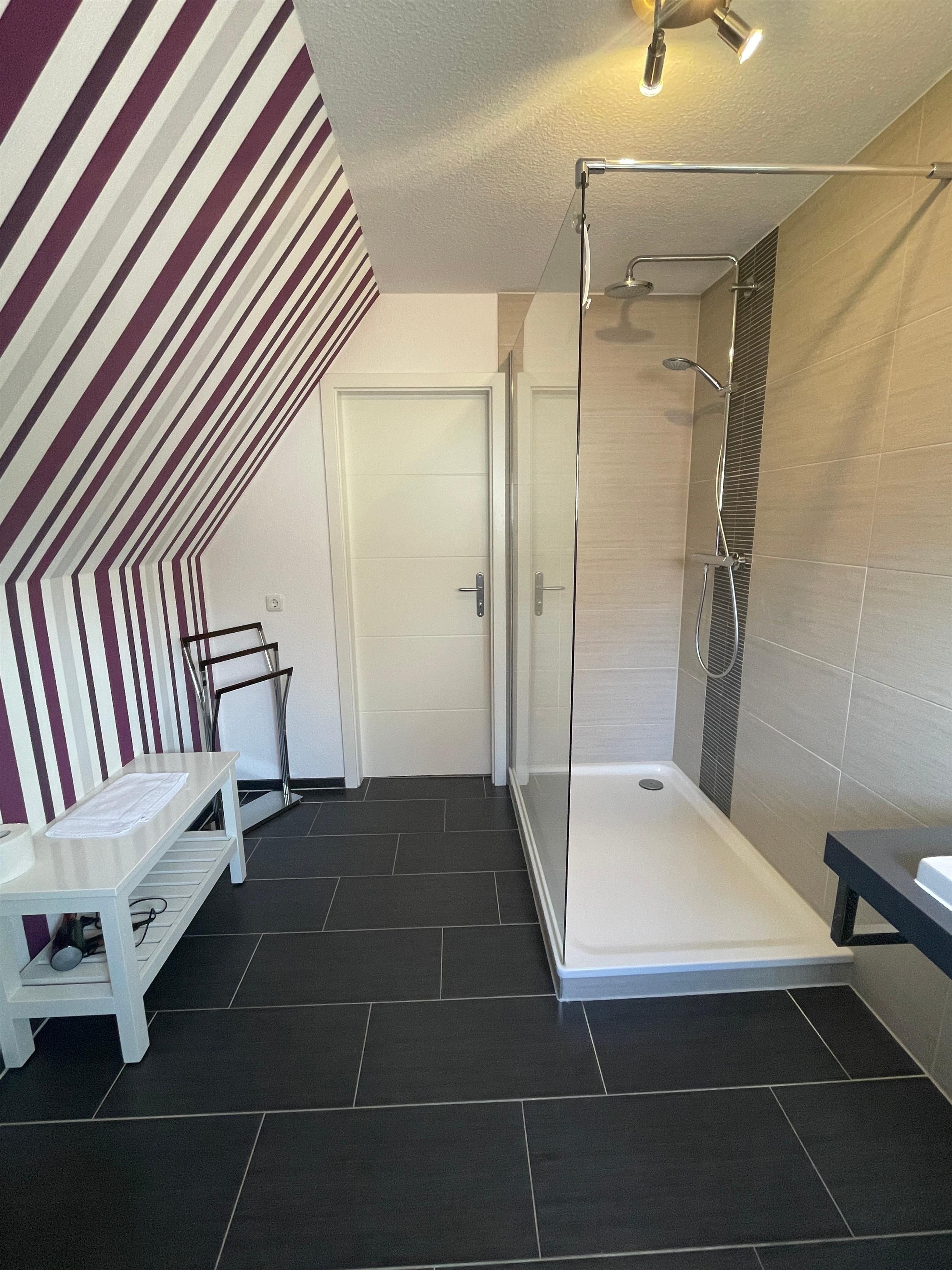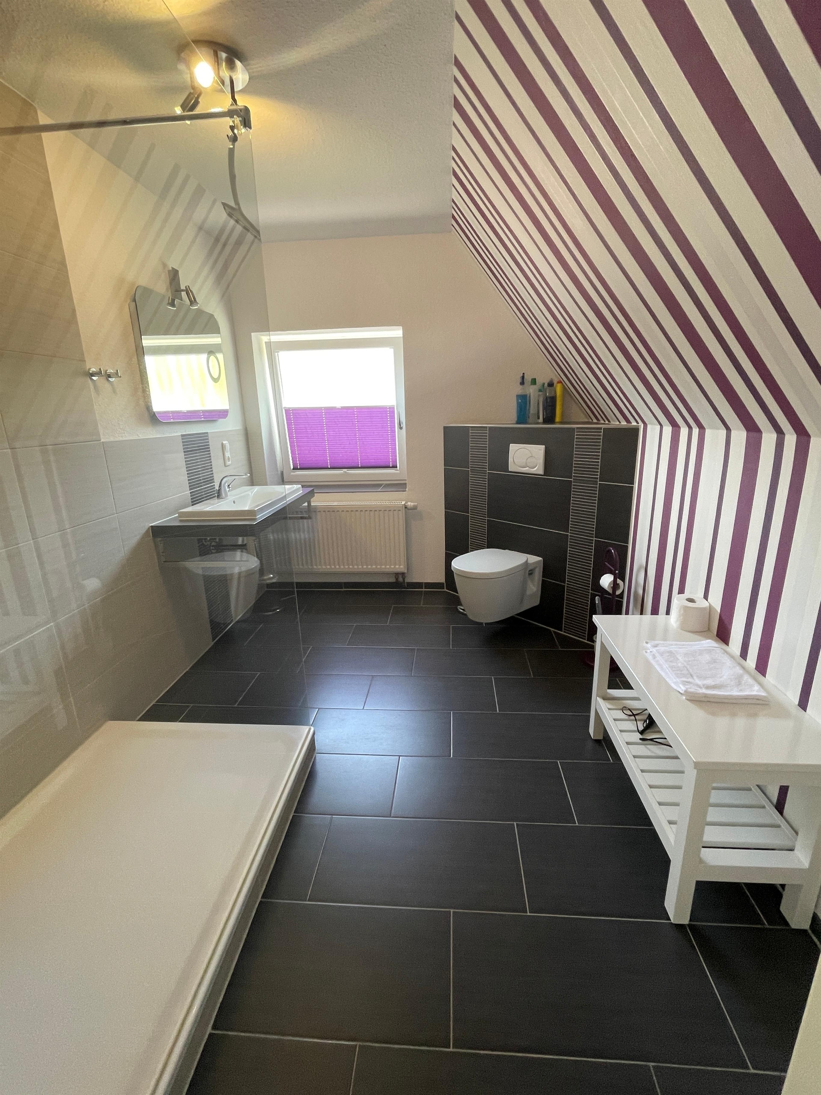 Das stilvolle Badezimmer bietet Qualität und Komfort. Es überzeugt besonders durch seine Größe und tolle Farbwahl. Die Fußbodenheizung und die Grohe-Wellnessdusche sind besonders in den Wintermonaten sehr beliebt.