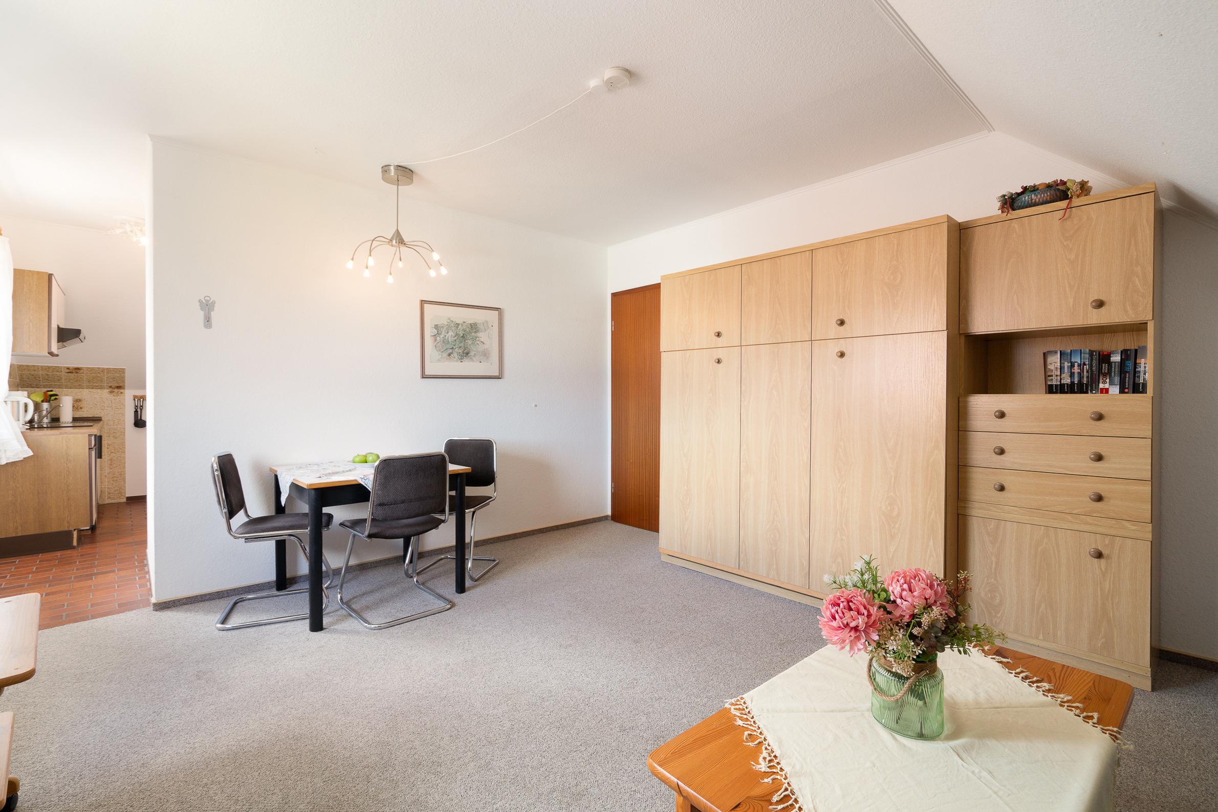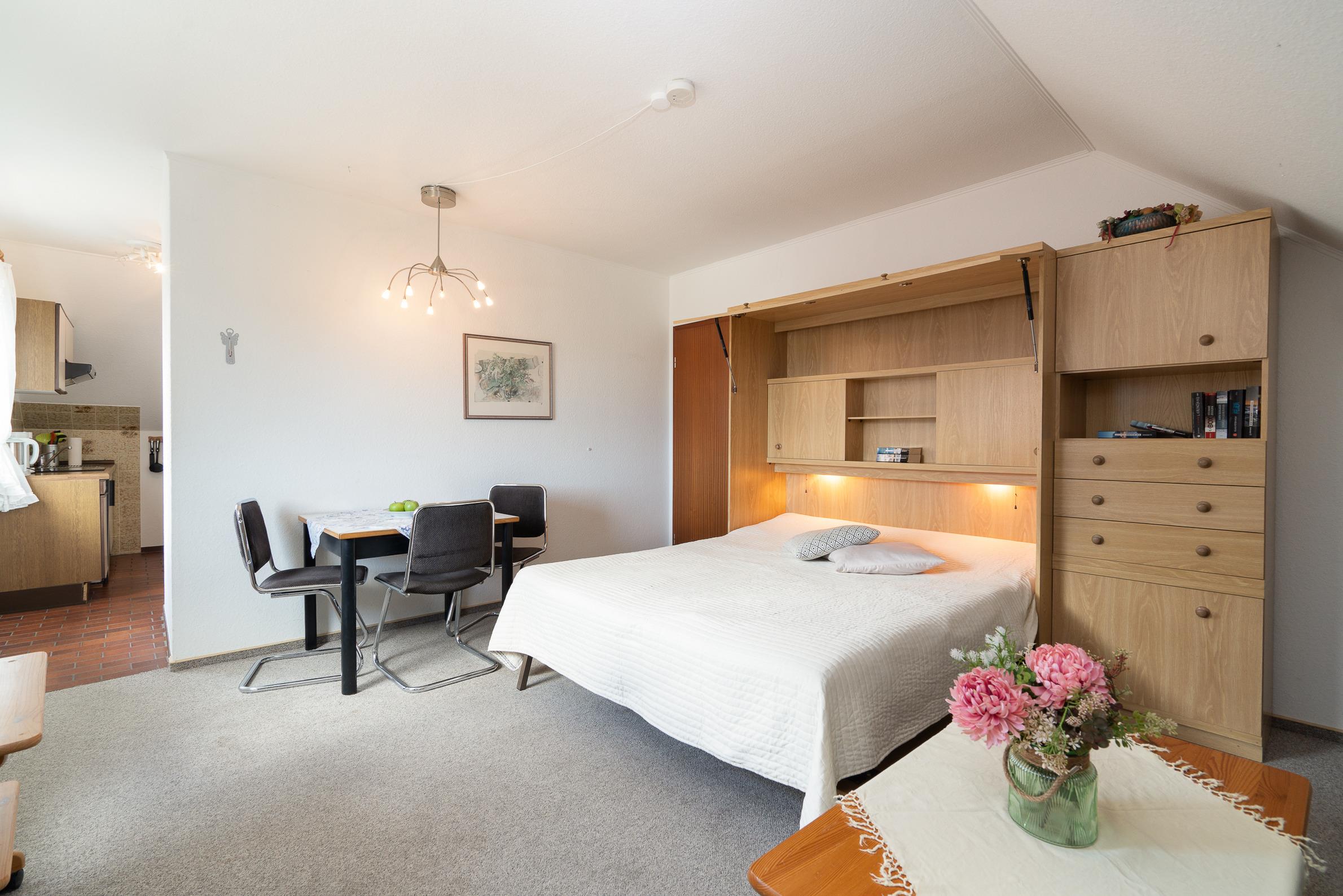 Im 1. Stock eines Einfamilienhauses gelegen bietet diese Ferienwohnung eine ruhige Atmosphäre für Ihren Urlaub. Die liebevolle Einrichtung zeichnet dieses Feriendomizil aus. Die Wohnung verfügt über einen Wohnraum mit Doppel-Schrankbett, ein Schlafzimmer mit zwei Einzelbetten und einer separaten, sehr gut ausgestatteten Küche. Bitte beachten Sie, dass das separate Schlafzimmer nur über den öffentlichen Hausflur erreichbar ist.