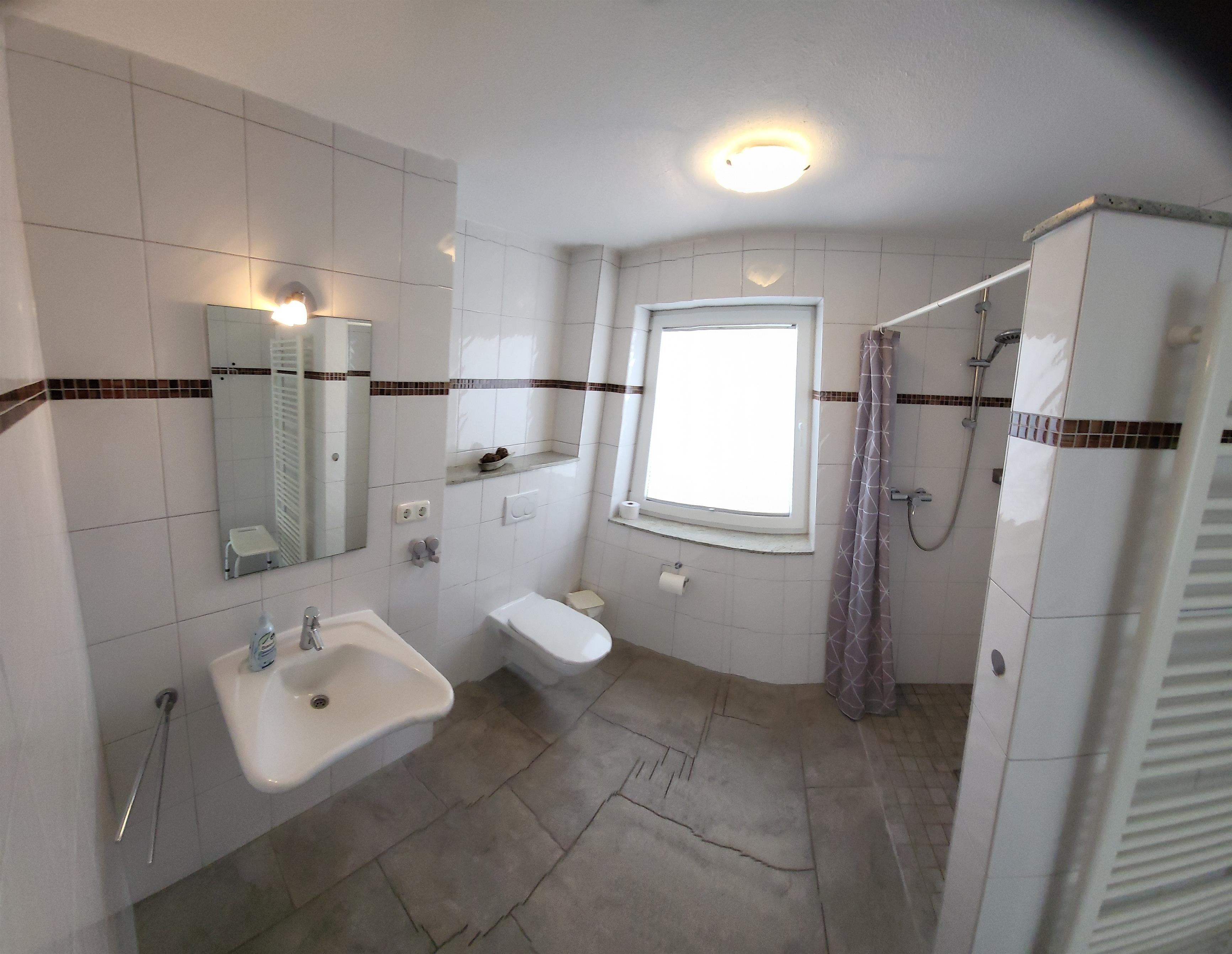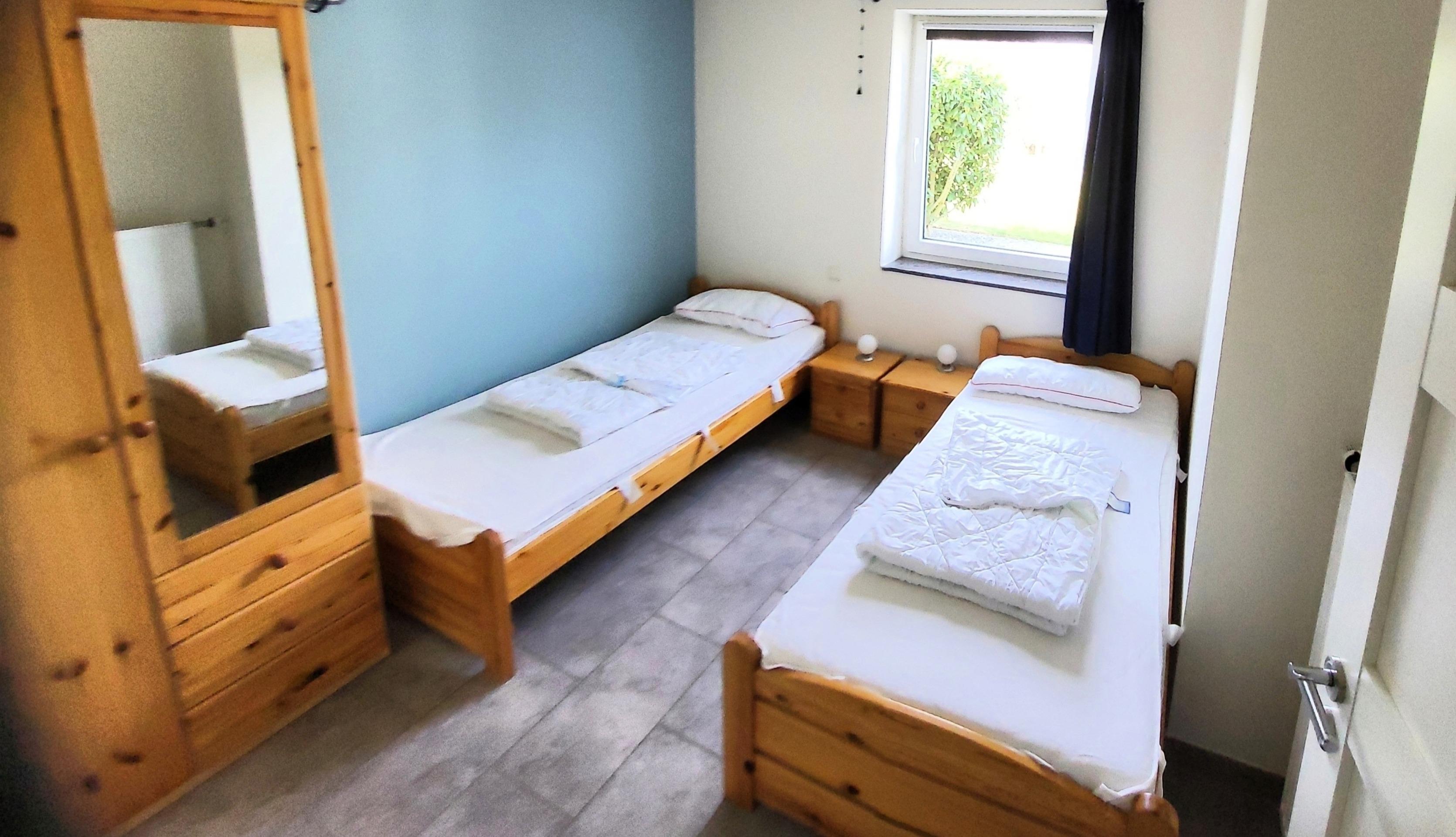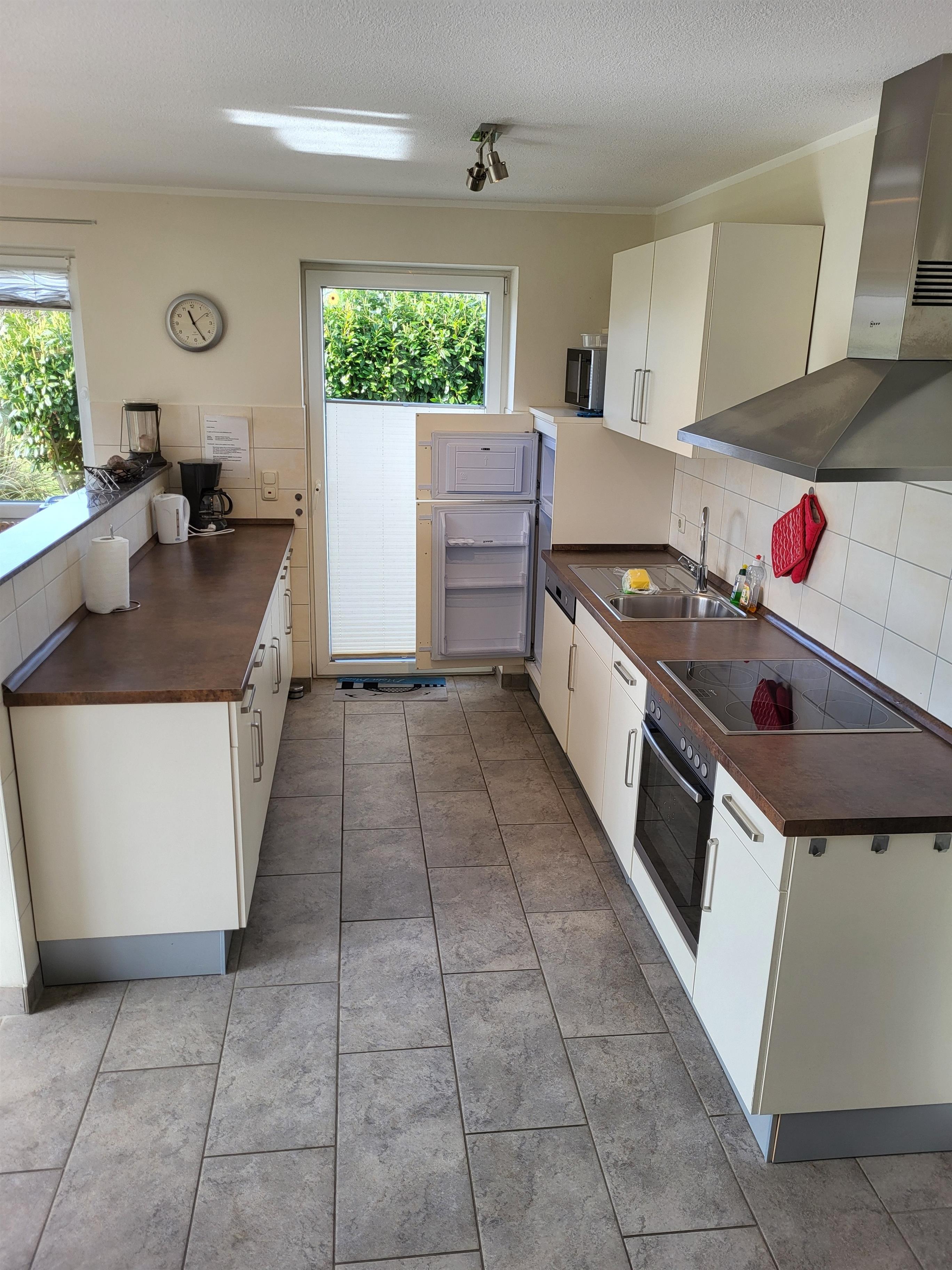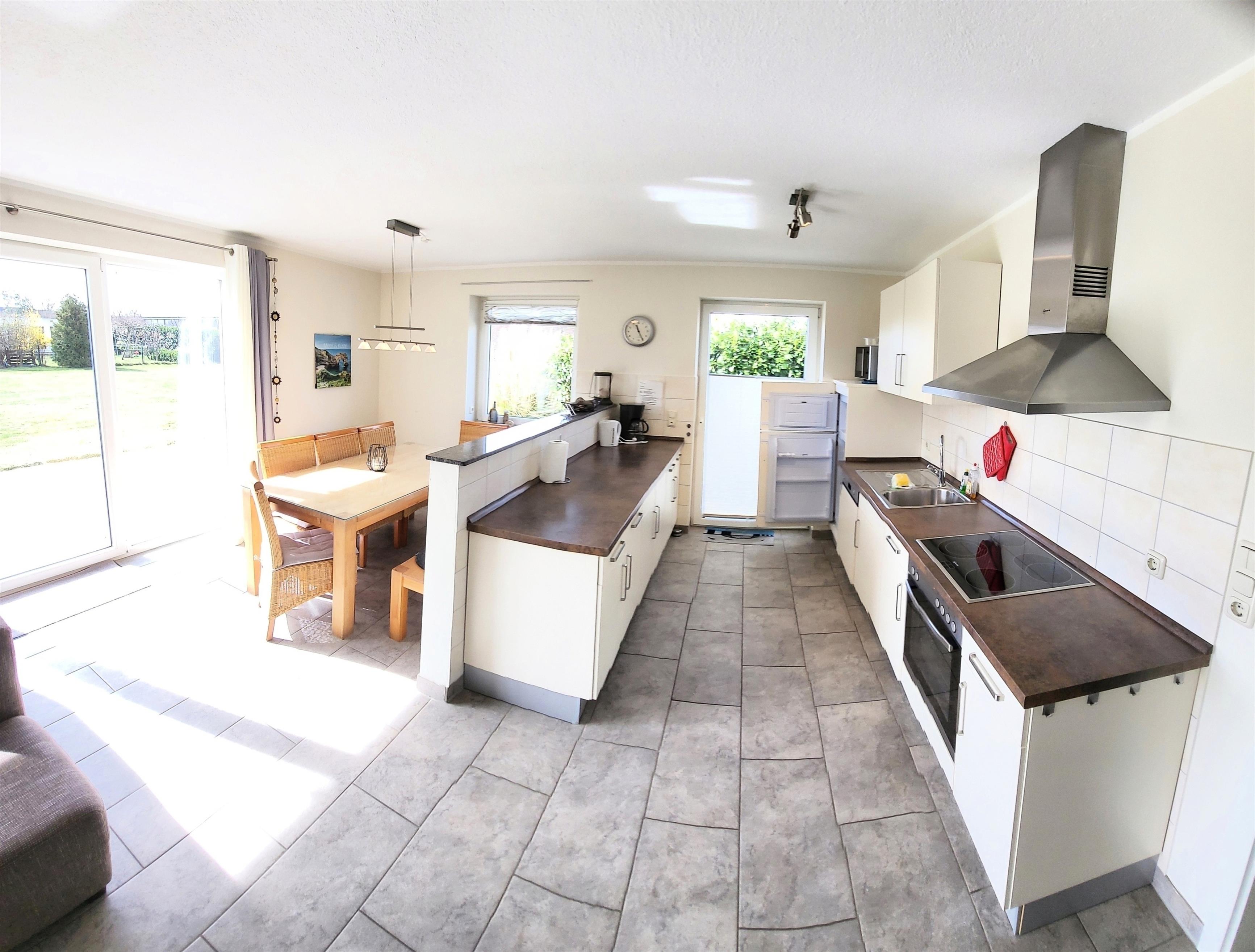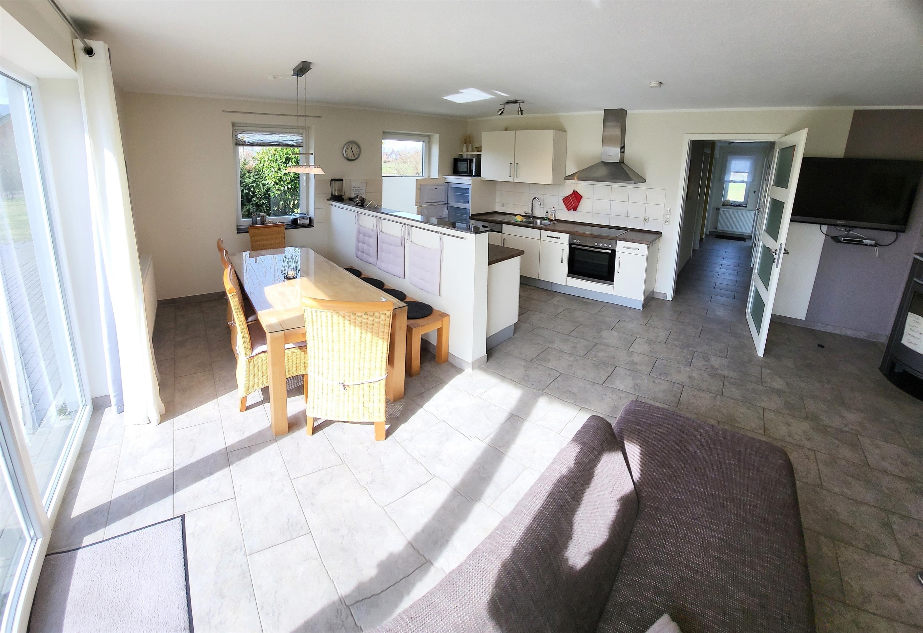 Im Erdgeschoss befindet sich der großzügige Wohn- Essbereich mit komplett eingerichteter Küche inkl. Geschirrspüler, große Essecke für 6 Personen, Ecksofa, SAT-TV, Kaminofen, 1 Schlafraum mit zwei Einzelbetten , 1 Bad mit Dusche (behinderten geeignet).
