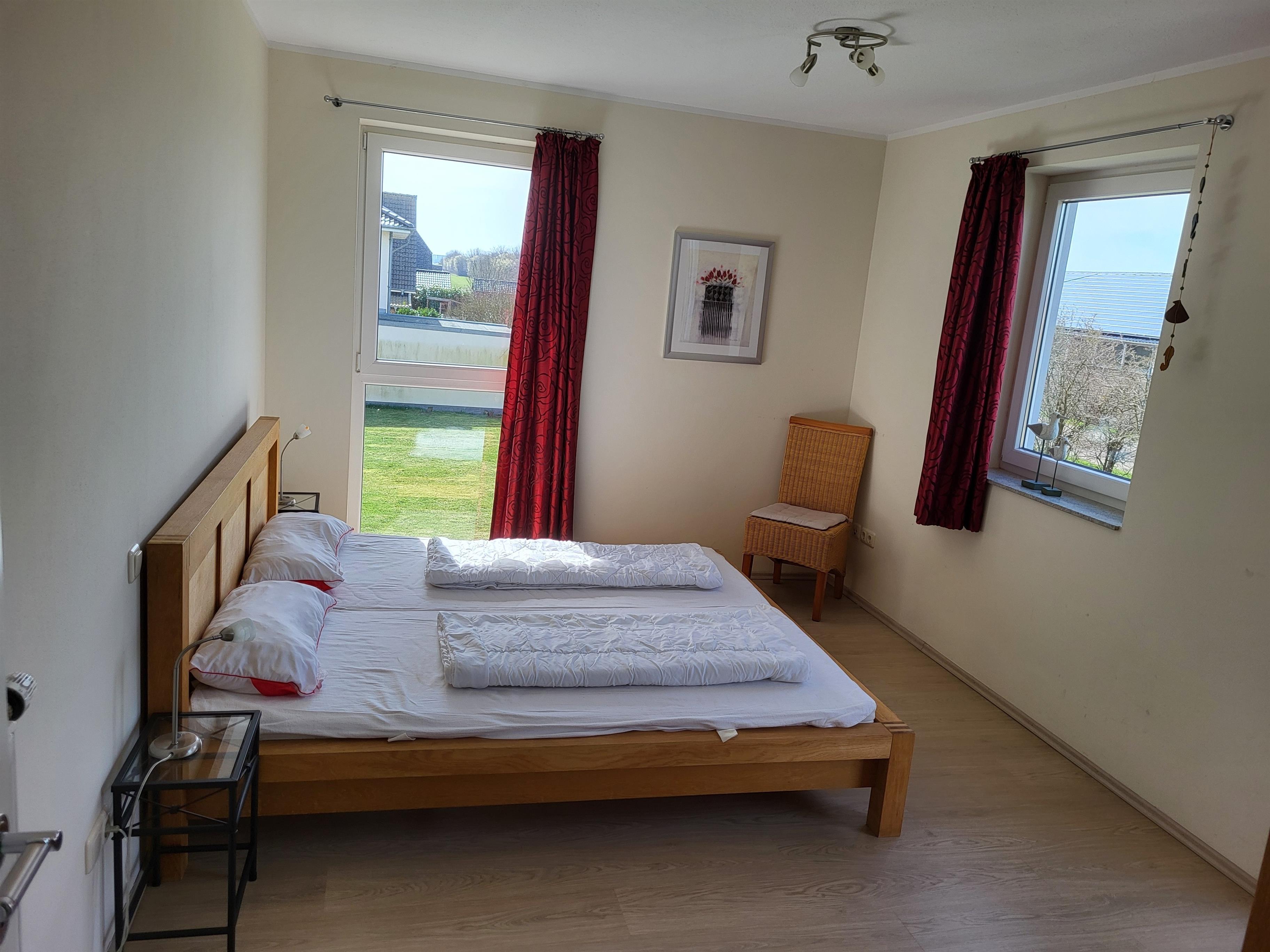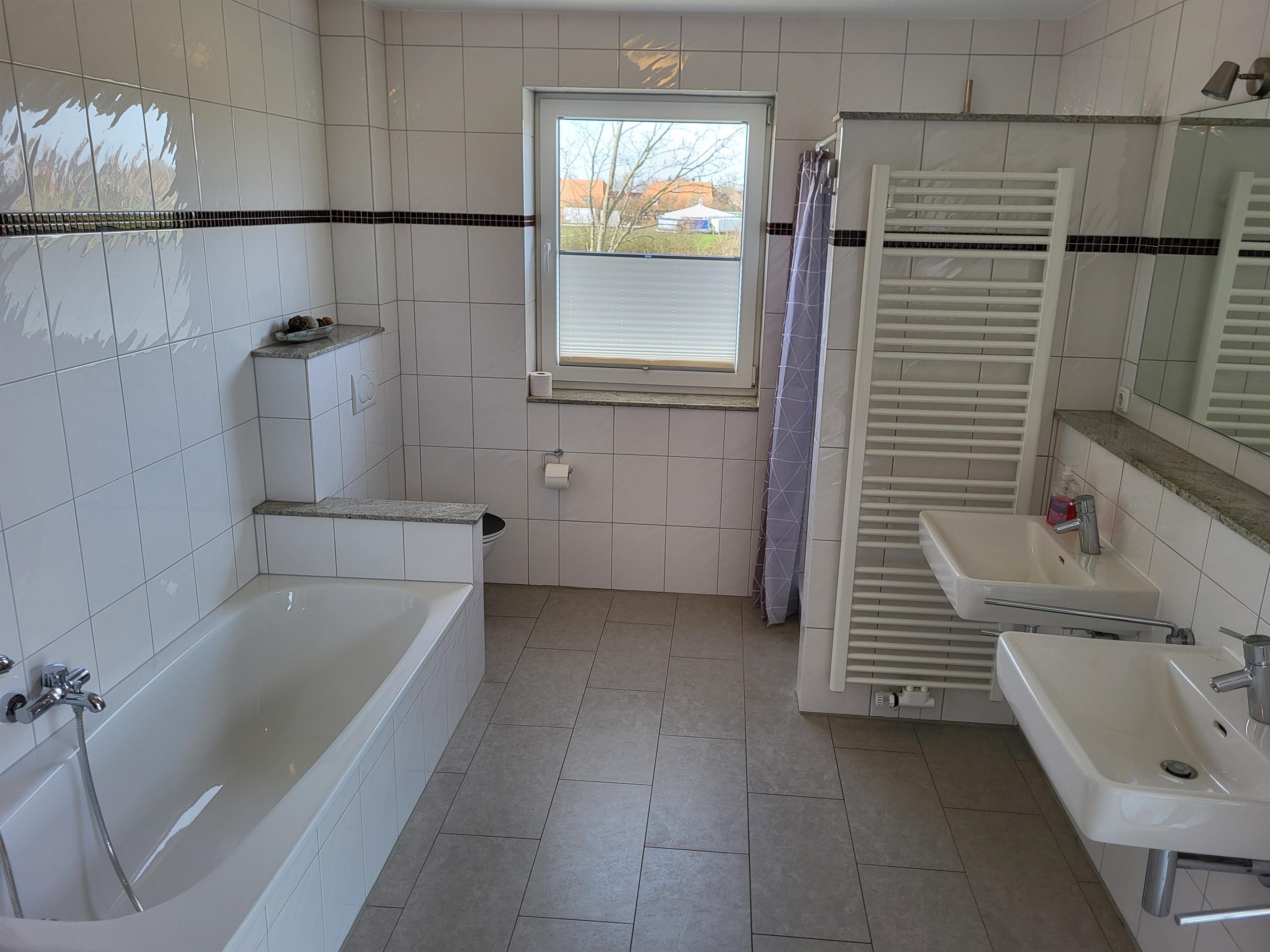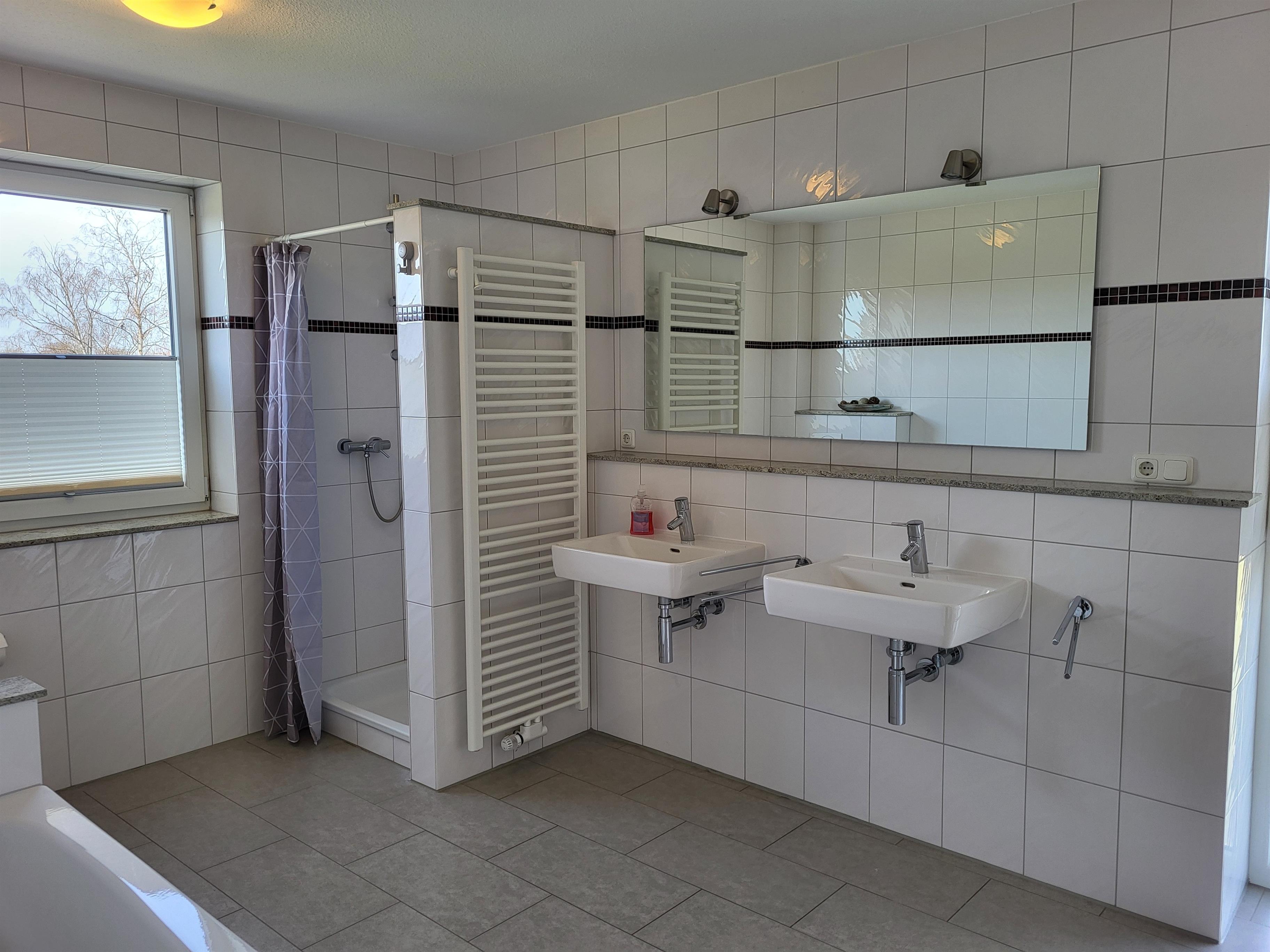 Im Obergeschoss finden sie 2 helle Schlafräume mit Doppelbetten, 1 großes Komfortbad mit Dusche, Badewanne , Doppelwaschbecken und Saunabereich sowie Waschmaschine und Wäschetrockner.