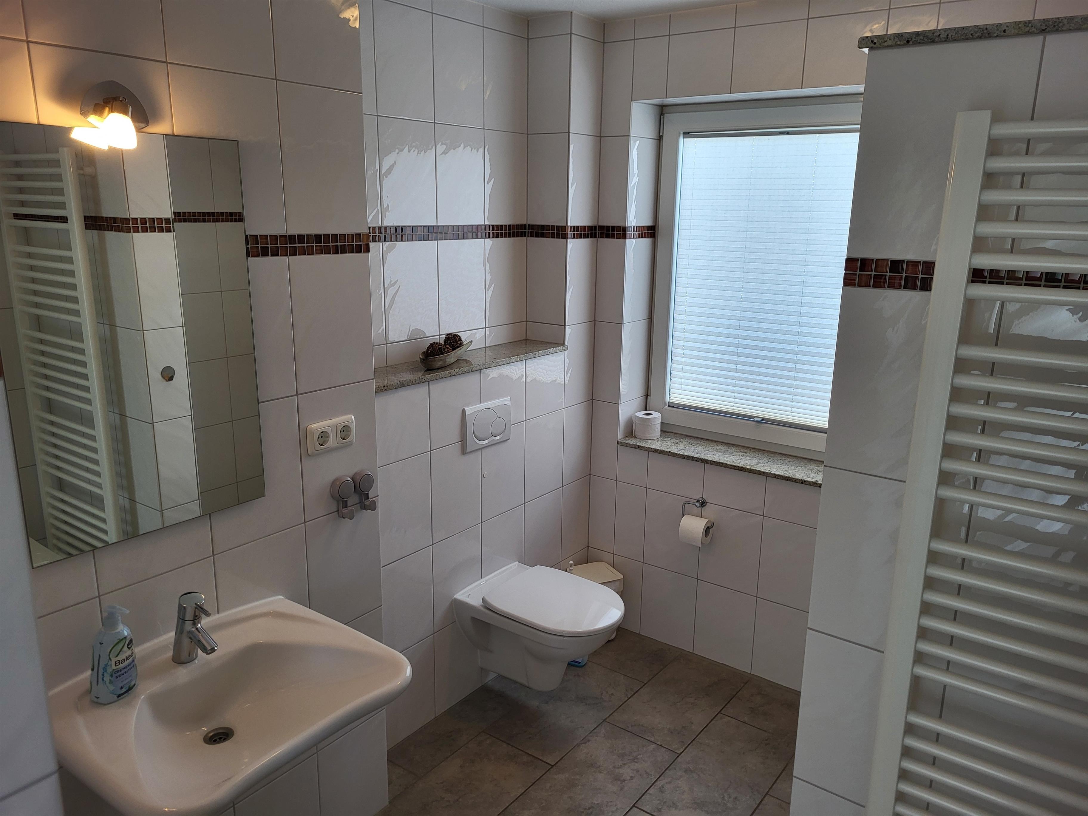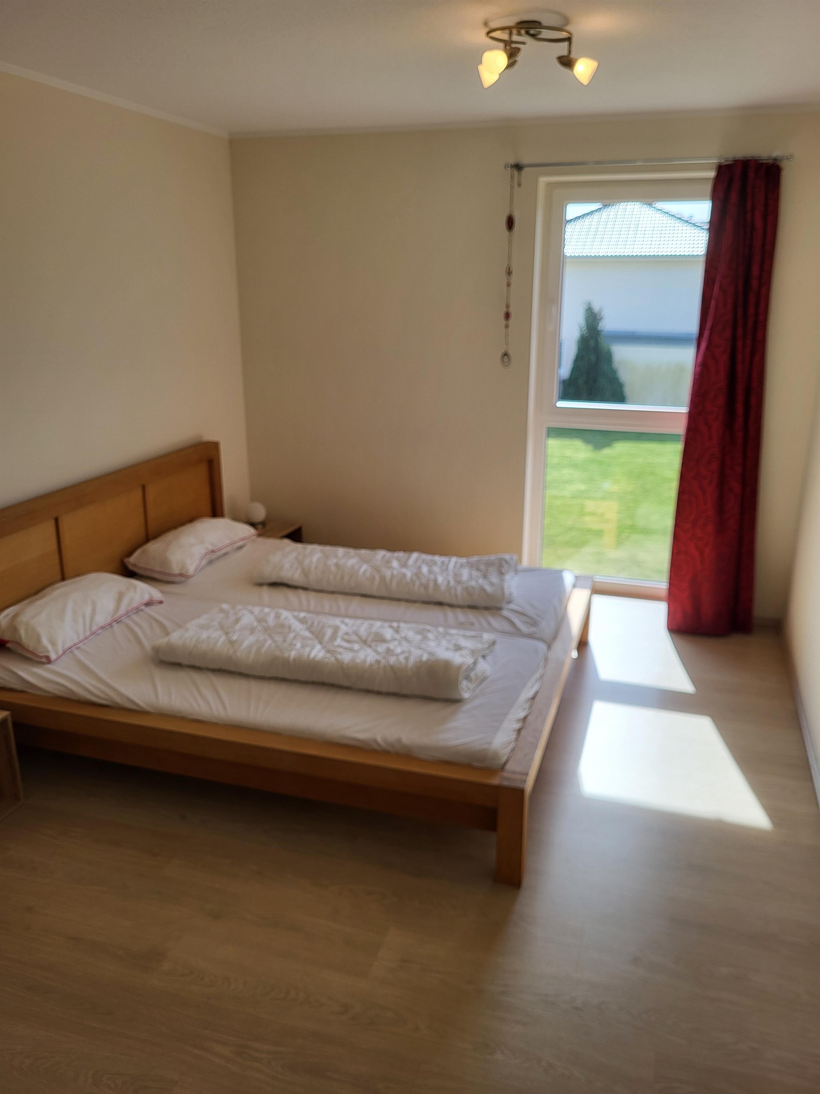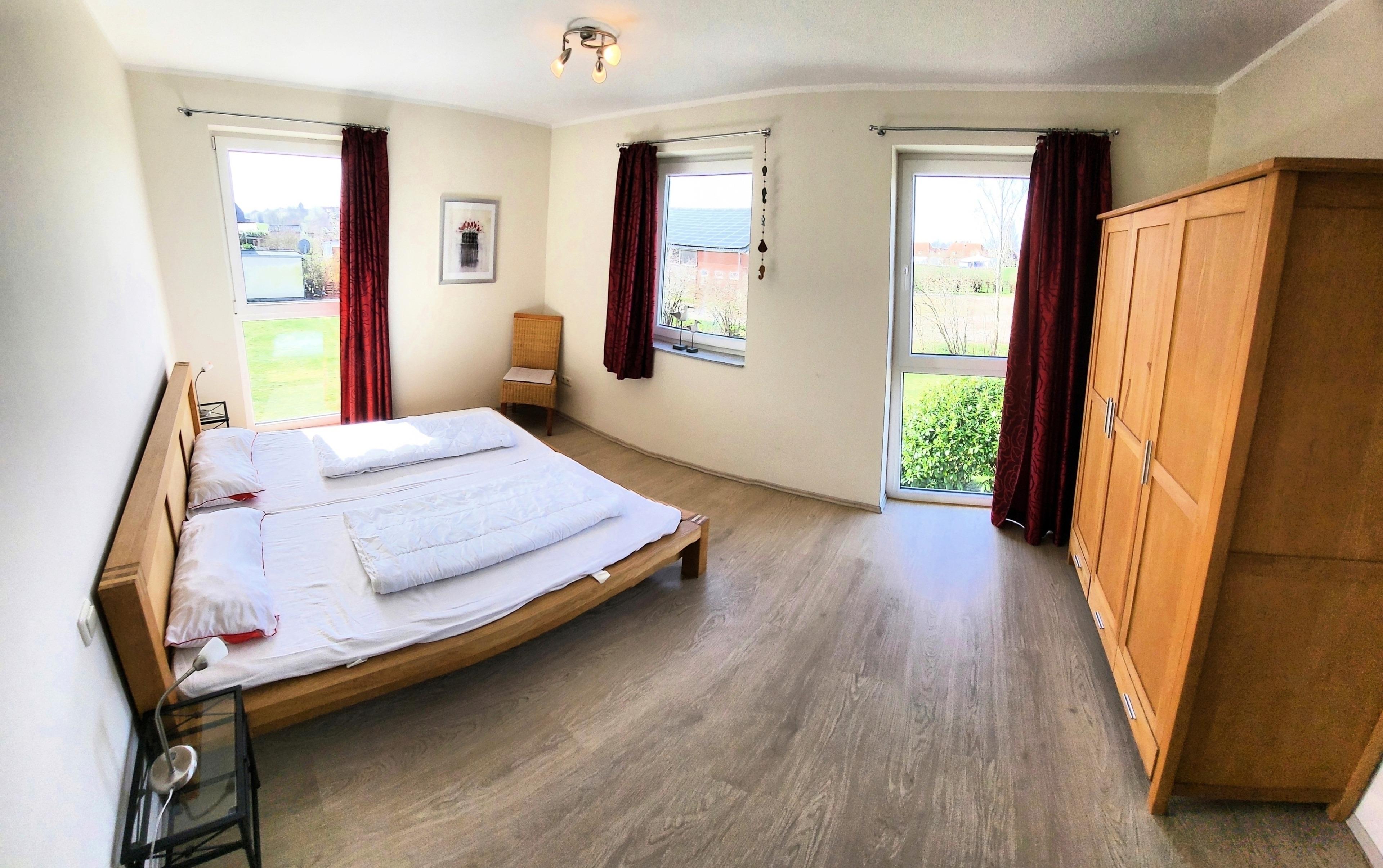 Im Obergeschoss finden sie 2 helle Schlafräume mit Doppelbetten, 1 großes Komfortbad mit Dusche, Badewanne , Doppelwaschbecken und Saunabereich sowie Waschmaschine und Wäschetrockner.