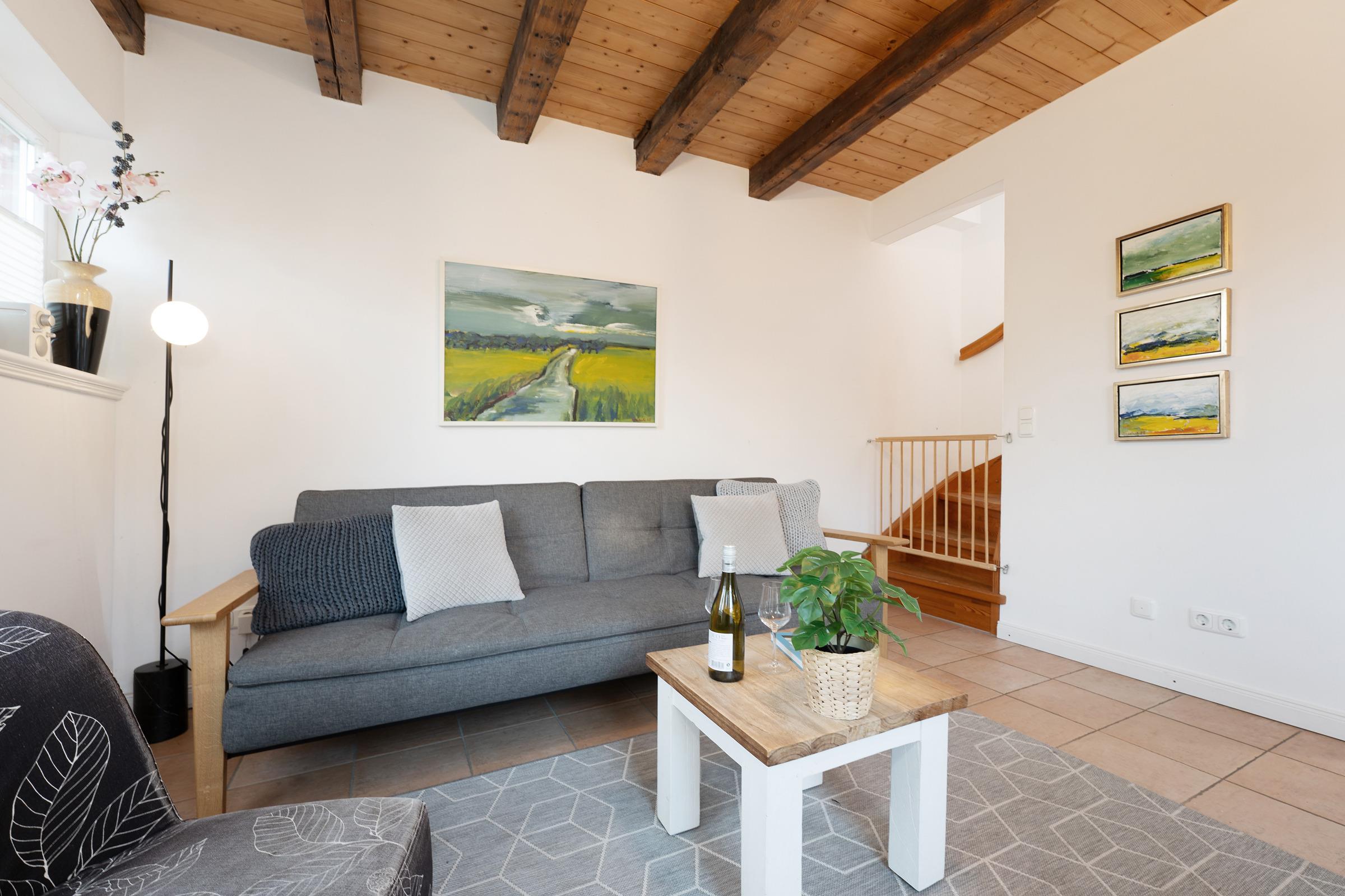 Beim Betreten empfängt Sie der gemütliche Wohnbereich, der mit einem Fernseher und Schlafsofa für entspannte Stunden ausgestattet ist und durch seine freundliche Gestaltung sofort Urlaubsatmosphäre aufkommen lässt. Der angrenzende Essbereich bietet genügend Platz für gemeinsame Mahlzeiten. Von hier aus gelangen Sie auf die Terrasse mit Ost-Ausrichtung, auf der Sie den Tag bei frischer Inselbrise starten können.