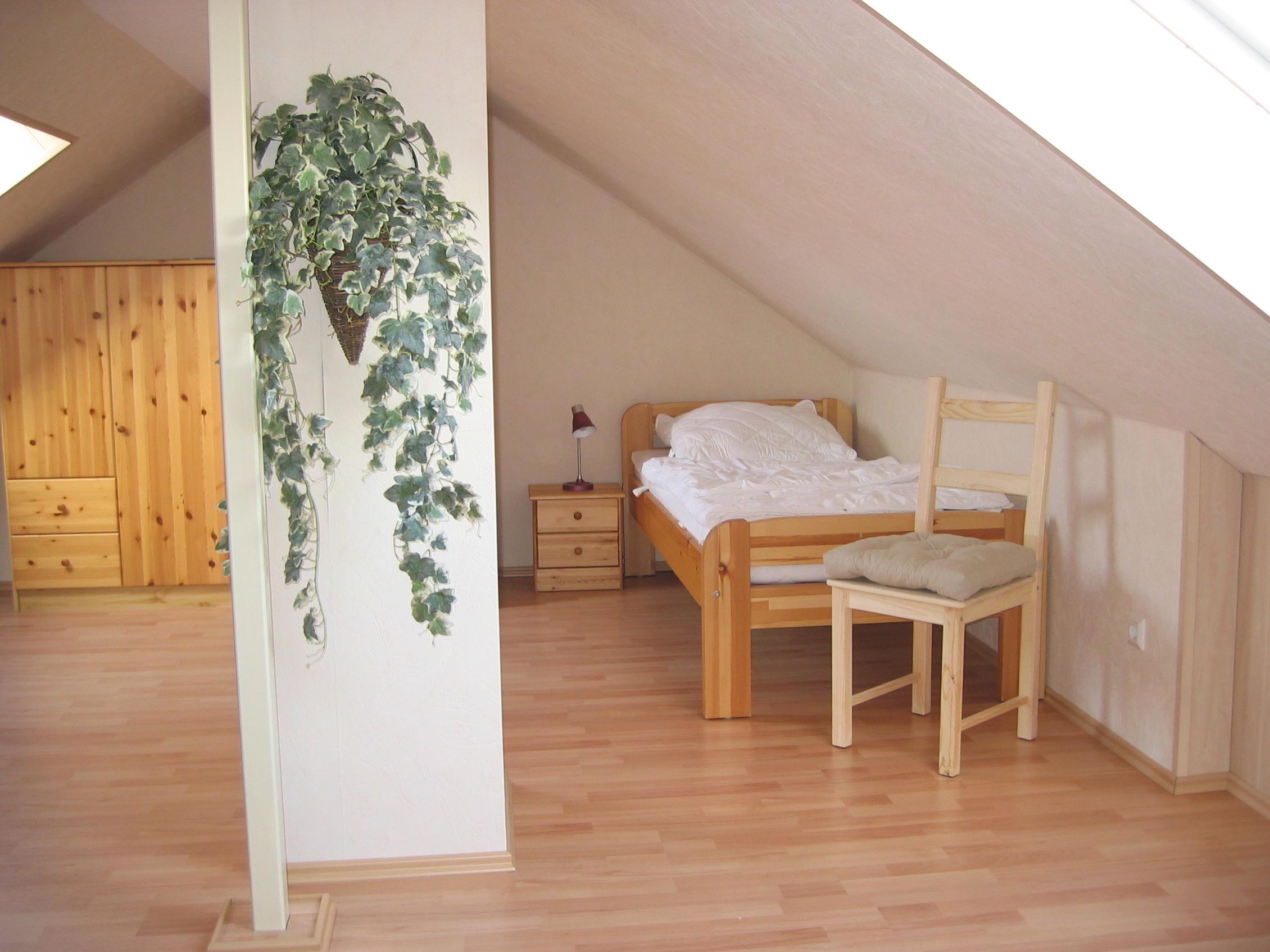 Das Hauptschlafzimmer hat ein extra hohes Ehebett und eine Tür zum Balkon. Auf dem ausgebauten Dachboden mit seinen 20 m² Fläche und 2 Einzelbetten herrschen auch im Sommer angenehme Temperaturen dank 2 Velux Aussenjalousien.