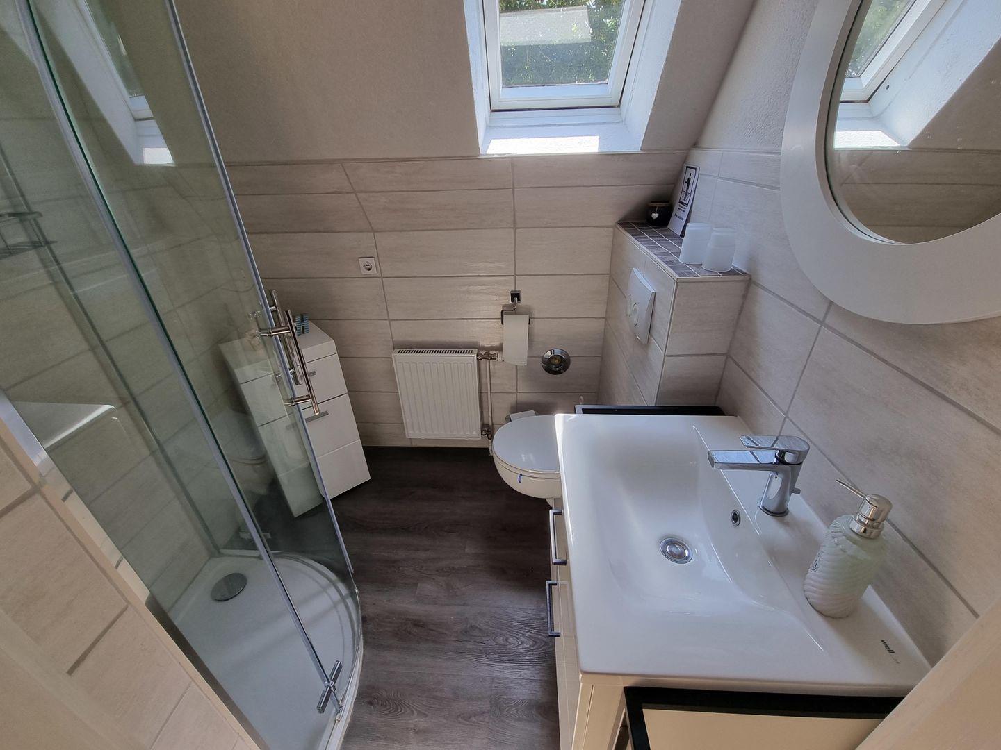 Im Obergeschoss finden Sie drei unterschiedlich eingerichtete Schlafimmer und eines der zwei Bäder. Das Bad im Obergeschoss hat einen Waschtisch , eine Toilette und Dusche mit Rainshower.