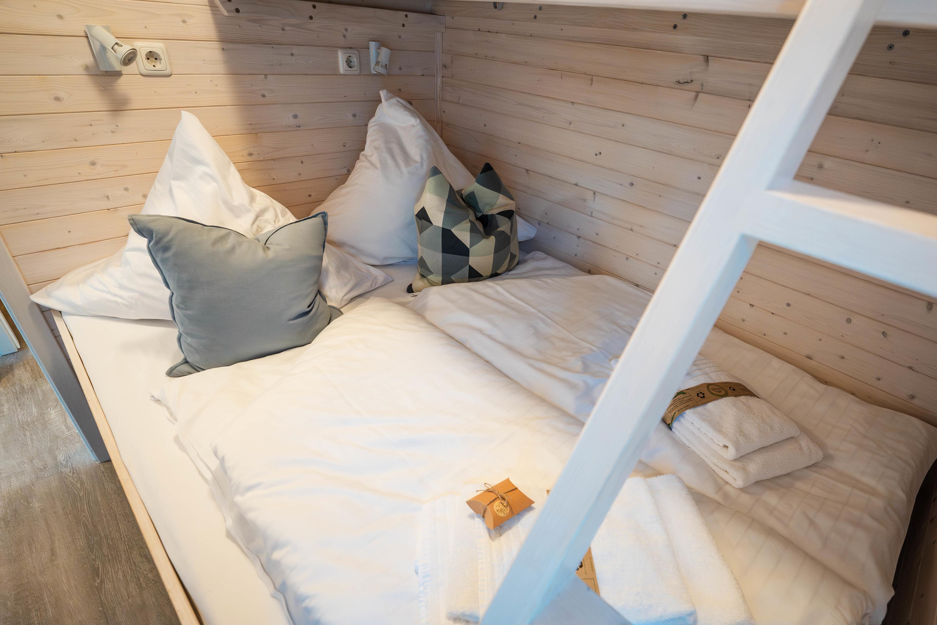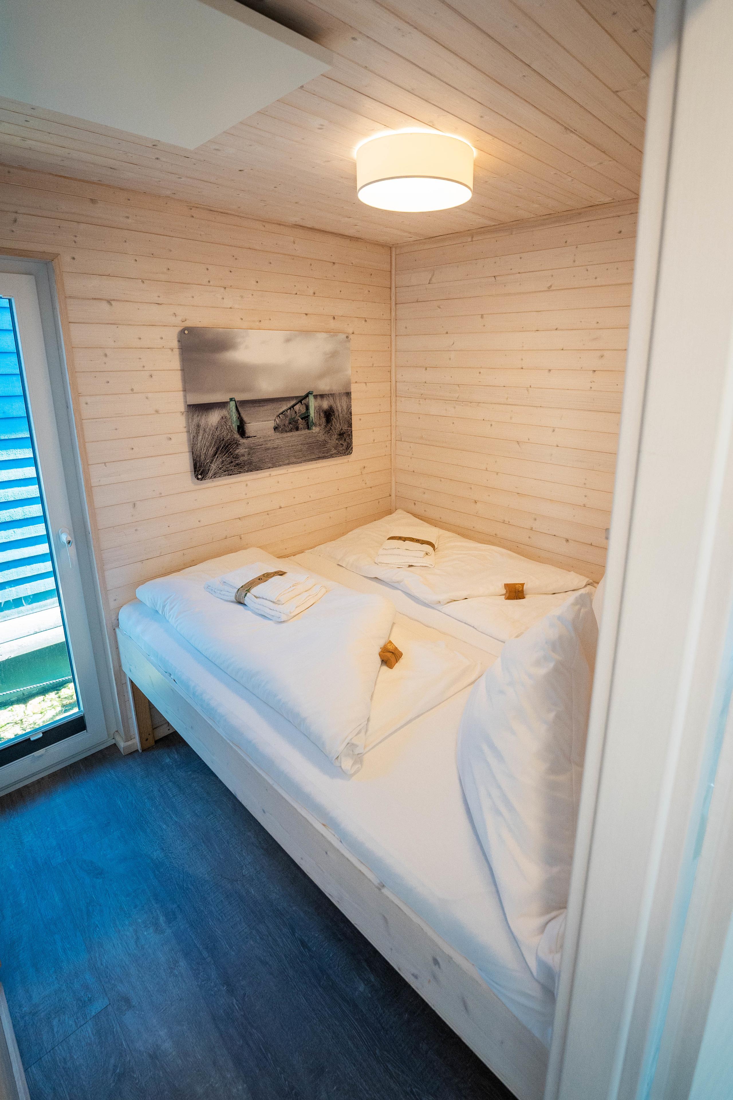 Die beiden Schlafzimmer mit bodentiefen Fenstern verfügen über bequeme Doppelbetten (160×200 und 140×200) sowie ein Hochbett (80×200) im vorderen Schlafraum. Alle Fenster sind mit Plissees (Sichtschutzrollos) ausgestattet,